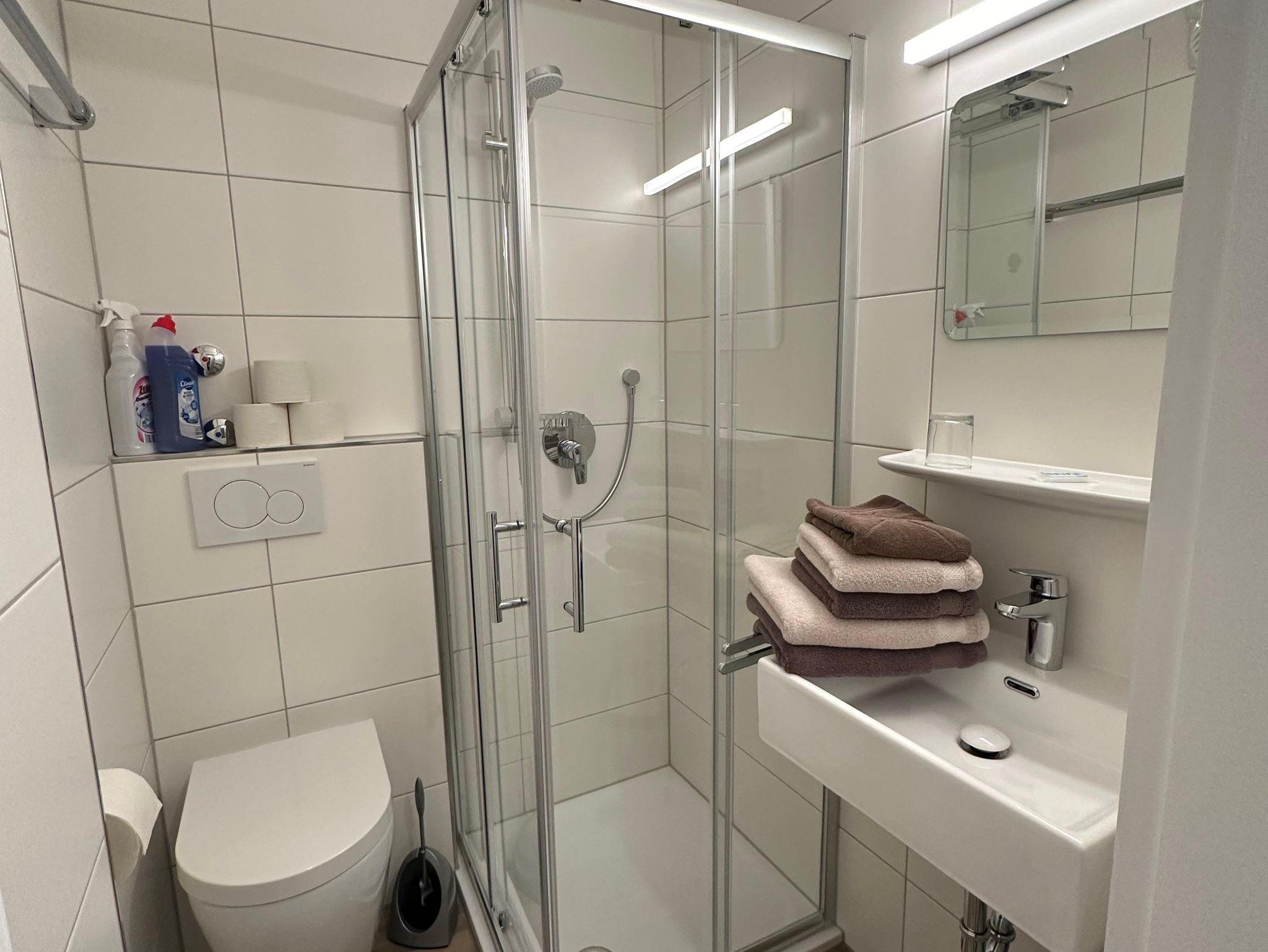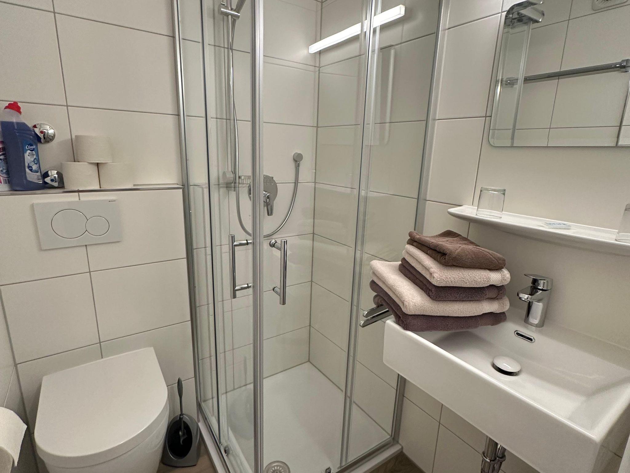 sind vorhanden. Im eigenen Bad finden Sie Dusche/WC und Waschbecken. Die Handtücher werden