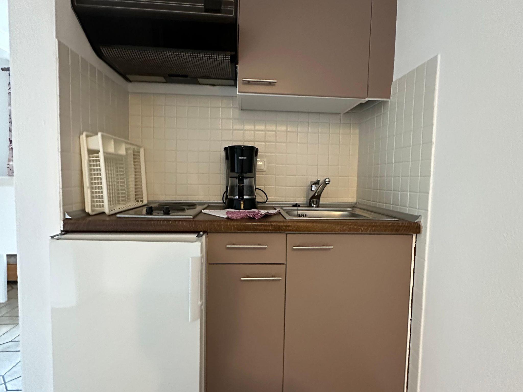 Gefrier-/Kühlkombination, Kaffeemaschine und Spüle. Alle Küchenutensilien für den täglichen Bedarf