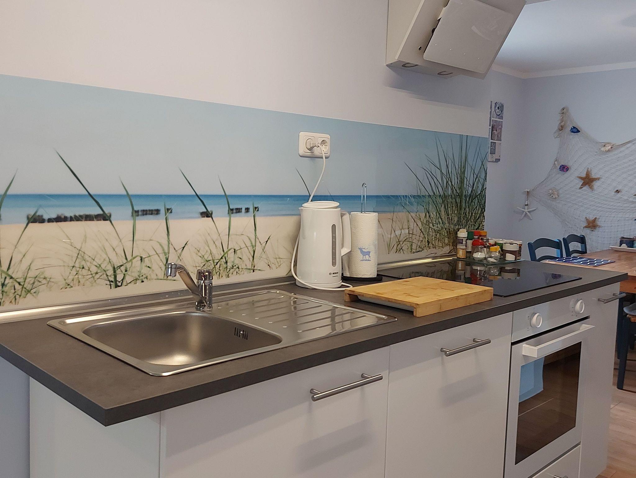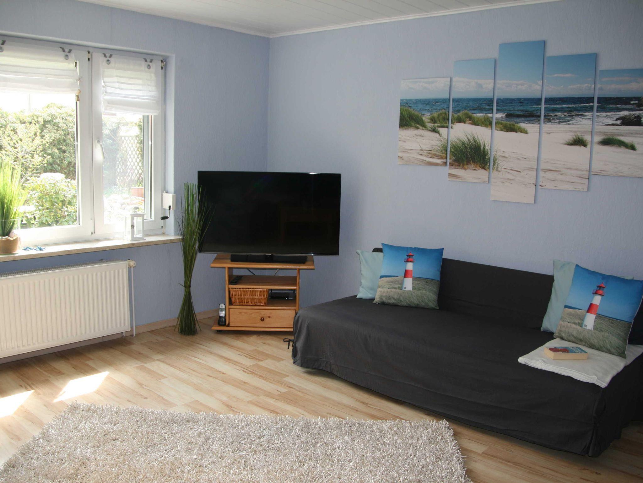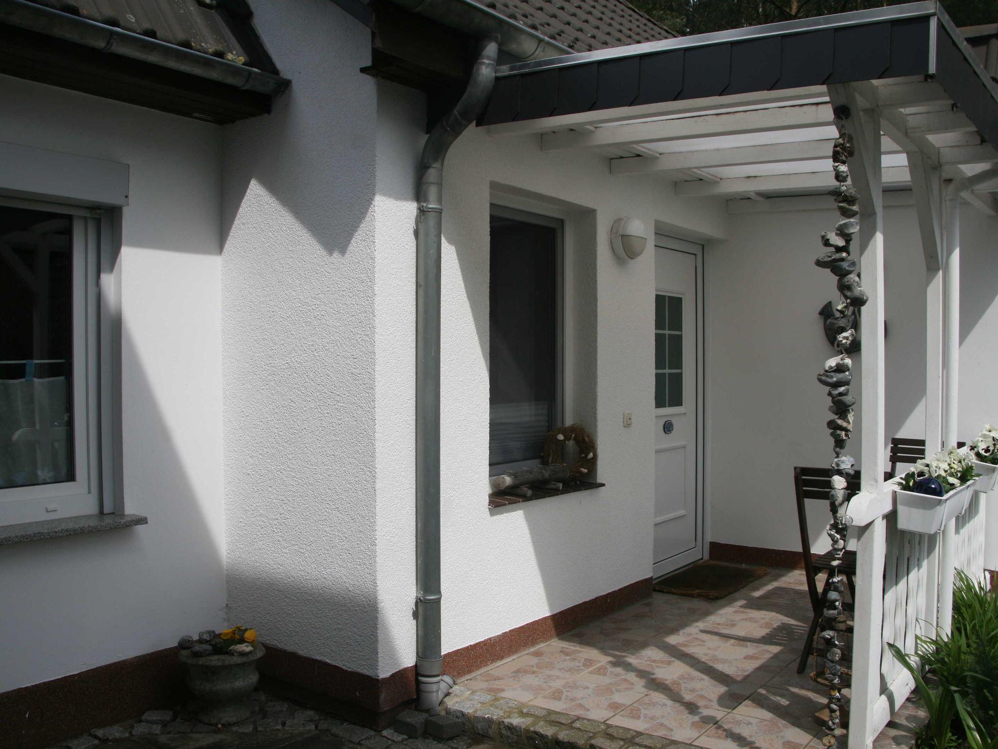 Küche: Ceranfeld-Herd, Geschirrspüler, Backofen, Mikrowelle, Toaster, Kaffeemaschine, Wasserkocher, Kühlschrank mit Gefriermöglichkeit. Wohn/ Schlafraum 1 mit Schlafcouch (1.80m x 1,80m), Flachbild-Sat-TV und Doppelschlafliege (1.40m). Schlafraum 2 (Doppelbett 1.80m, Babybett stellbar). Duschbad/WC. Laminat- und Fliesenböden. Ebenerdig, keine Stufen, keine Schwellen, breite Türen (68-86 cm Türbreite). Nichtraucherhaus. Insektenschutzgitter und Fensterrolläden. Unterstellplatz für Fahrräder und Motorräder auf dem Hof, PKW-Stellplatz am Haus.