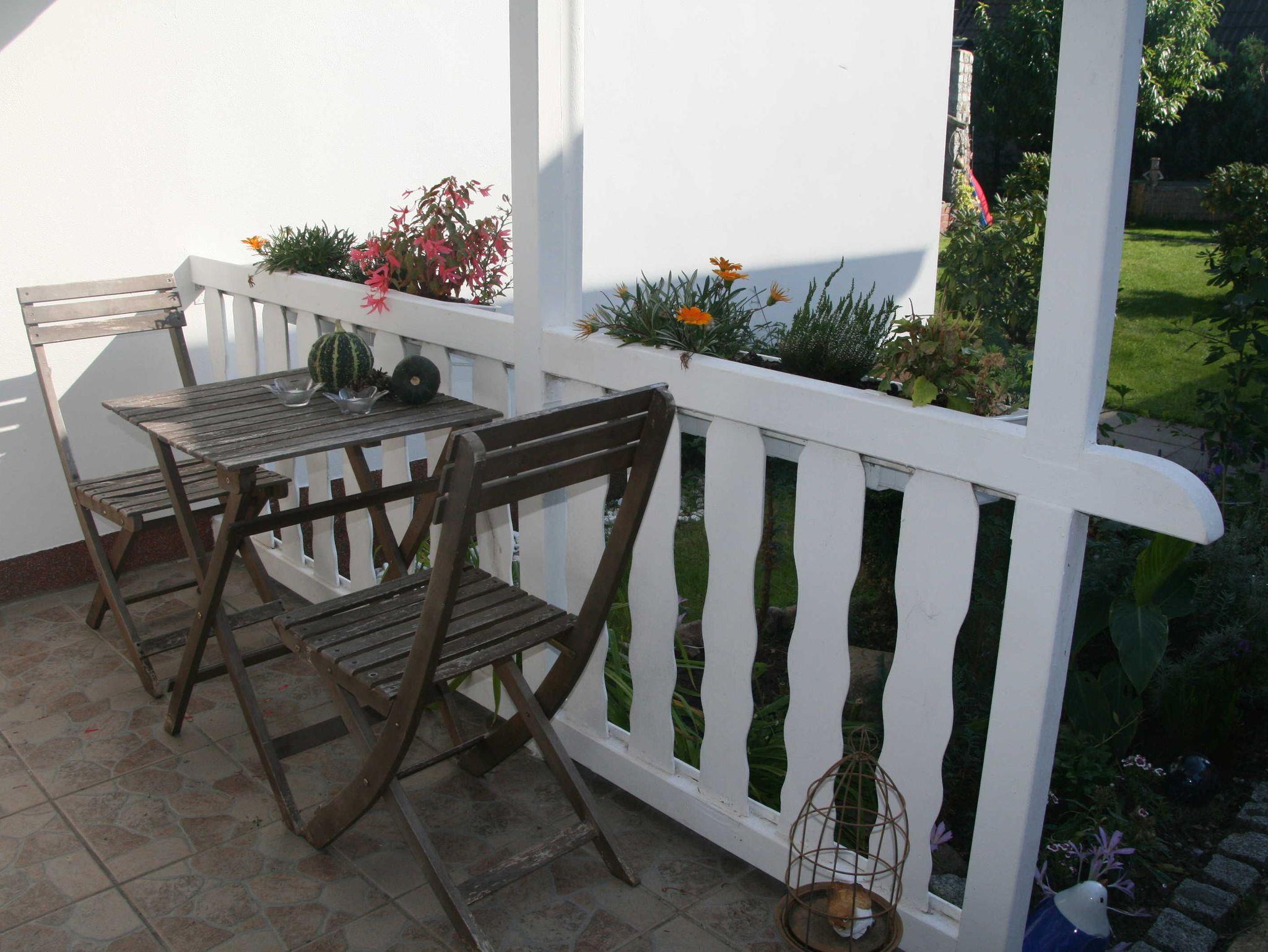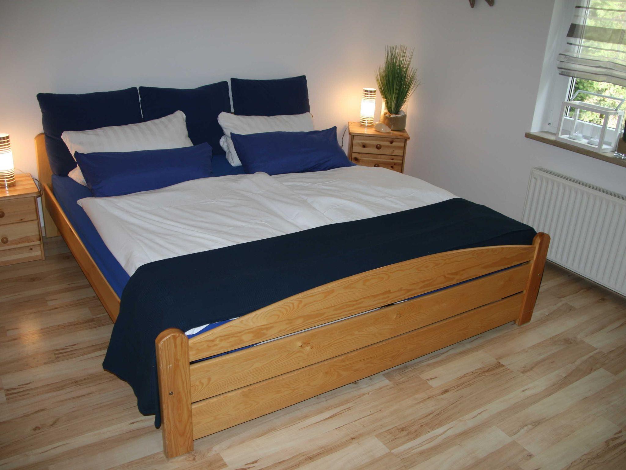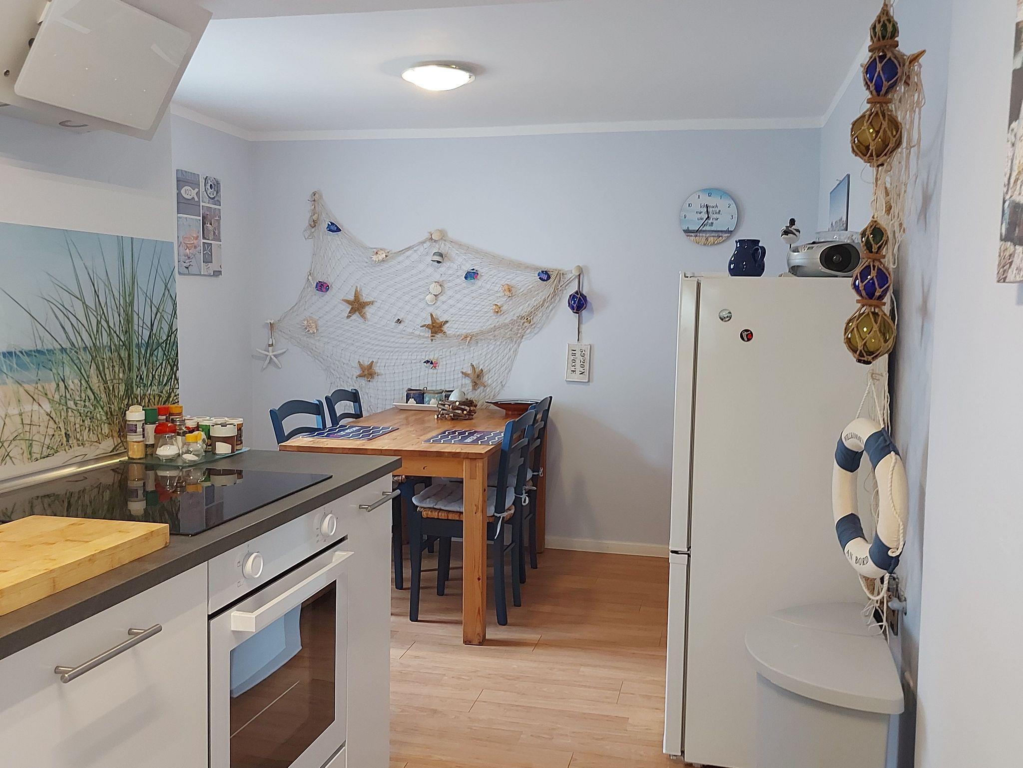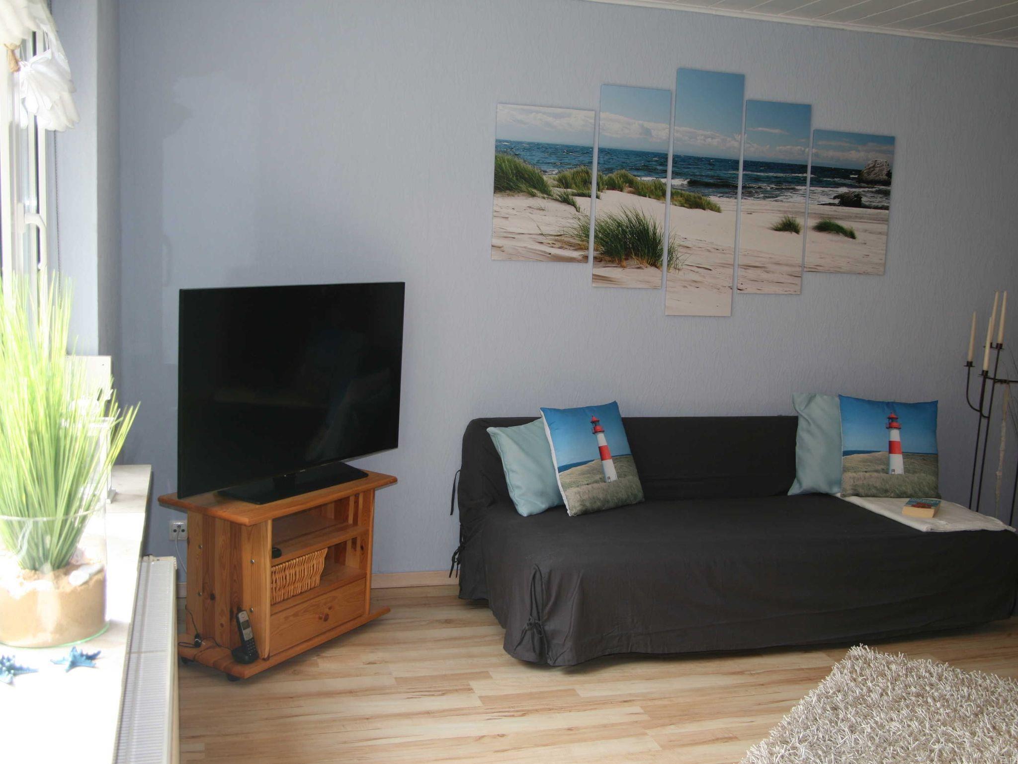 Küche: Ceranfeld-Herd, Geschirrspüler, Backofen, Mikrowelle, Toaster, Kaffeemaschine, Wasserkocher, Kühlschrank mit Gefriermöglichkeit. Wohn/ Schlafraum 1 mit Schlafcouch (1.80m x 1,80m), Flachbild-Sat-TV und Doppelschlafliege (1.40m). Schlafraum 2 (Doppelbett 1.80m, Babybett stellbar). Duschbad/WC. Laminat- und Fliesenböden. Ebenerdig, keine Stufen, keine Schwellen, breite Türen (68-86 cm Türbreite). Nichtraucherhaus. Insektenschutzgitter und Fensterrolläden. Unterstellplatz für Fahrräder und Motorräder auf dem Hof, PKW-Stellplatz am Haus.