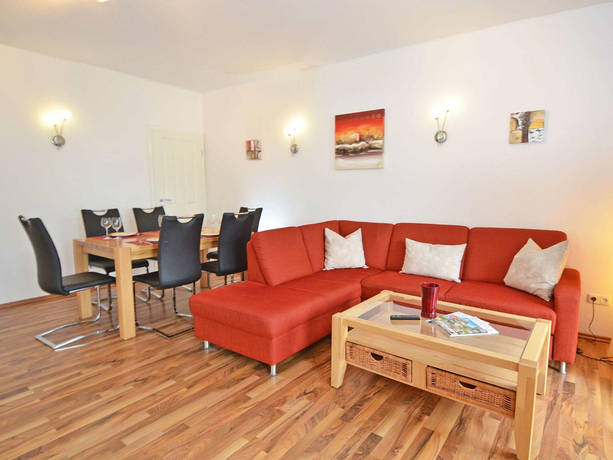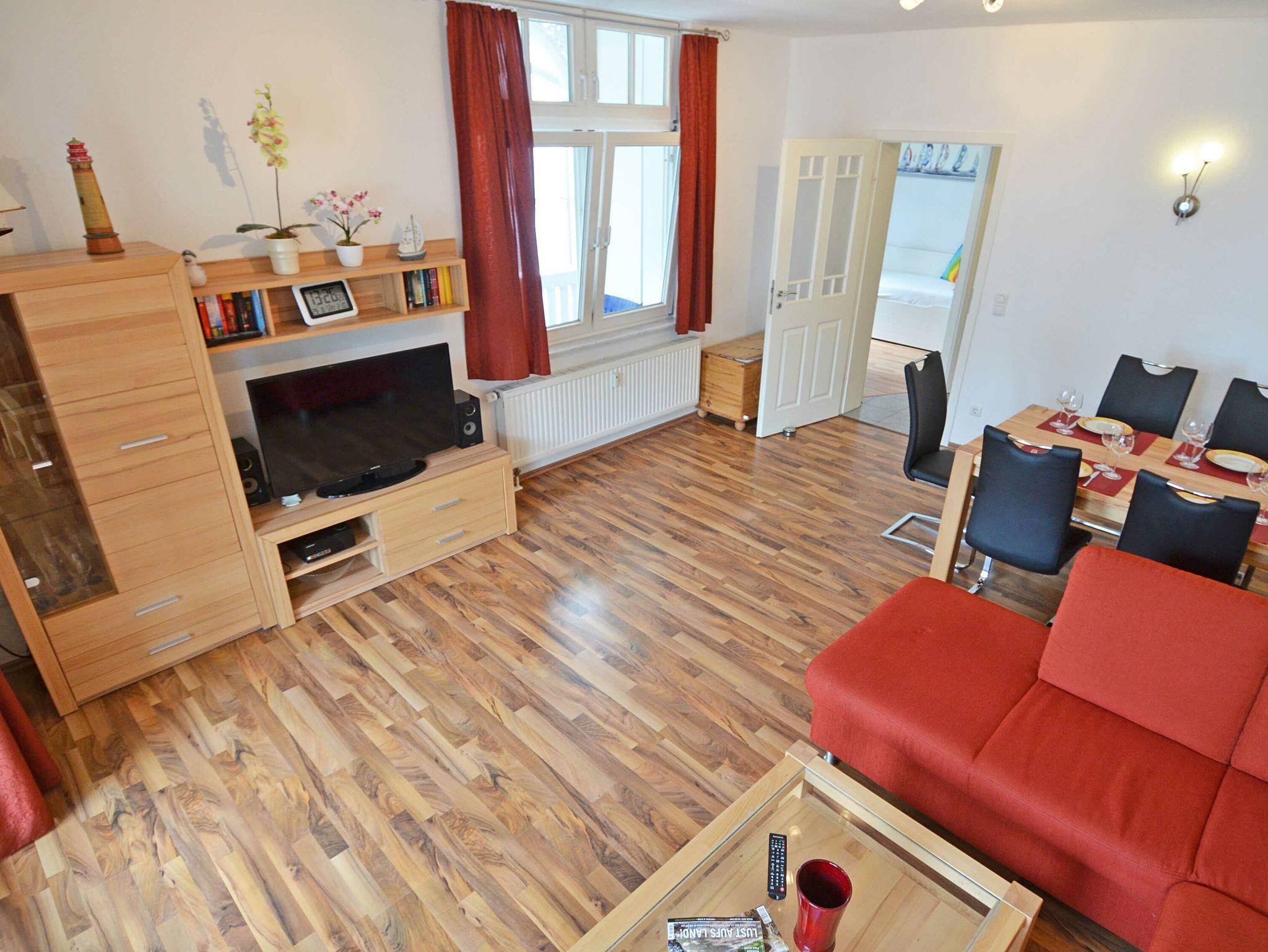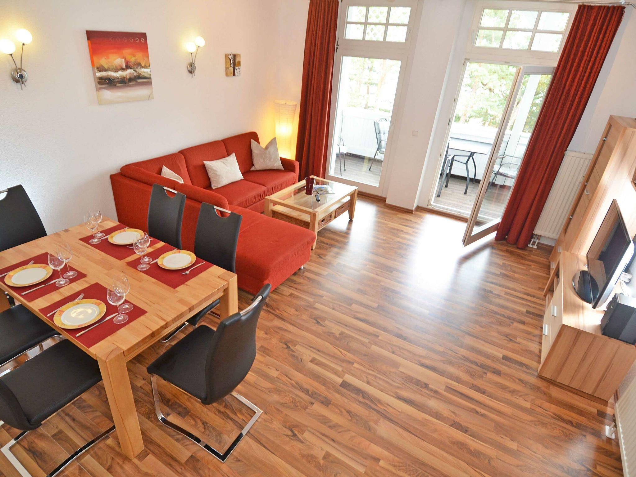 Der helle und modern eingerichtete Wohnraum verfügt über einen großen Esstisch für 6 Personen, eine bequeme Schlafcouch sowie eine Schrankwand mit beleuchteter Vitrine, LCD-TV und Radio/CD/DVD-Player. Bücher und diverse Spiele für Jung [&] Alt lassen keine Langeweile aufkommen. Vom Wohnraum aus gelangen Sie auf einen großen Balkon, der einen spektakulären Blick auf die Ostsee, die Seebrücke und die Binzer Strandpromenade bietet.