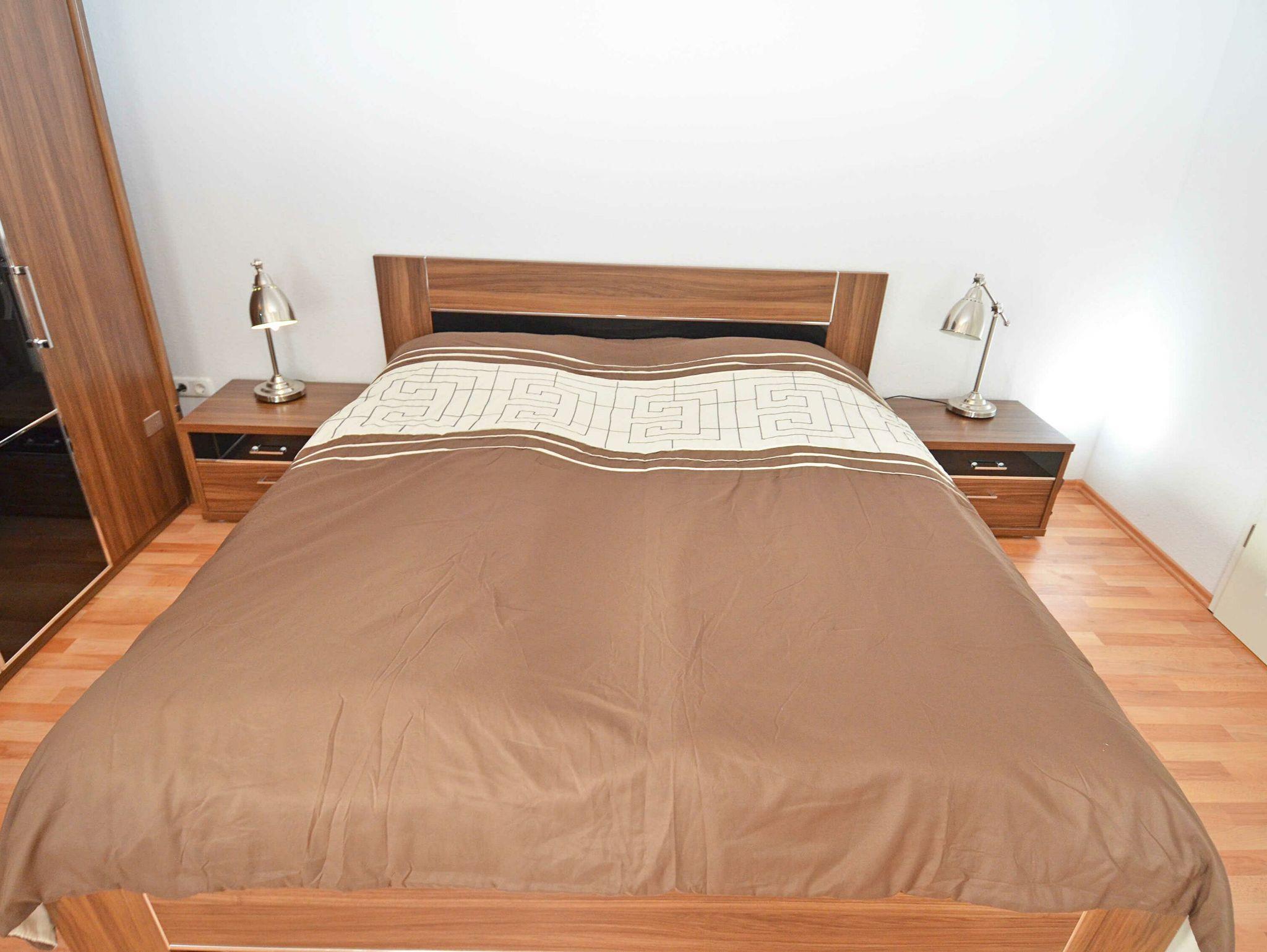 Das Appartement verfügt über zwei unterschiedlich große, freundliche Schlafzimmer. Das größere Schlafzimmer ist mit einem bequemen Doppelbett (180 x 200 cm), zwei Nachtkommoden, einem viertürigen Kleiderschrank sowie einer Kommode ausgestattet. Ein gemütliches 3er-Sofa mit Récamiere sowie ein großer Flachbild-TV vervollständigen die Einrichtung. Vom Schlafzimmer aus haben Sie direkten Zugang zu einem der drei Balkone.