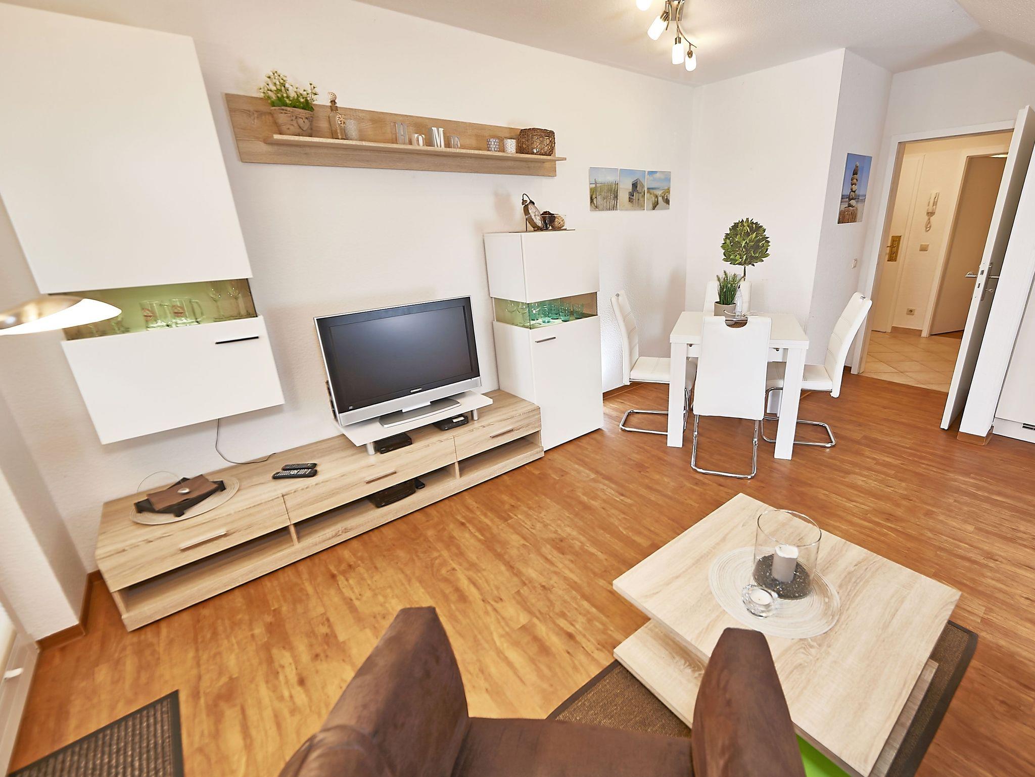 Im Wohnbereich befinden sich u.a. ein komfortables Sofa (Aufbettungsmöglichkeit für zwei Personen), ein Flachbild-TV mit Kabelanschluss und eine Stereoanlage mit Radio, CD-/DVD-Player. W-LAN ist kostenfrei verfügbar.