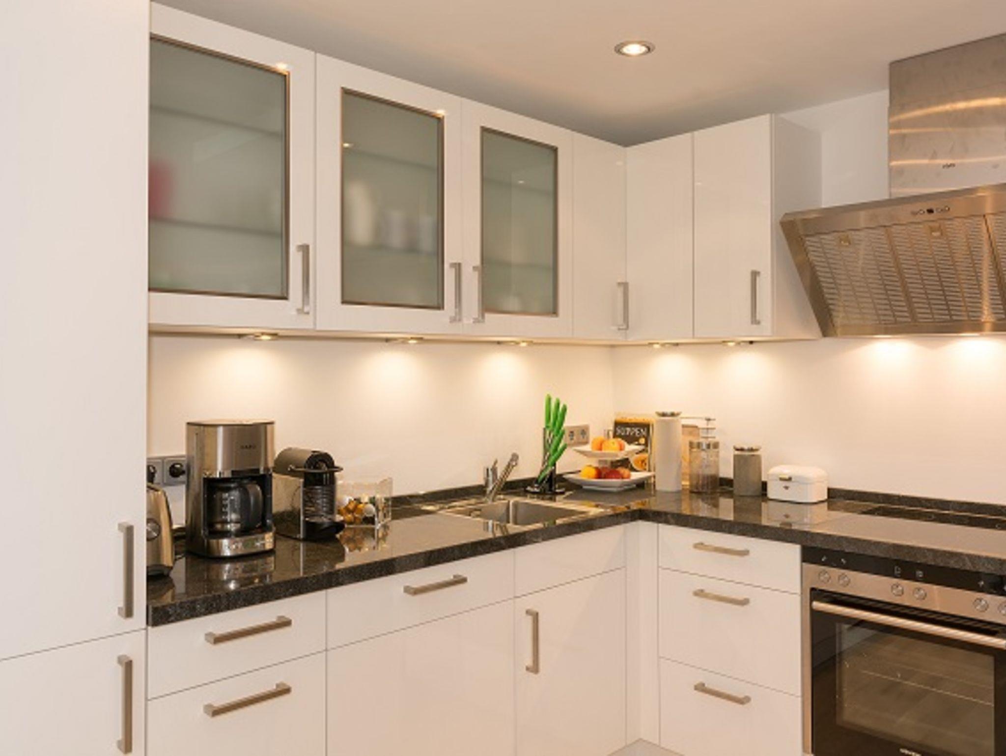 Über einen großzügigen Flurbereich erreicht man das Wohnzimmer der fast 98 m² großen Wohnung, mit offener hochwertiger und moderner Küche -Cerankochfeld, Backofen, Kühlschrank, Gefrierschrank, geräuscharmer Geschirrspüler, Kaffeemaschine, Toaster, Wasserkocher, Nespressoautomat und vieles mehr.