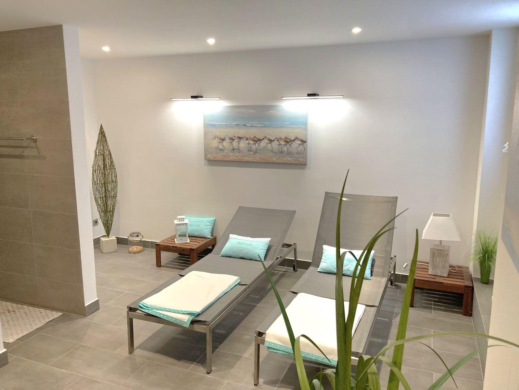 Im Erdgeschoss des Hauses befindet sich eine im Jahr 2025 aufwendig neu gestaltete Sauna, die höchsten Ansprüchen genügt und von unseren Gästen unentgeltlich genutzt werden kann.