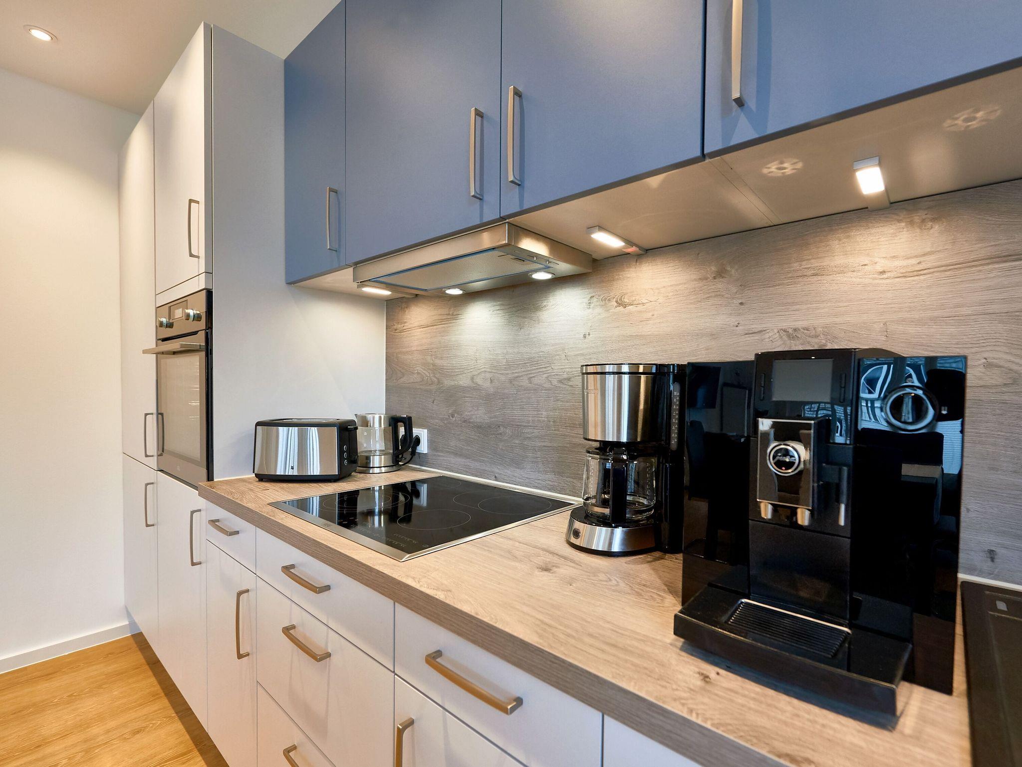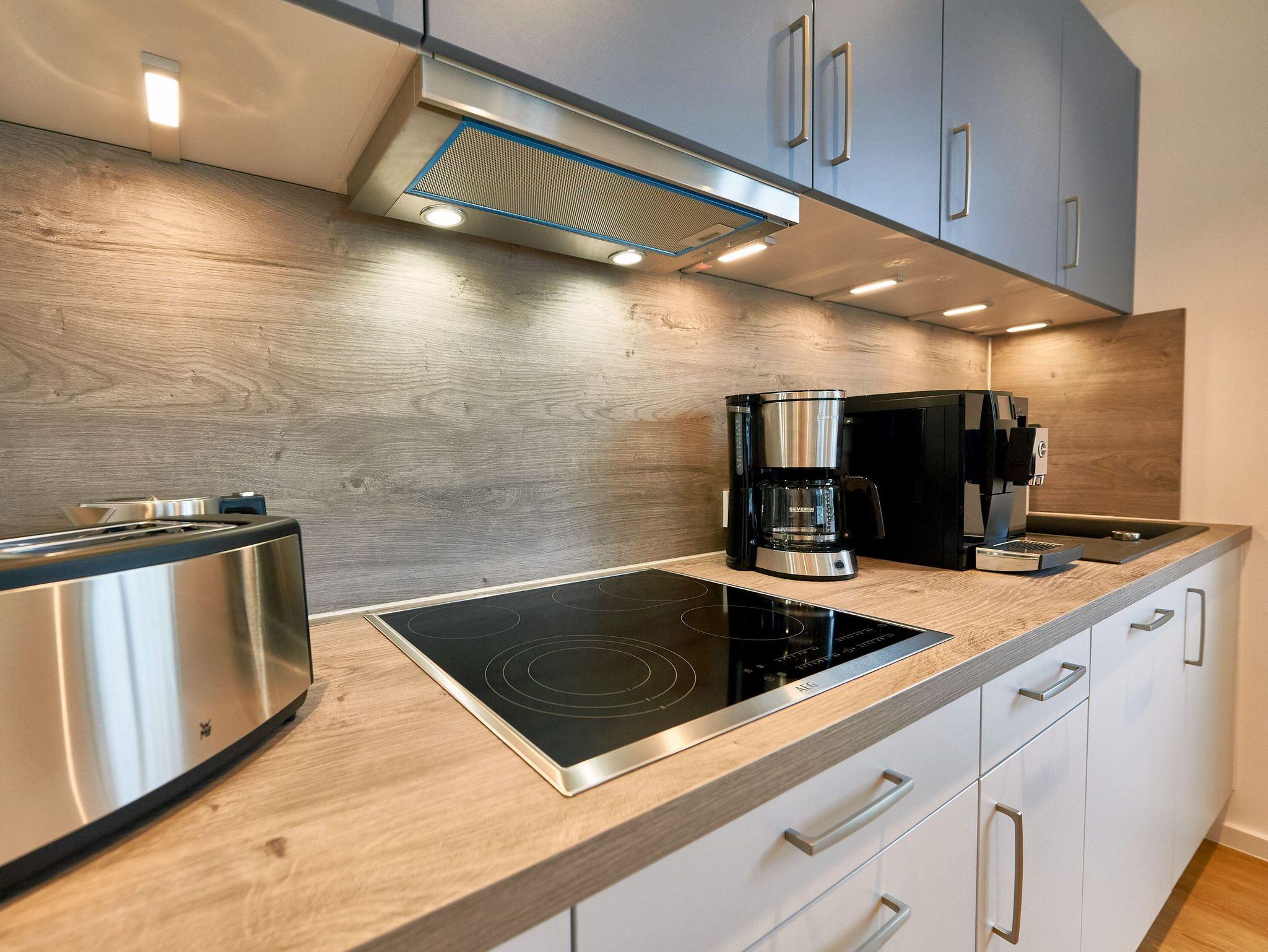 Die exklusive Einbauküche mit Markengeräten von Liebherr, Bosch, Neff, Bauknecht und WMF macht nicht nur optisch etwas her, sondern wartet förmlich darauf, dass Sie Ihren Kochkünsten freien Lauf lassen. Der 4-Zonen-Ceranherd mit Dunstabzugshaube, ein Raclette-Grill, ein Backofen in Komforthöhe, der Geschirrspüler, die große Kühl-/Gefrierkombi und dazu natürlich ein Wasserkocher, ein Toaster, eine Filterkaffeemaschine und sogar ein Kaffeevollautomat von JURA (inkl. Start-Ausstattung an Kaffeebohnen) machen es Ihnen leicht.