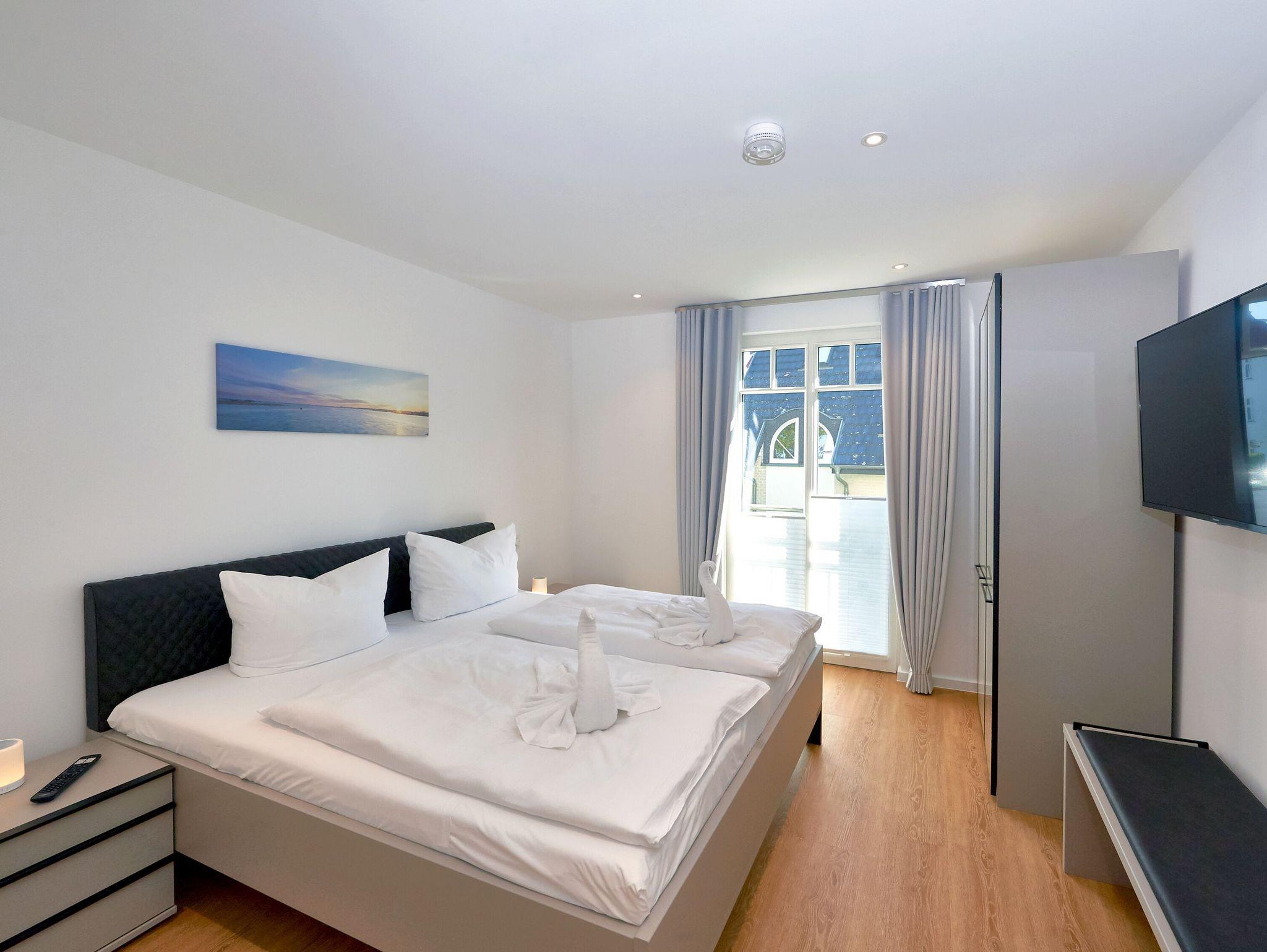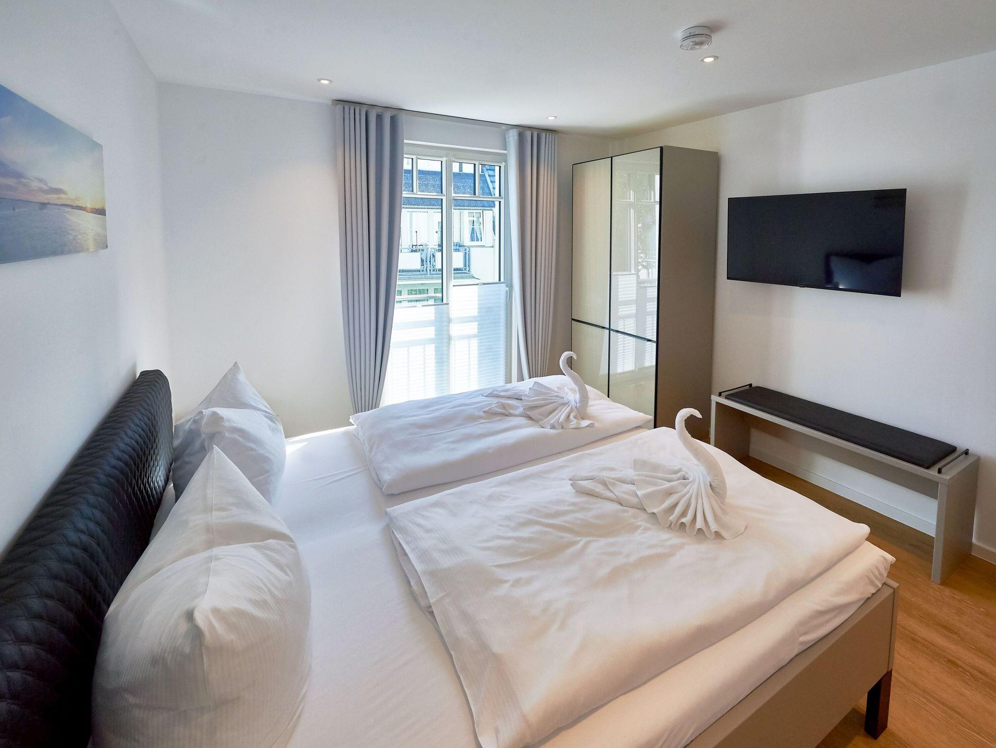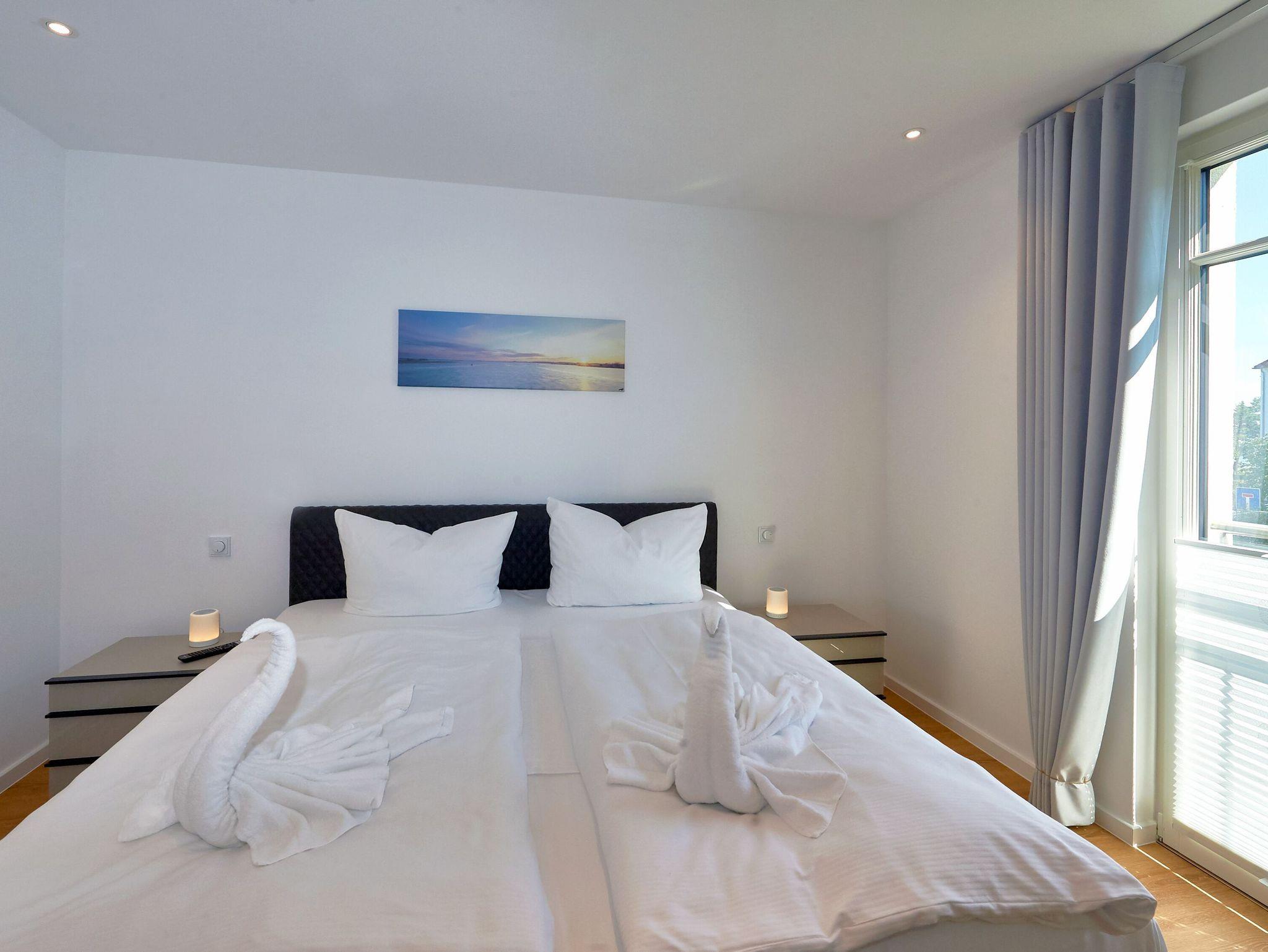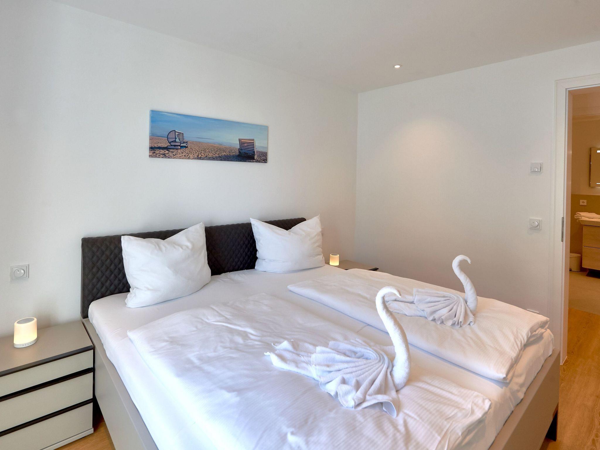 In den Schlafzimmern mit großem Kleiderschrank für Ihre Urlaubsgarderobe und einem zweiten Fernsehgerät versprechen herrlich bequeme Boxspringbetten (1,80 x 2,00 m) süße Träume. Als besonderer Clou entpuppen sich die Nachttischlampen. Diese dienen nämlich nicht nur der stimmungsvollen Beleuchtung, sondern können über Bluetooth auch die eigene Playlist oder das Lieblingshörbuch abspielen.