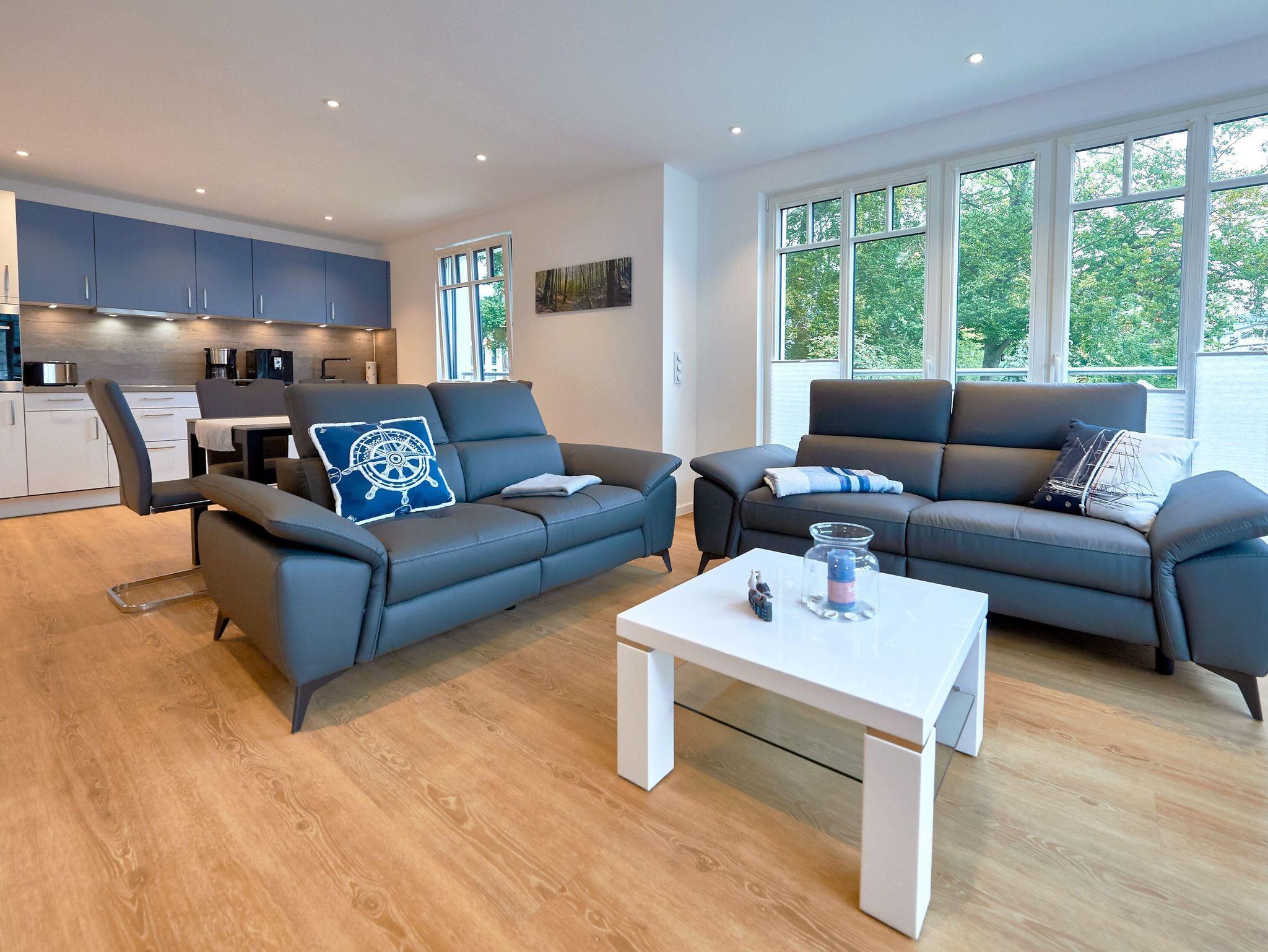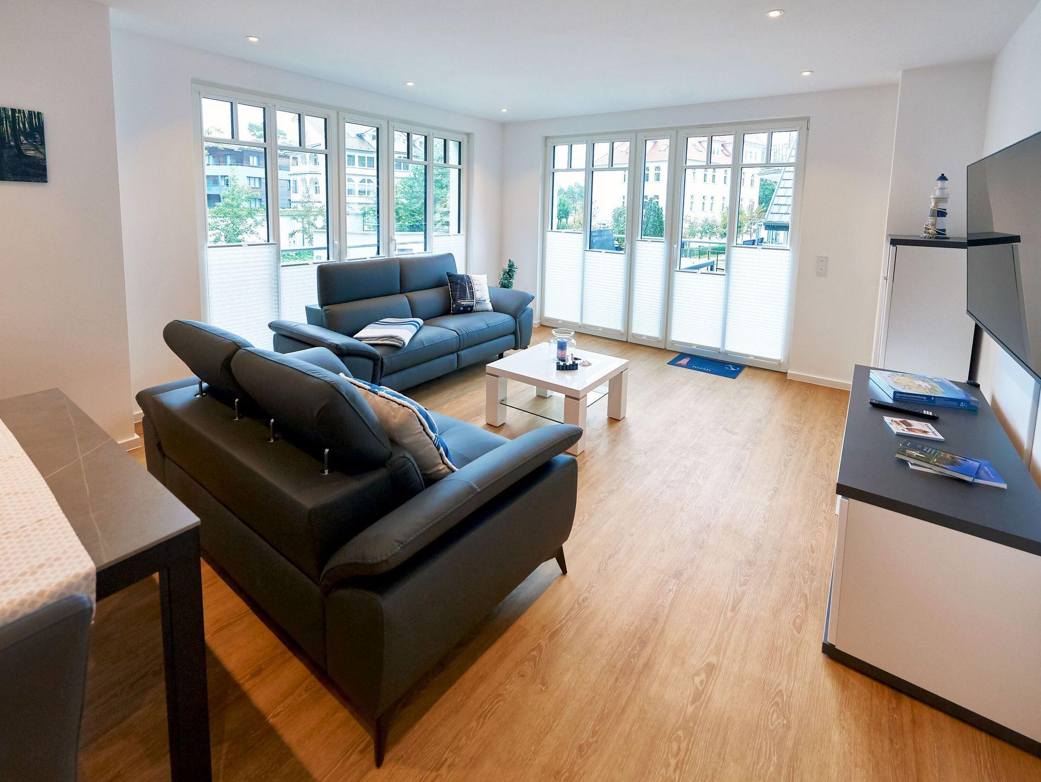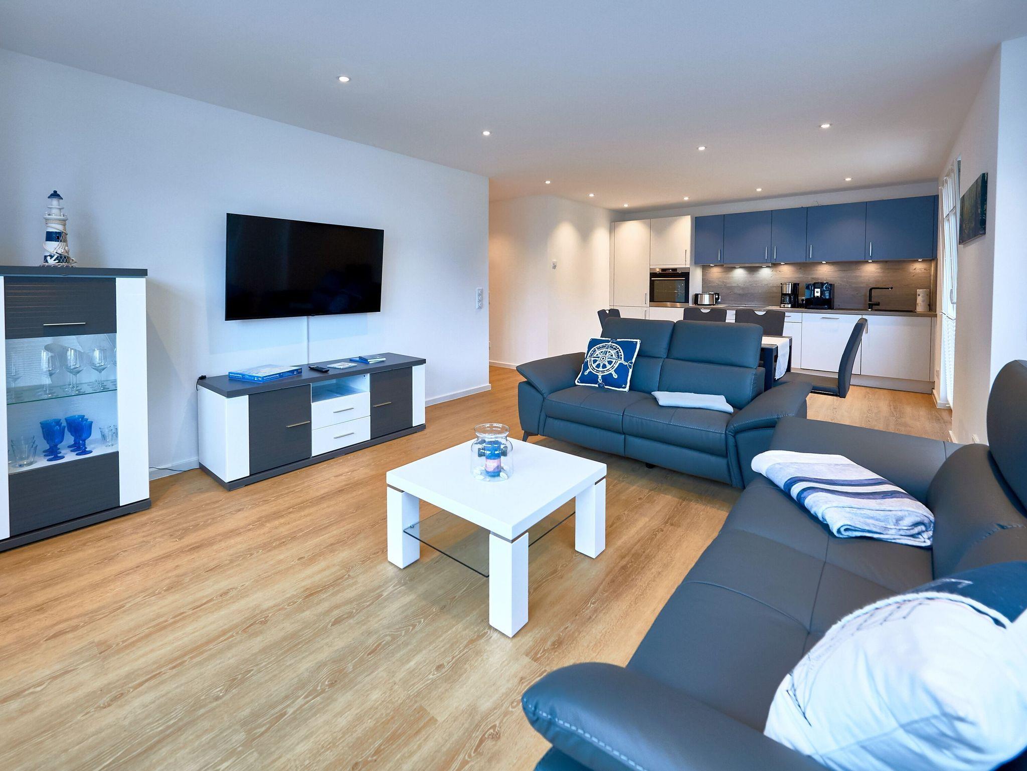 Das Appartement Strandidyll besteht aus einem kombinierten Wohn-/Esszimmer mit integrierter Küche, zwei separaten Schlafzimmern, zwei Badezimmern und einem Flurbereich. Der möblierte Balkon hat eine elektrische Markise und ist dem Wohnzimmer vorgelagert.