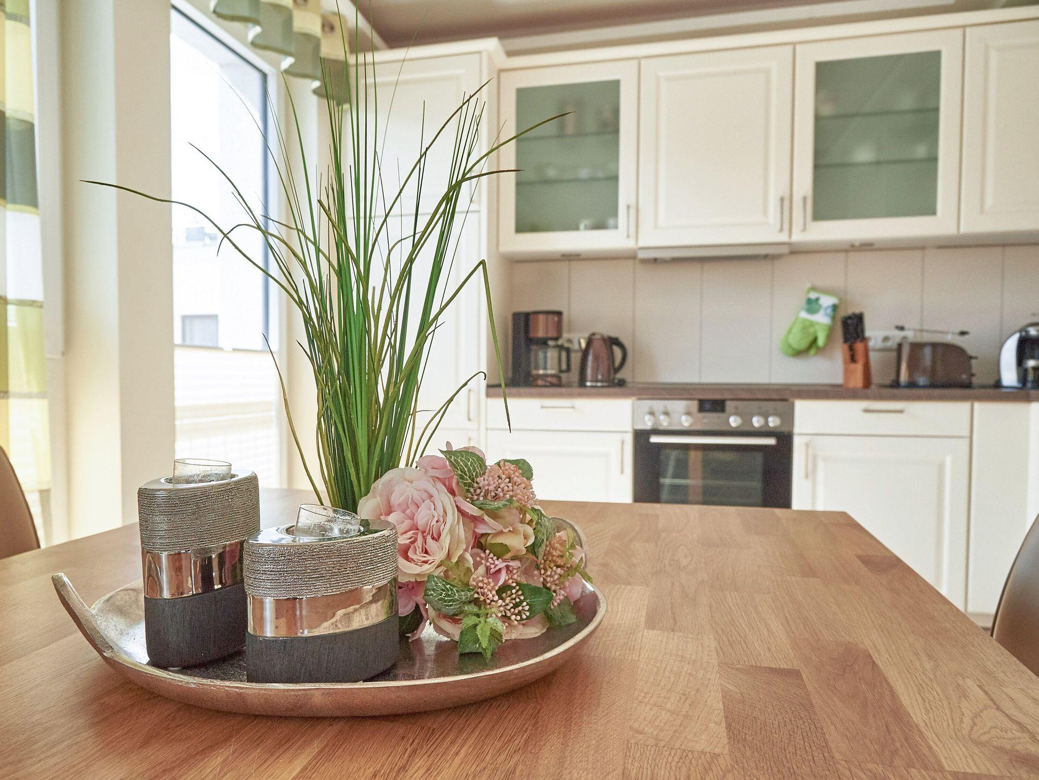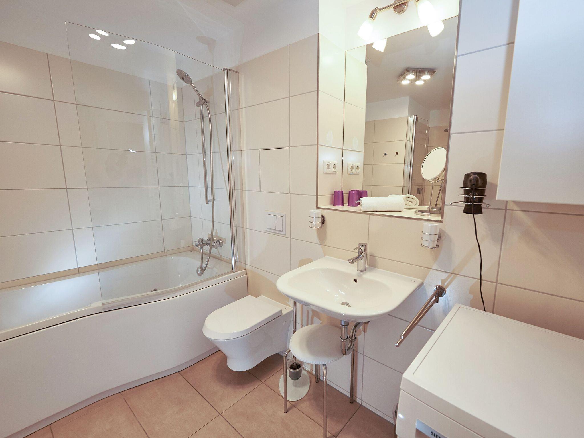 Ihre Ferienwohnung bietet Ihnen darüber hinaus den Komfort einer eigenen Waschmaschine nebst Bügeleisen und Bügelbrett, welche Sie kostenfrei benutzen können. Echtholzparkett (außer Küche), eine einzeln regulierbare Fußbodenheizung sowie die indirekte Voutenbeleuchtung unterstreichen den hochwertigen Gesamteindruck.