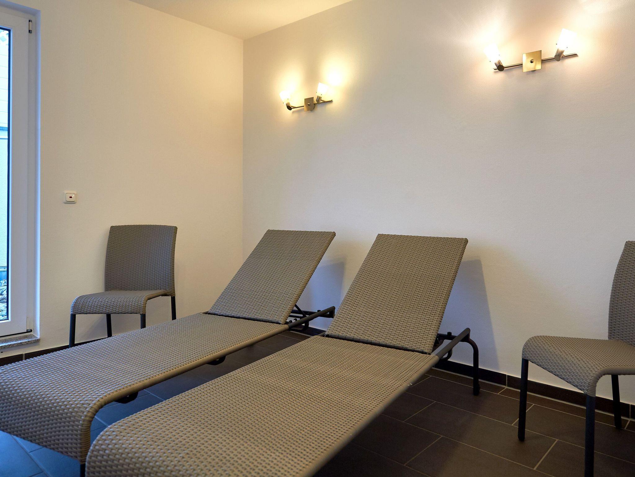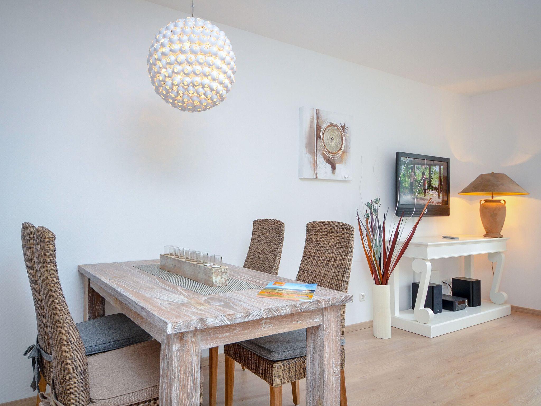 Dieses rund 77 qm große 3-Raum-Appartement erwartet Sie in der 1. Etage und kann bequem mit dem Fahrstuhl erreicht werden. Das 32 qm große Wohnzimmer ist behaglich mit einer Sitzecke mit Couch und Sessel eingerichtet. Zur technischen Ausstattung gehört ein Loewe Flachbild-TV (107 cm) sowie eine Stereoanlage inkl. DVD-Player. Eine kleine Auswahl an DVD`s steht Ihnen ebenfalls zur Nutzung zur Verfügung. Mit einigen Gesellschaftsspielen, die sich im Appartement befinden, können Sie die Abende kurzweilig verbringen.