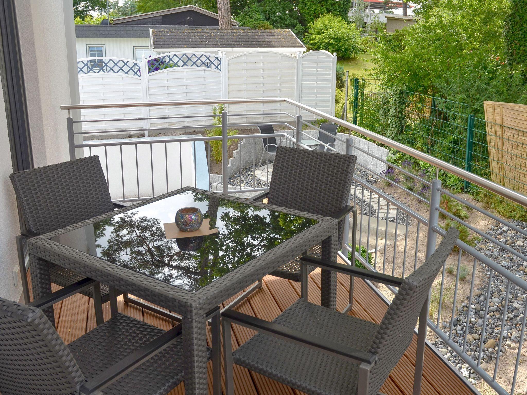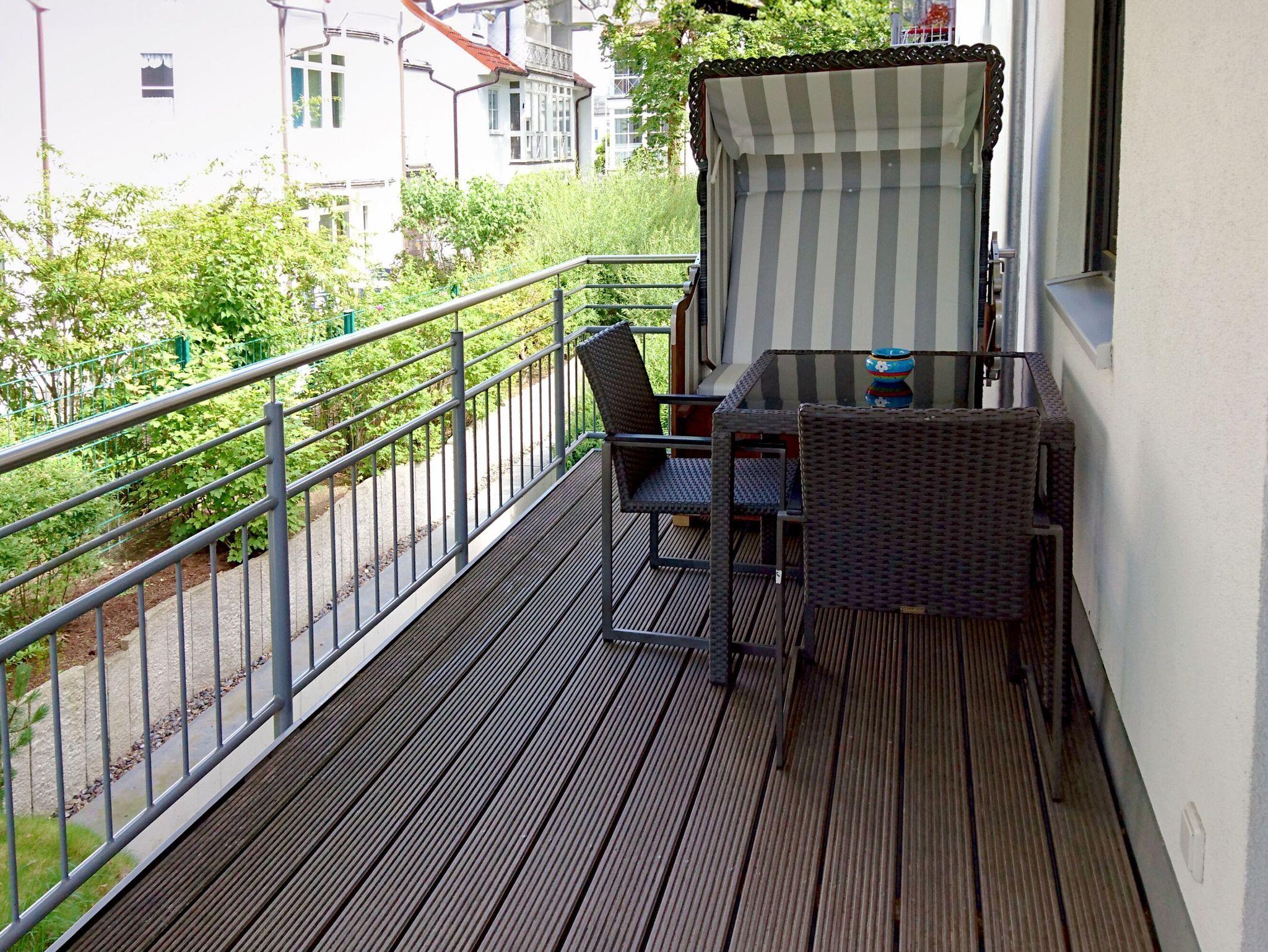 Auf dem 10 qm großen möblierten Balkon der Wohnung können Sie die Abendsonne bei einem Glas Wein genießen und haben einen schönen Ausblick ins Grüne von Binz. Zum Einkuscheln steht ihnen hier sogar ein Strandkorb zur Verfügung.