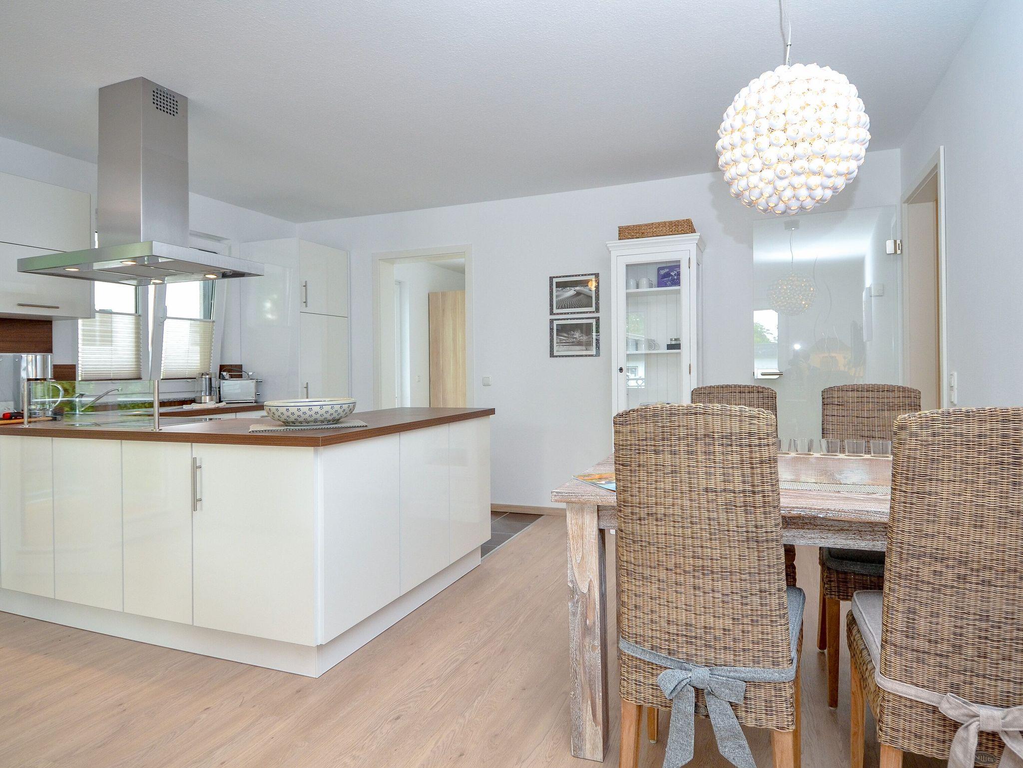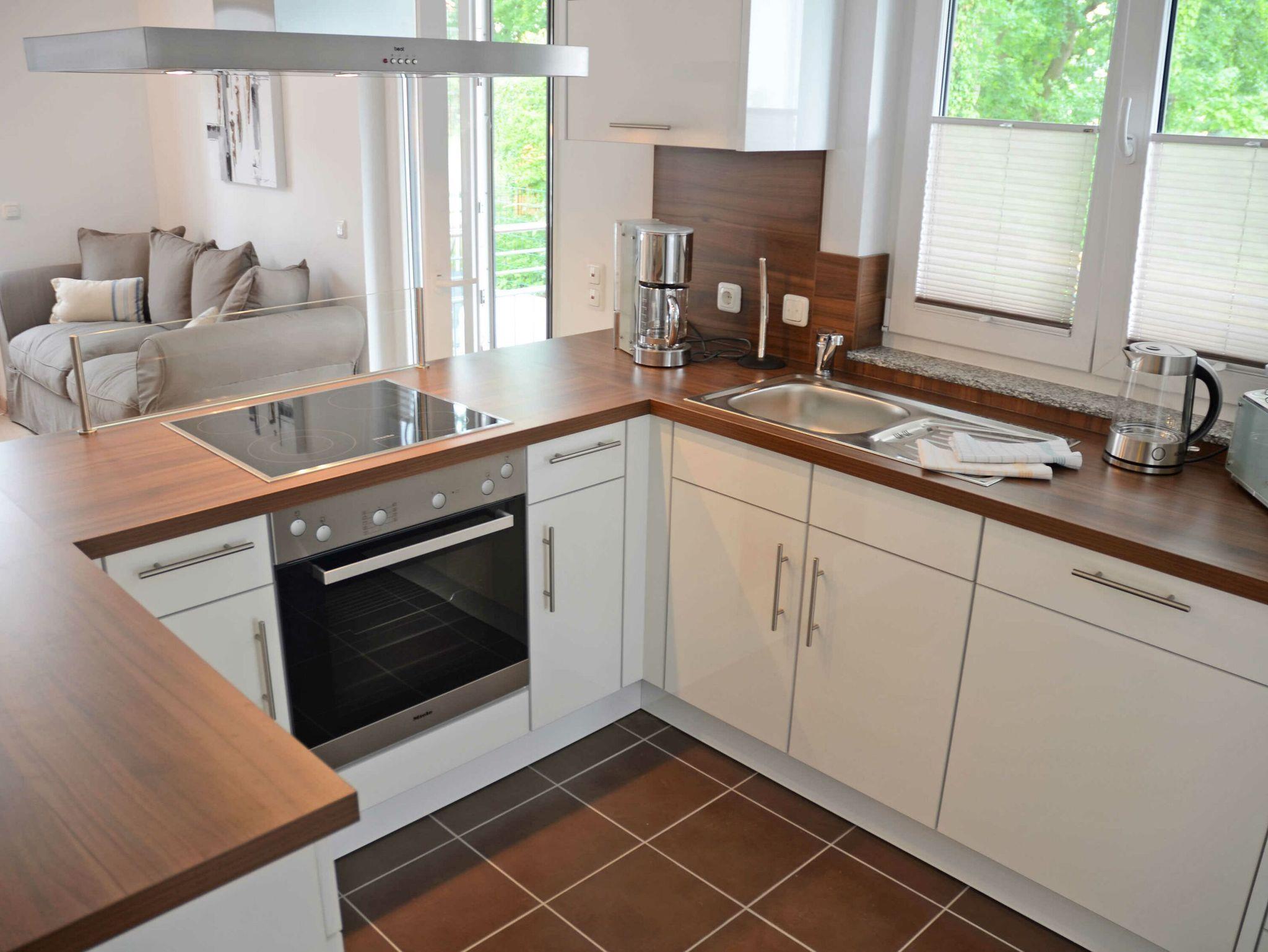 Im Wohn-/Essbereich befindet sich eine harmonisch in den Raum eingefügte komplette Küche mit einem 4-Platten Ceranfeld Herd sowie Backofen, Geschirrspülmaschine und ein Kühlschrank mit Gefrierfach. Alle Elektrogeräte sind von der Firma Miele. Außerdem steht Ihnen eine Nespresso De´Longhi Pixi Kaffeemaschine für Ihren Aufenthalt zur Verfügung. Der Boden im Küchenbereich ist gefliest; der übrige Raum sowie die beiden Schlafzimmer und die Diele sind mit hochwertigem Laminat ausgelegt.
