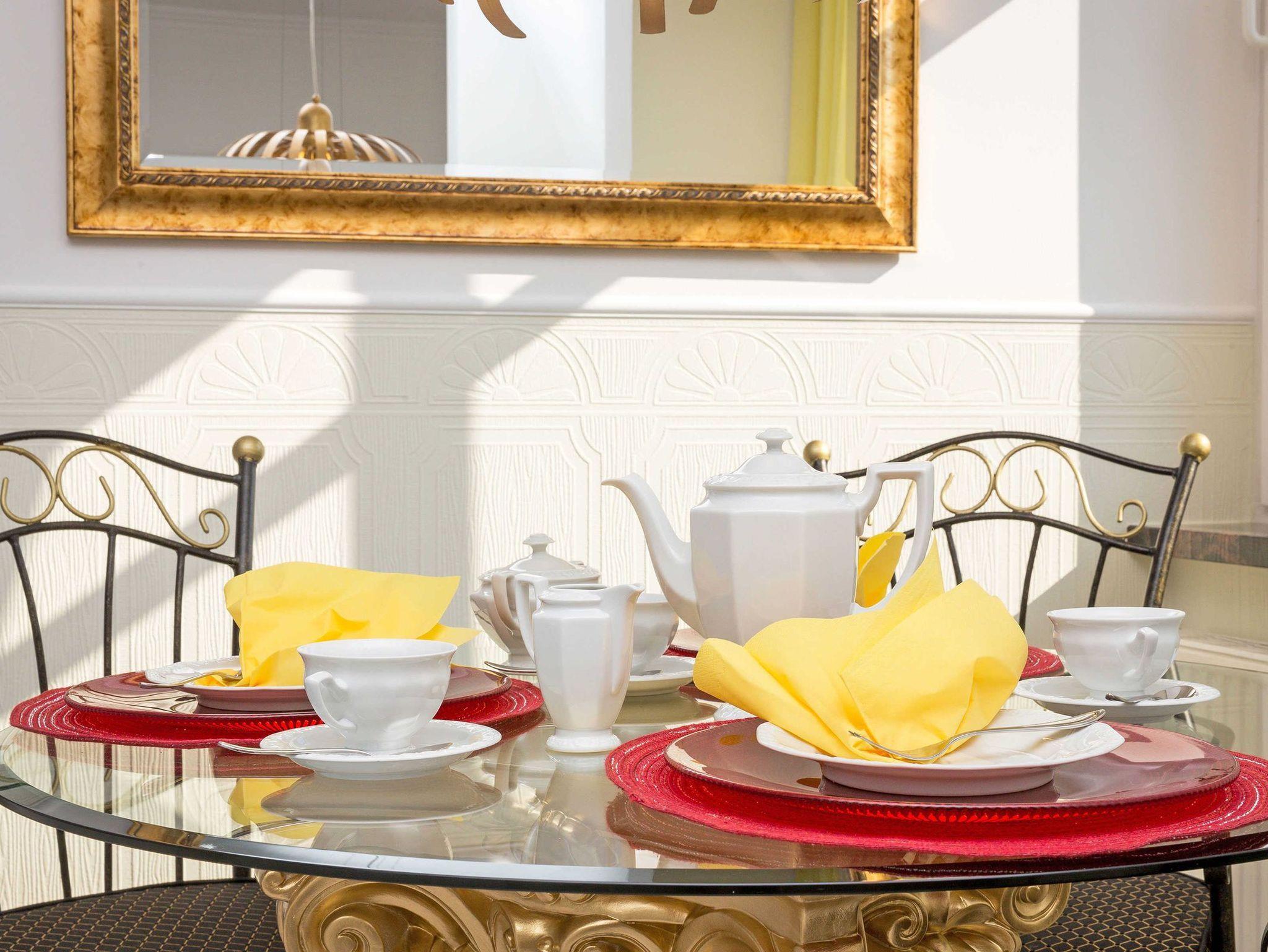 Die hochwertige LEICHT-Einbauküche ist in elegantem Weiß und Schwarz gehalten und mit einer roten Granit-Arbeitsplatte versehen. Sie verfügt über einen kleinen Weinkühlschrank, einen Kühlschrank mit Gefrierfach, einen Backofen, ein BORA 4-Zonen-Cerankochfeld mit Induktion und Dunstabzug nach unten, eine Spülmaschine, eine Mikrowelle und diverses Kleininventar, das die Küchenausstattung komplettiert. Dank Kaffeemaschine, Cafe-Espresso-Pads-Automat, Toaster, Wasserkocher, Eierkocher, Standmixer und elektr. Zitronenpresse etc. müssen Sie auf keinen Komfort verzichten. Und in dem großzügig und beleuchteten Glas-Hochschrank ist all das schöne Porzellan „Maria Weiß“ von Rosenthal wie auch schöne Gläser zu finden. Am exquisiten Säulen-Glastisch können Sie bequem auf geschmiedeten Armlehnstühlen mit angepassten Sitzauflagen und Kissen Platz nehmen.