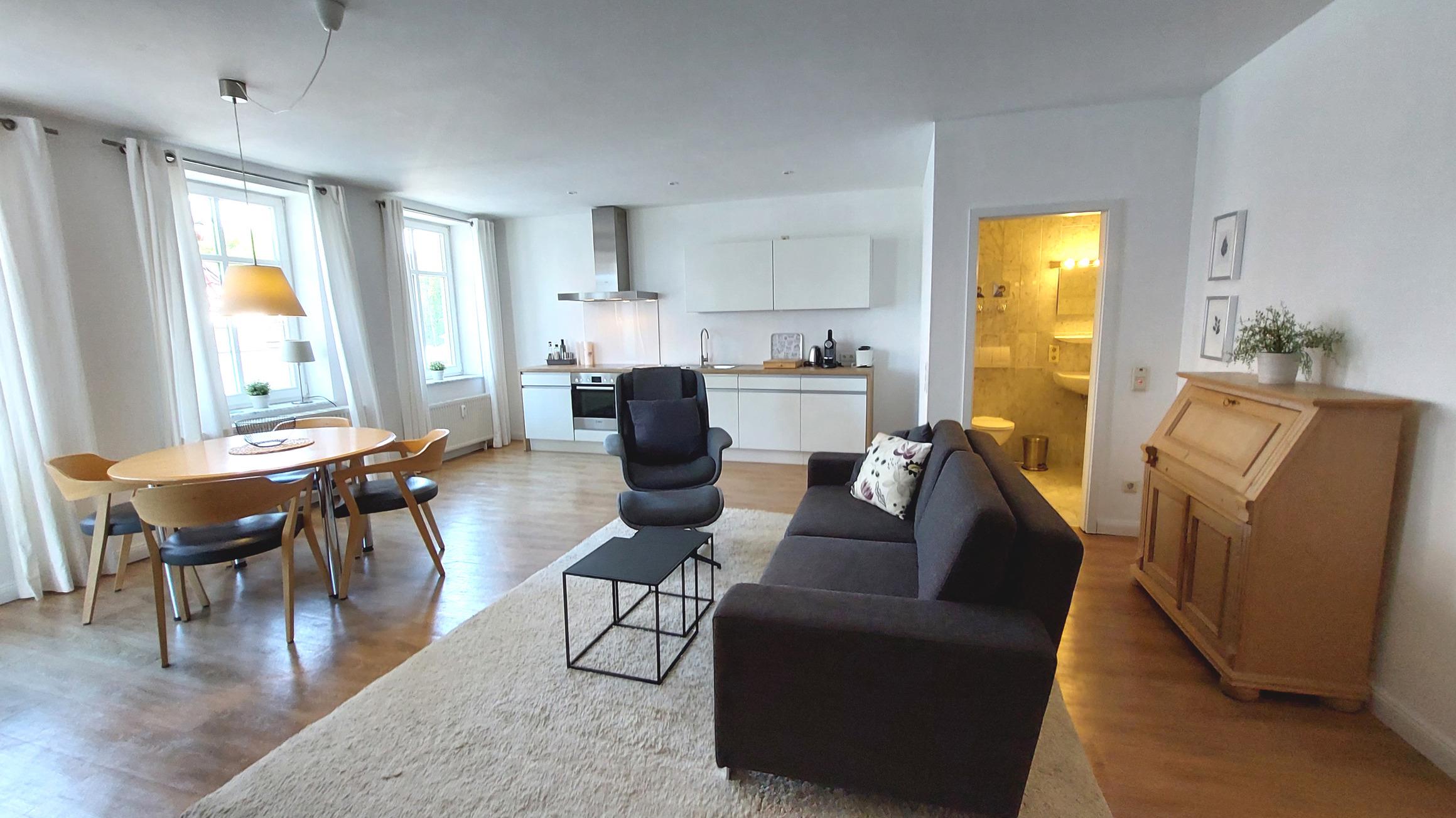 Im großzügigem Wohnbereich befindet sich eine moderne, offene Küchenzeile samt Esstisch. Mit Backofen, Ceranfeld, Kühlschrank (samt Gefrierfach) und Geschirrspüler steht alles zur Verfügung um sich auch im Urlaub selbst zu verpflegen.