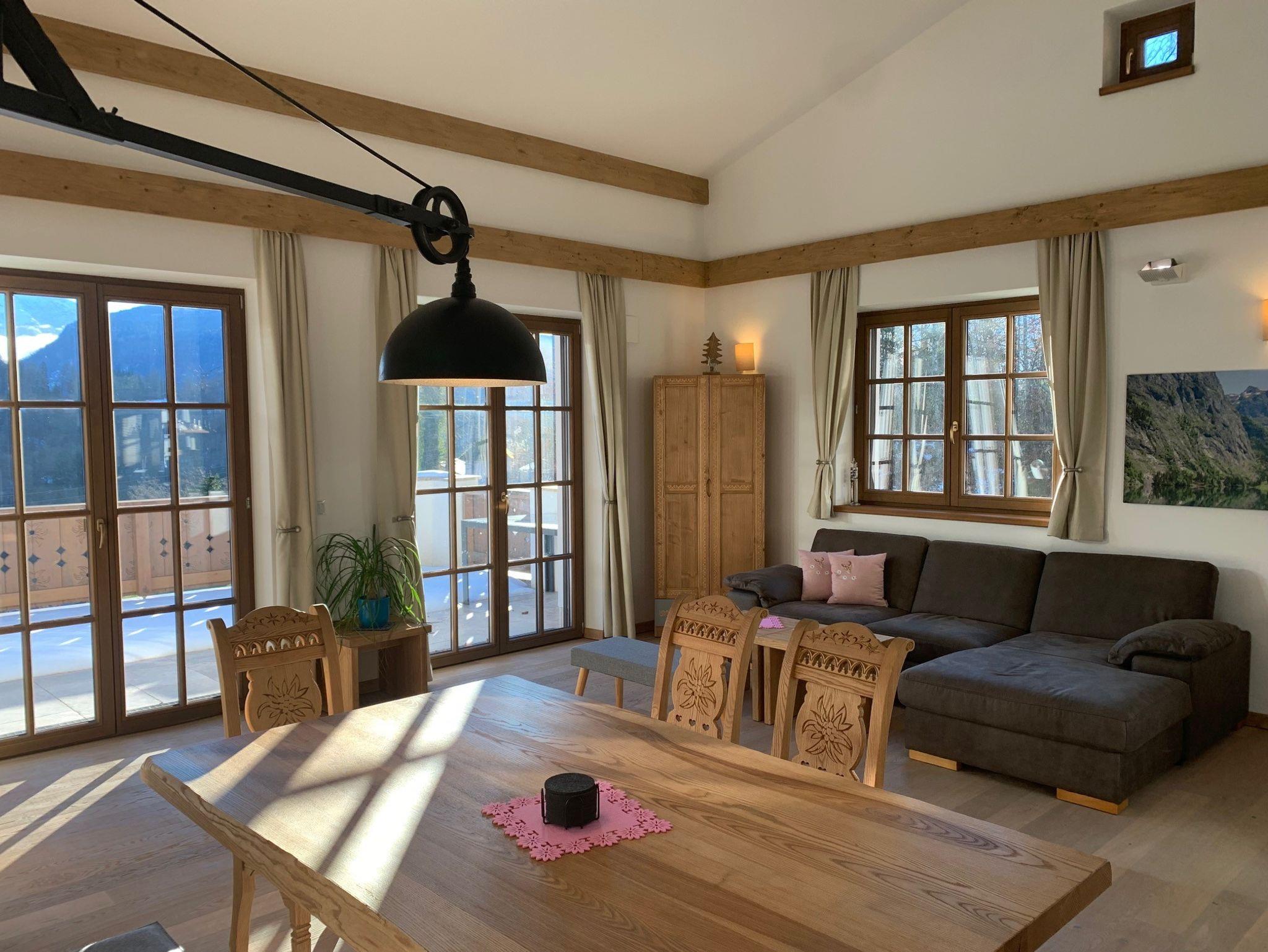 Einrichtung in alpin-modernem Stil, Echtholzparkett, Fußbodenheizung, hochmoderne vollausgestattete Küche, Bad mit Dusche, WC getrennt, 2 Schlafzimmer mit Boxspring-Doppelbetten, Süd-Aussichtsterrasse mit großer elektrischer Markise.