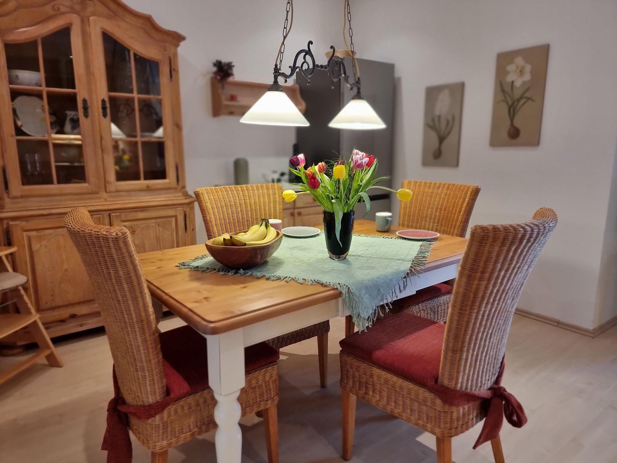 Die ca. 75 qm große, gemütlich möblierte Ferienwohnung im Luftkurort Schledehausen verfügt über eine offene Küche mit Essecke, ein Wohnzimmer mit einer Schlafcouch, ein großzügiges Duschbad, Flur und ein Schlafzimmer mit Doppelbett 180 X 200 cm. Alle modernen, elektrischen Haushaltsgeräte sind vorhanden, ebenso Sat-TV, Radio-CD Player und Internetzugang.