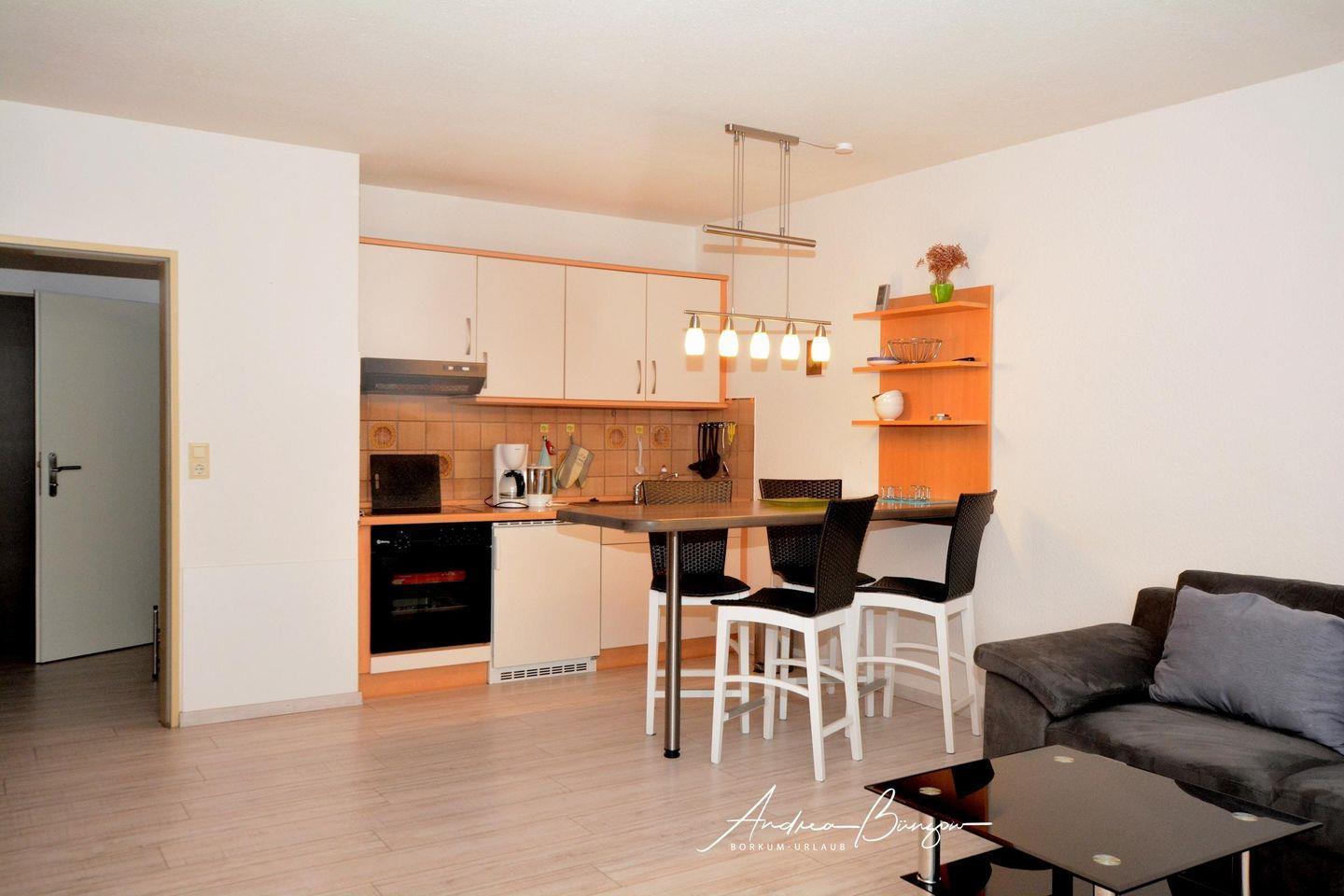 Die 33 qm Nichtraucher- und Haustier freie Ferienwohnung befindet sich in der zweiten Etage und verfügt über einen großzügigen Wohnraum mit Schrankbett, Küchenzeile und Essplatz.