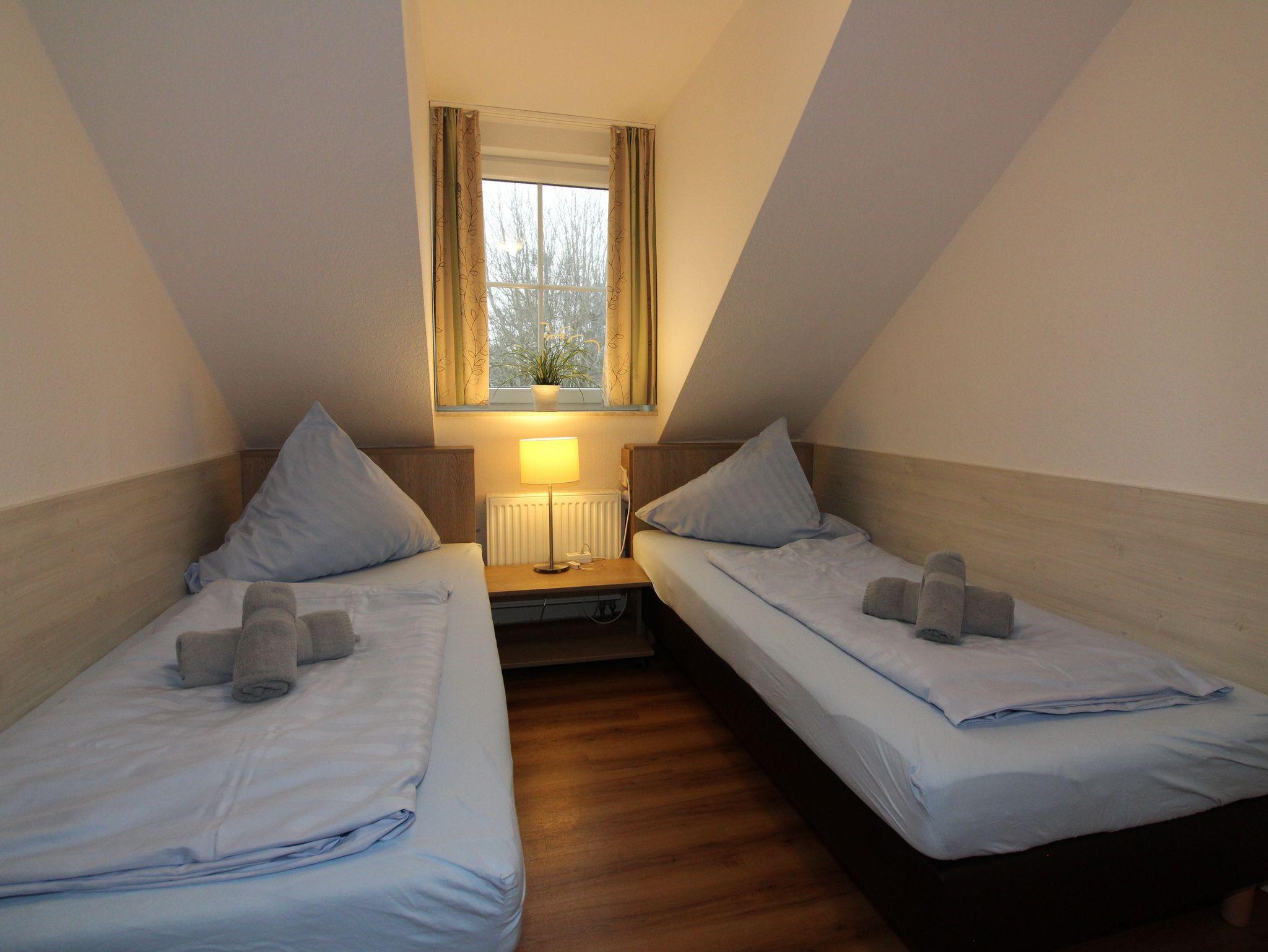 ein Schlafzimmer mit zwei Einzelbetten, Radiowecker, Schränke, Leseleuchten,