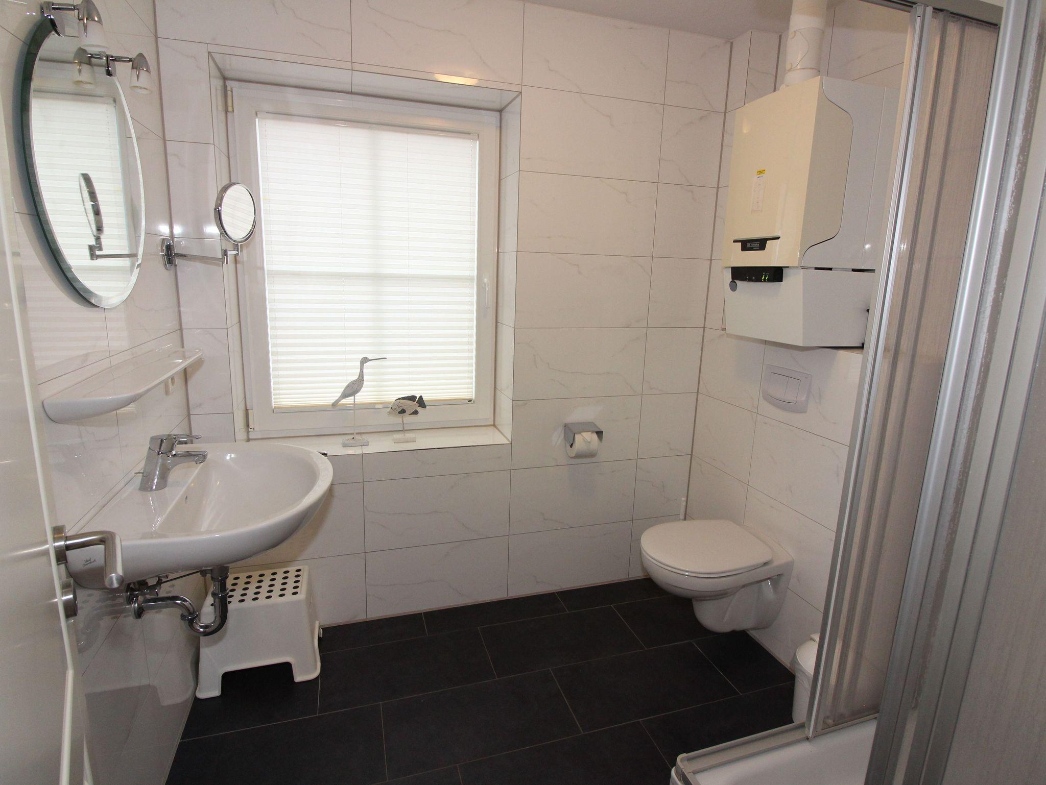 Dusche mit flacher Duschwanne, beleuchteter Badspiegel, Kosmetikspiegel, Handtuchheizkörper, Föhn.