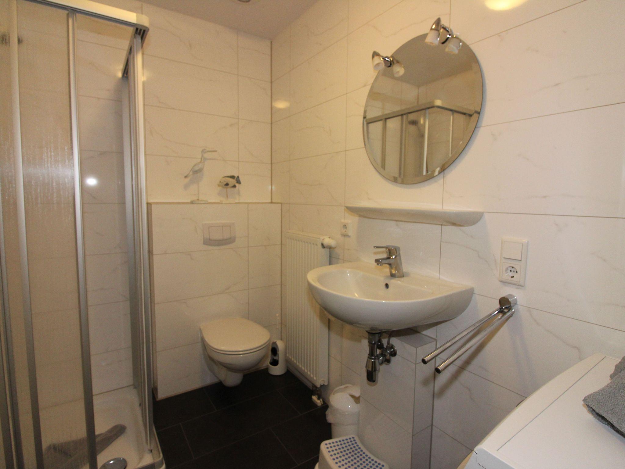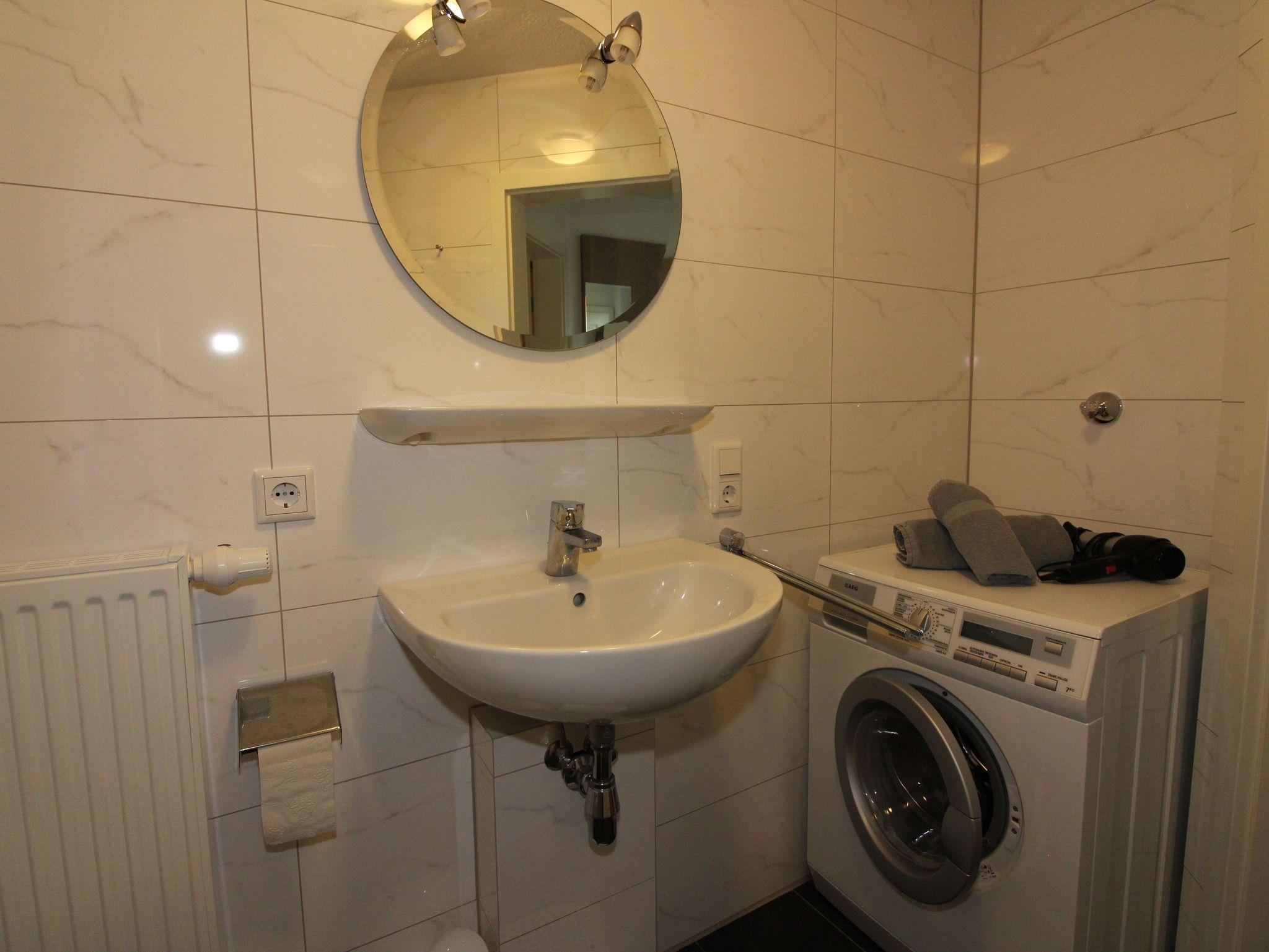 Dusche mit flacher Duschwanne, beleuchteter Badspiegel, Waschtrockner