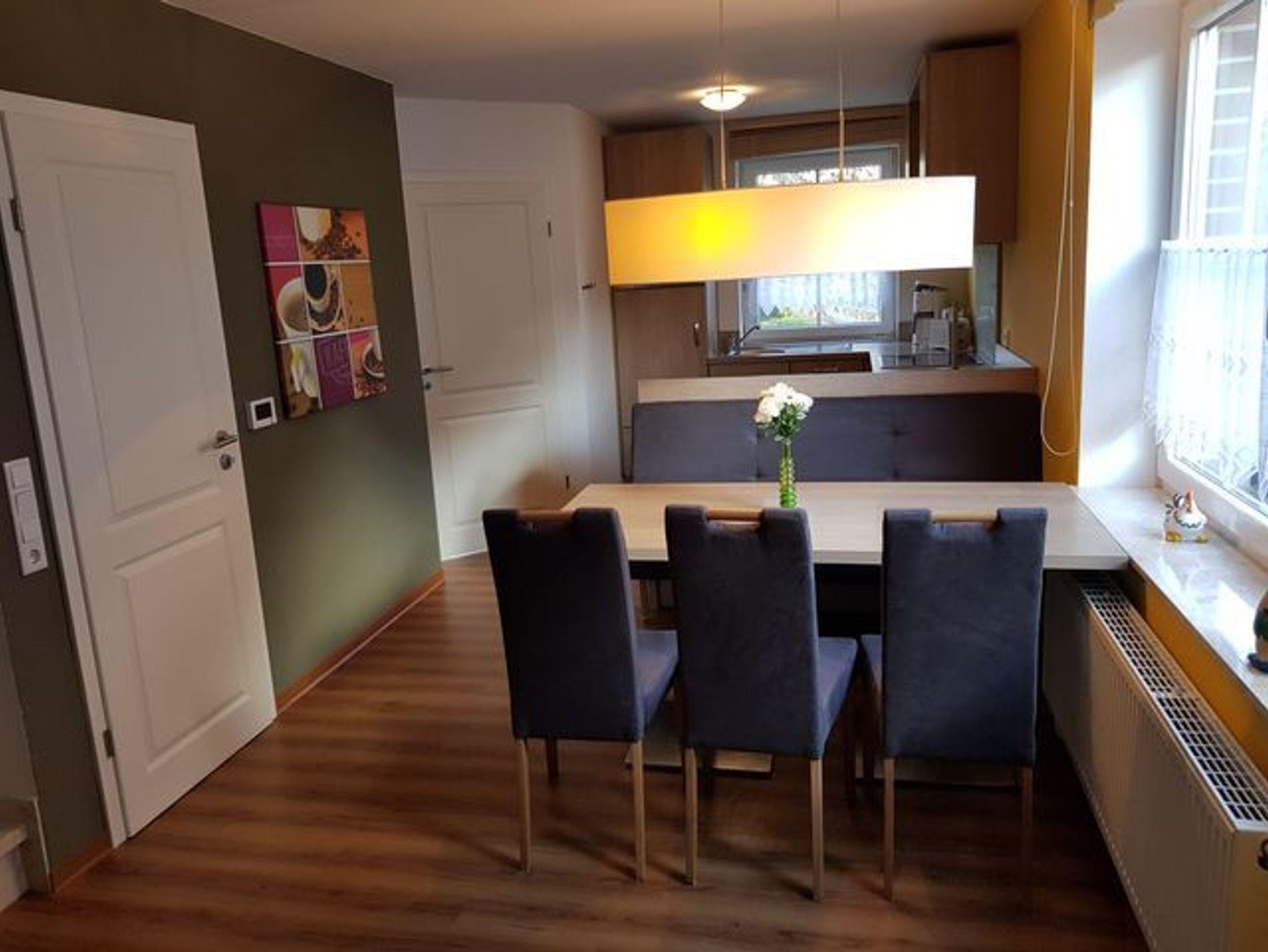 Essplatz für bis zu 6 Personen mit Loungebank und drei Stühlen