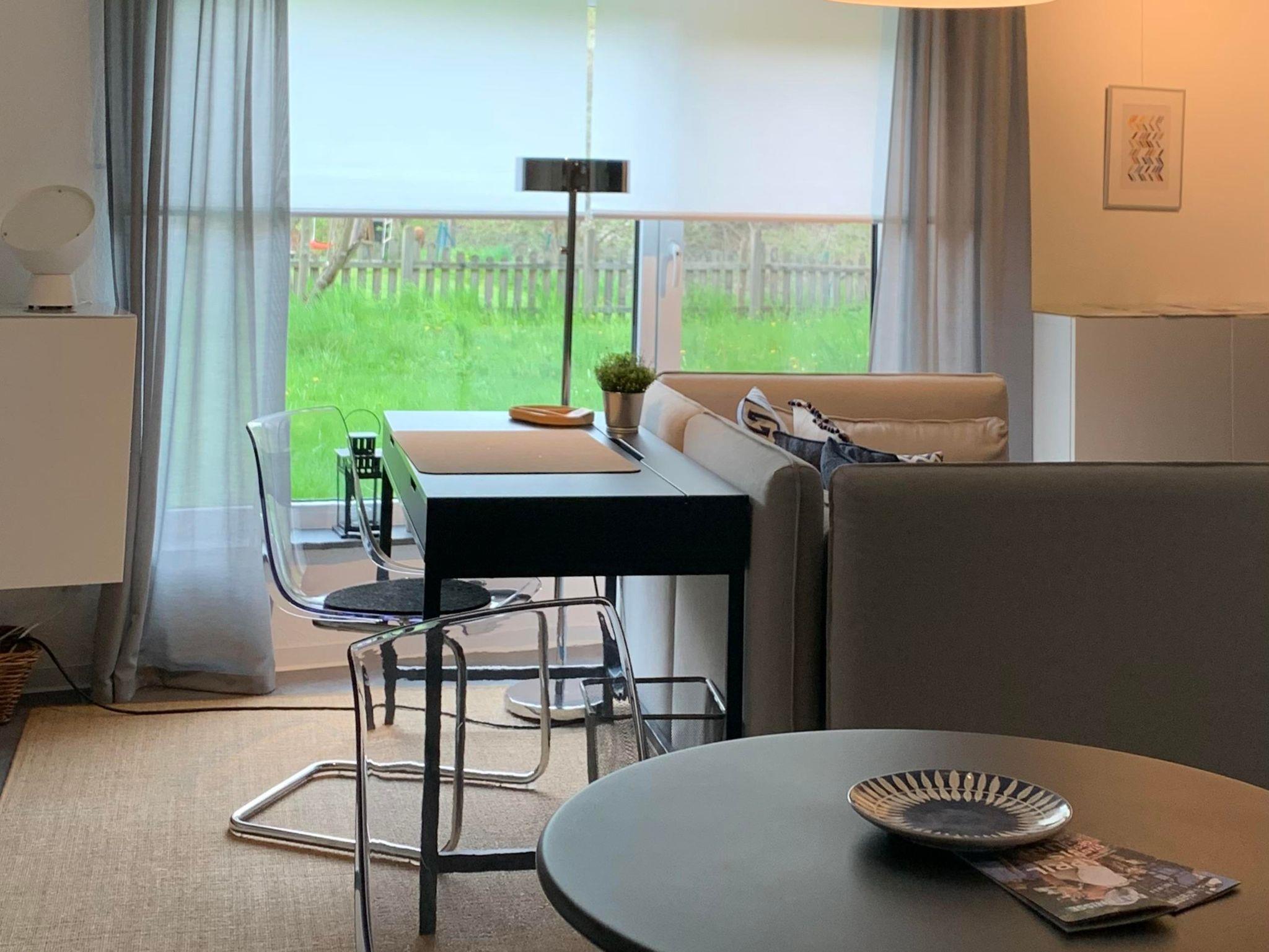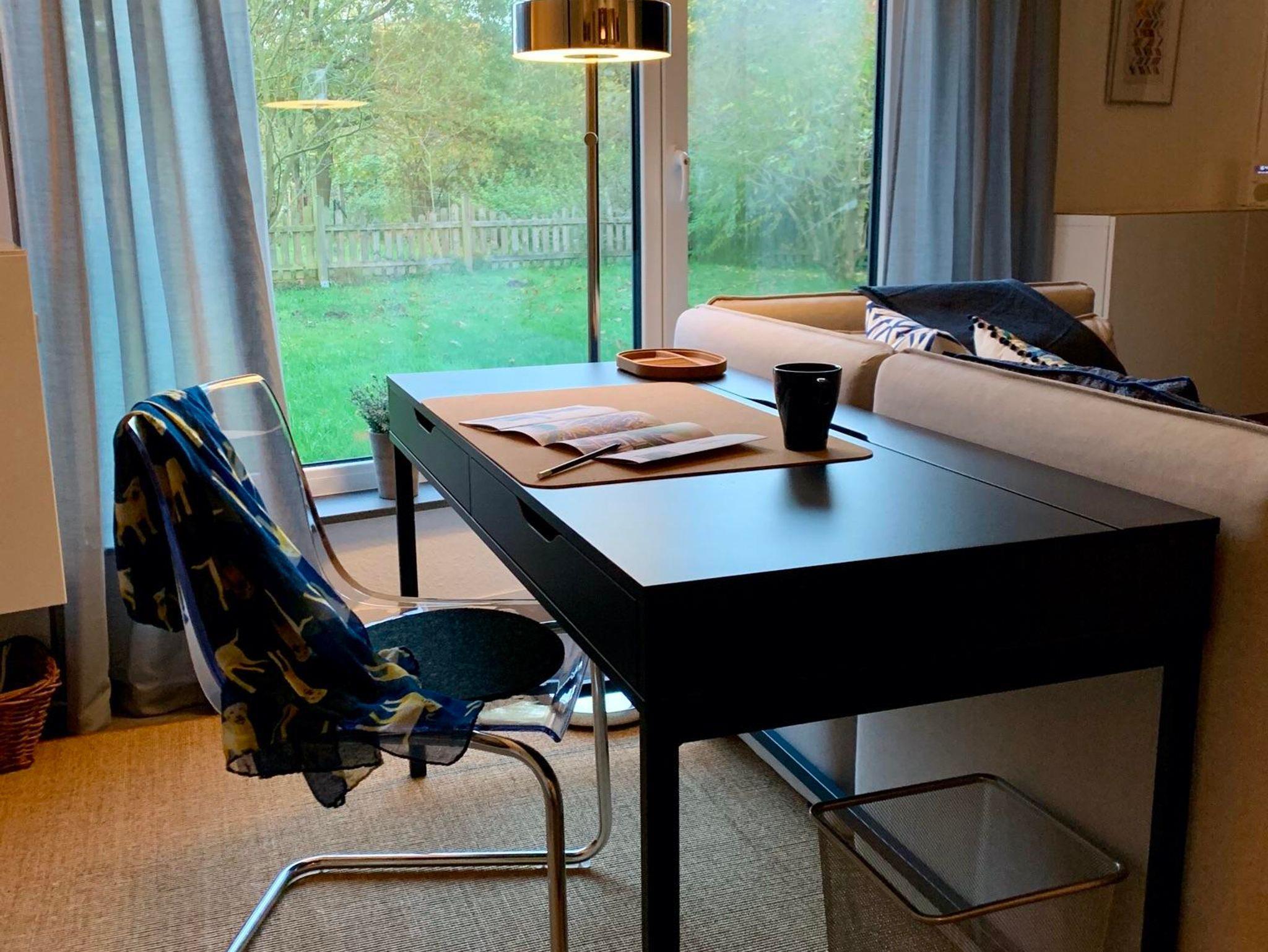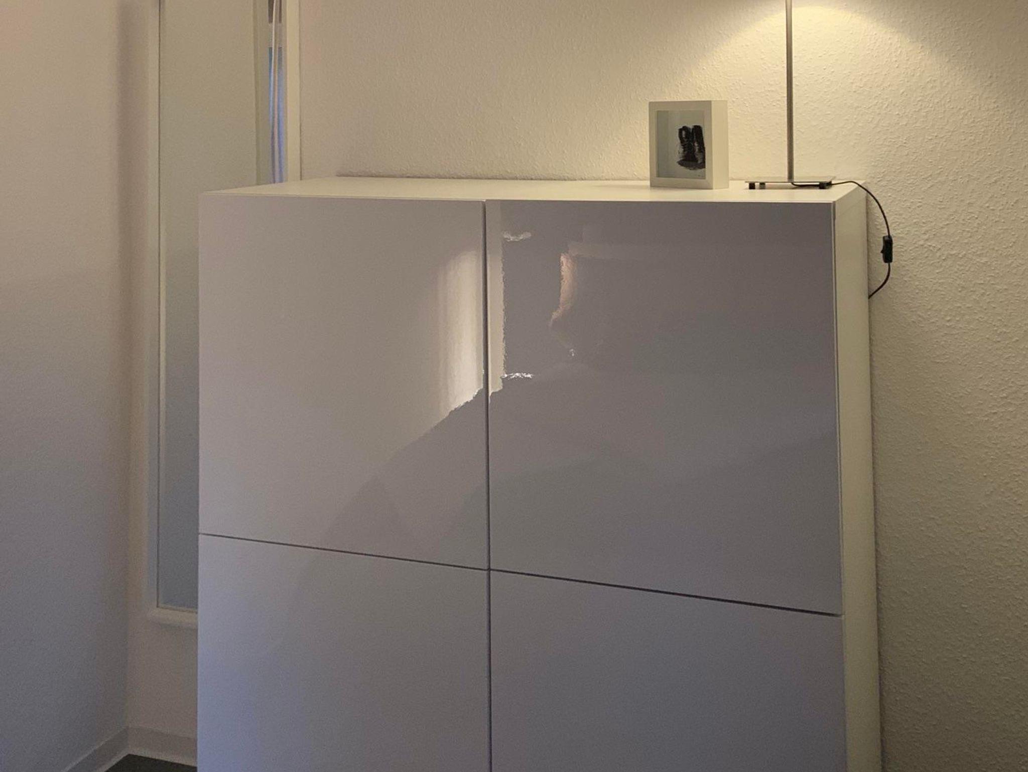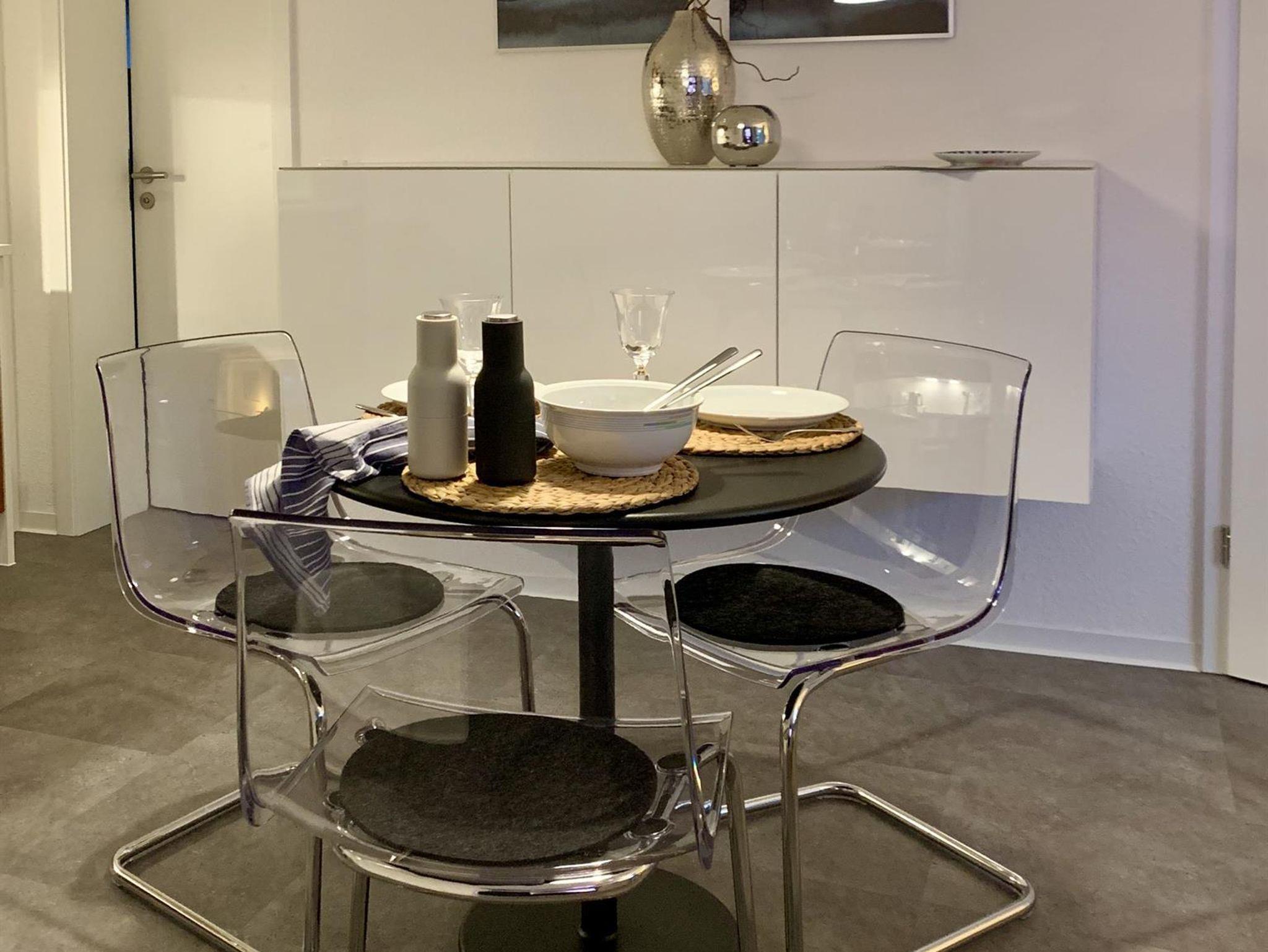Hier können Sie mit zwei Personen gemütlich essen. Mit Besuchern wird’s kuschlig, aber bei einem Glas Wein einen Happen schnappen sollte möglich sein. Platzsets, Geschirr, Besteck, Gläser für Wein, Wasser, Saft, Weizenbier und Sekt finden Sie im Sideboard an der Wand.