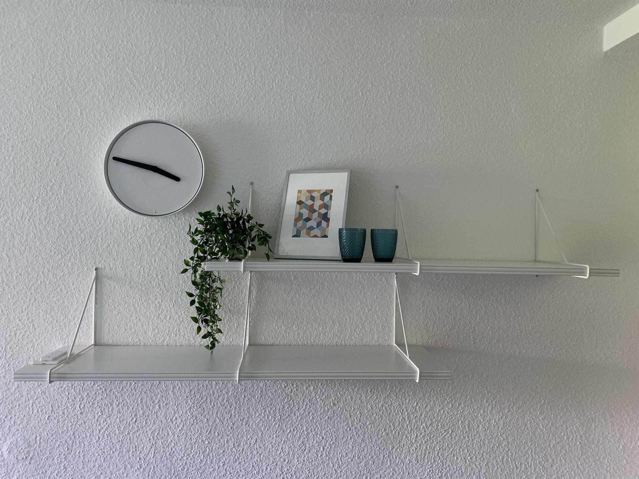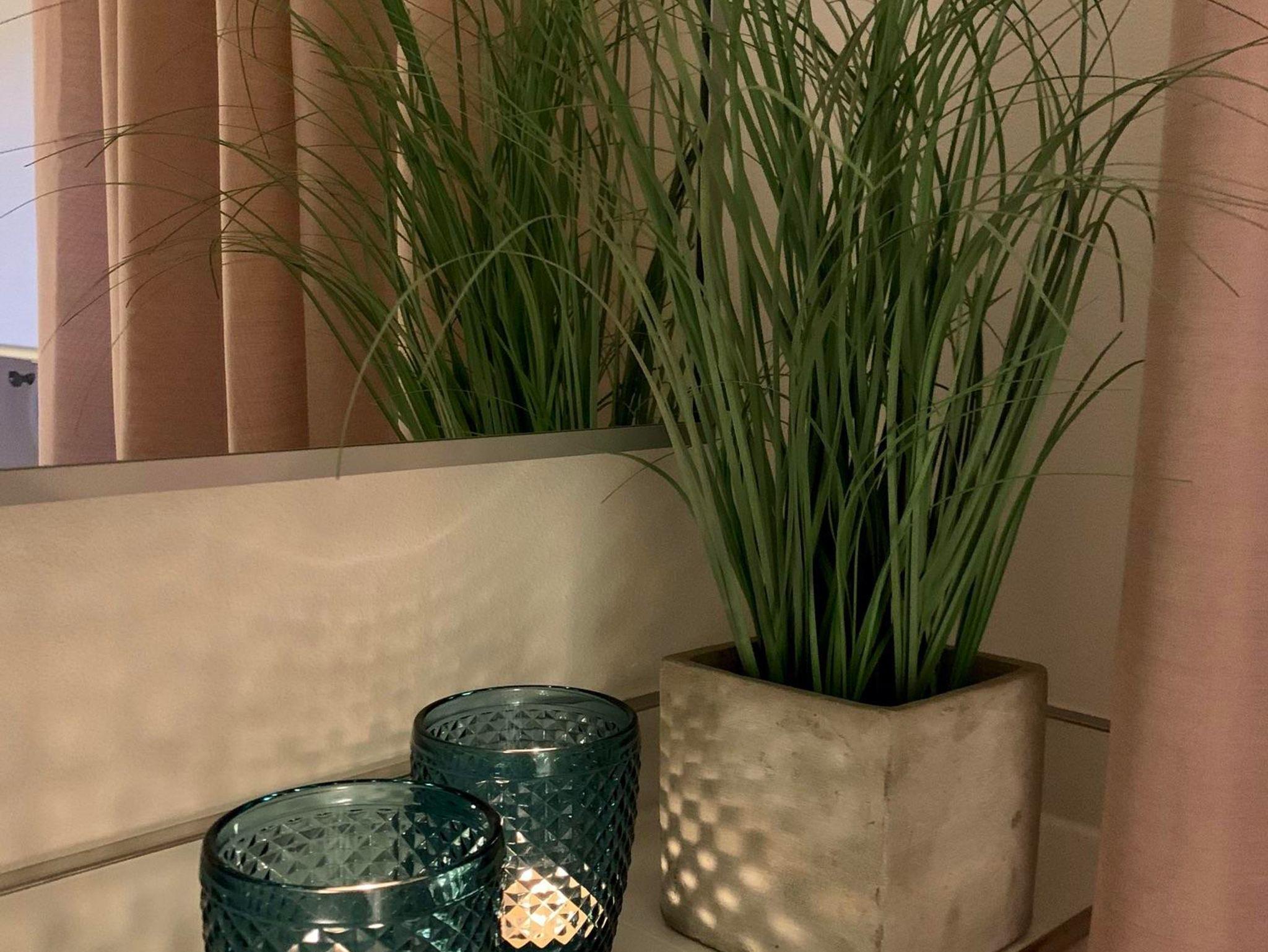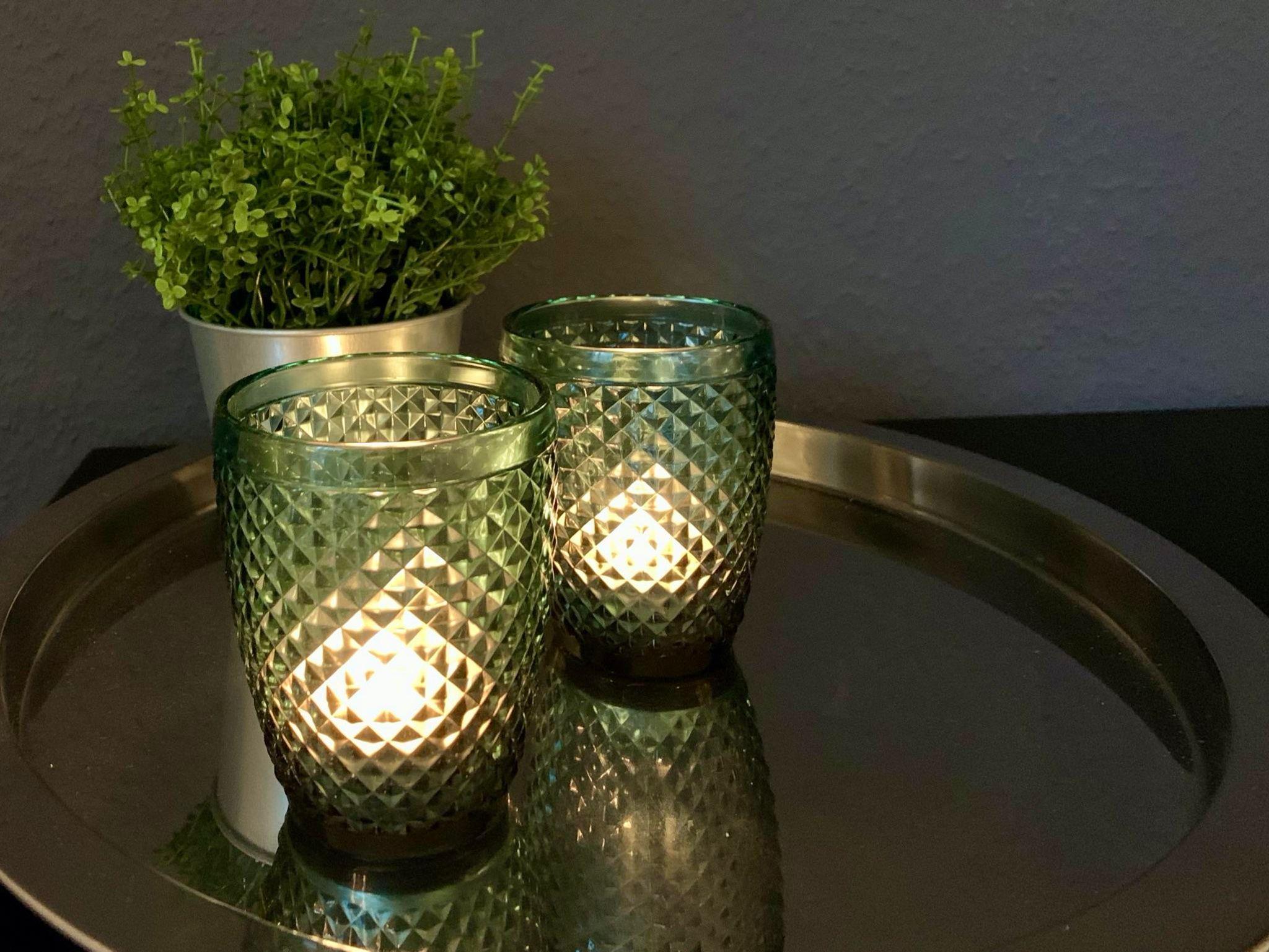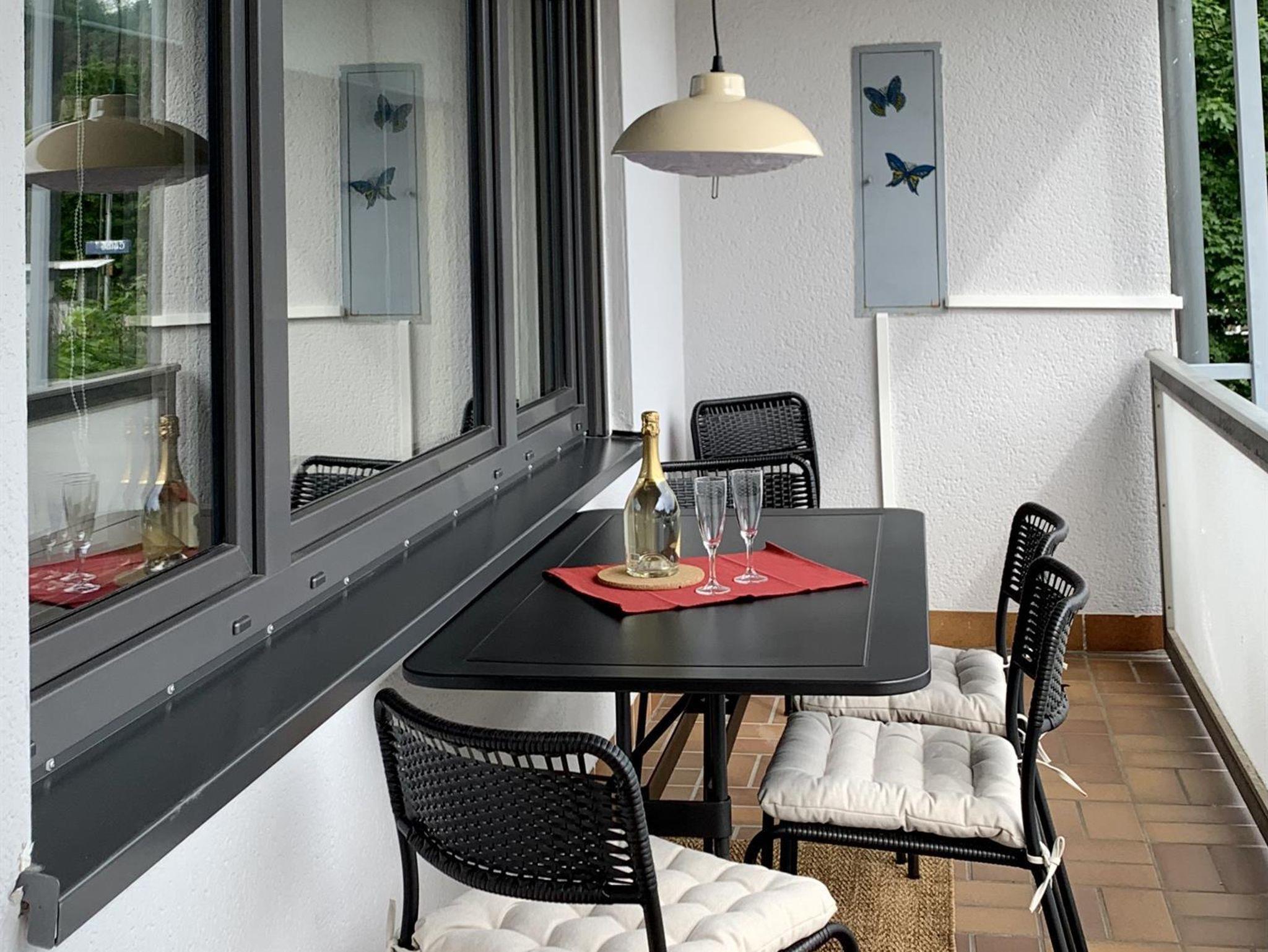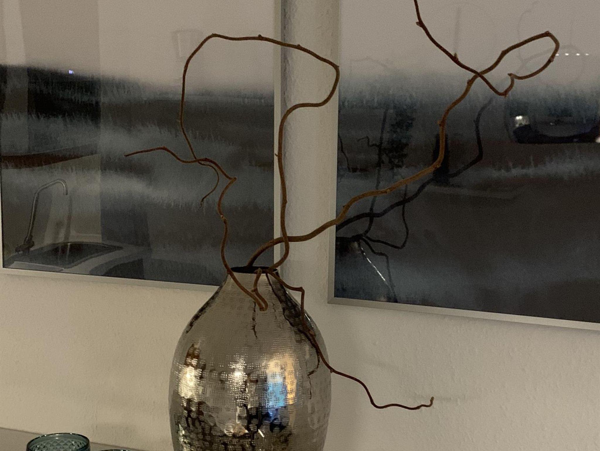 Hier können Sie mit zwei Personen gemütlich essen. Mit Besuchern wird’s kuschlig, aber bei einem Glas Wein einen Happen schnappen sollte möglich sein. Platzsets, Geschirr, Besteck, Gläser für Wein, Wasser, Saft, Weizenbier und Sekt finden Sie im Sideboard an der Wand.
