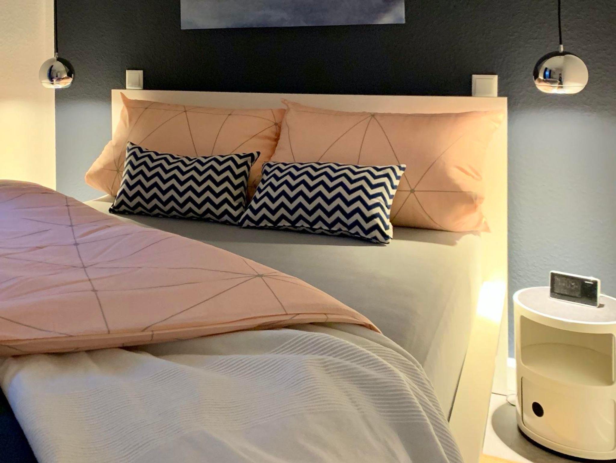 Das separate Schlafzimmer bietet Ihnen ein komfortables Bett (1,40 x 2,00 m - ohne Fußteil), einen Kleiderschrank, sowie einen Ganzkörper-Spiegel, Nachtschränke, Wecker mit Funkuhr und Leseleuchten, die Sie getrennt schalten können. Decken in Übergröße (2,20 m Länge) stellen wir Ihnen auf Anfrage kostenfrei zur Verfügung.