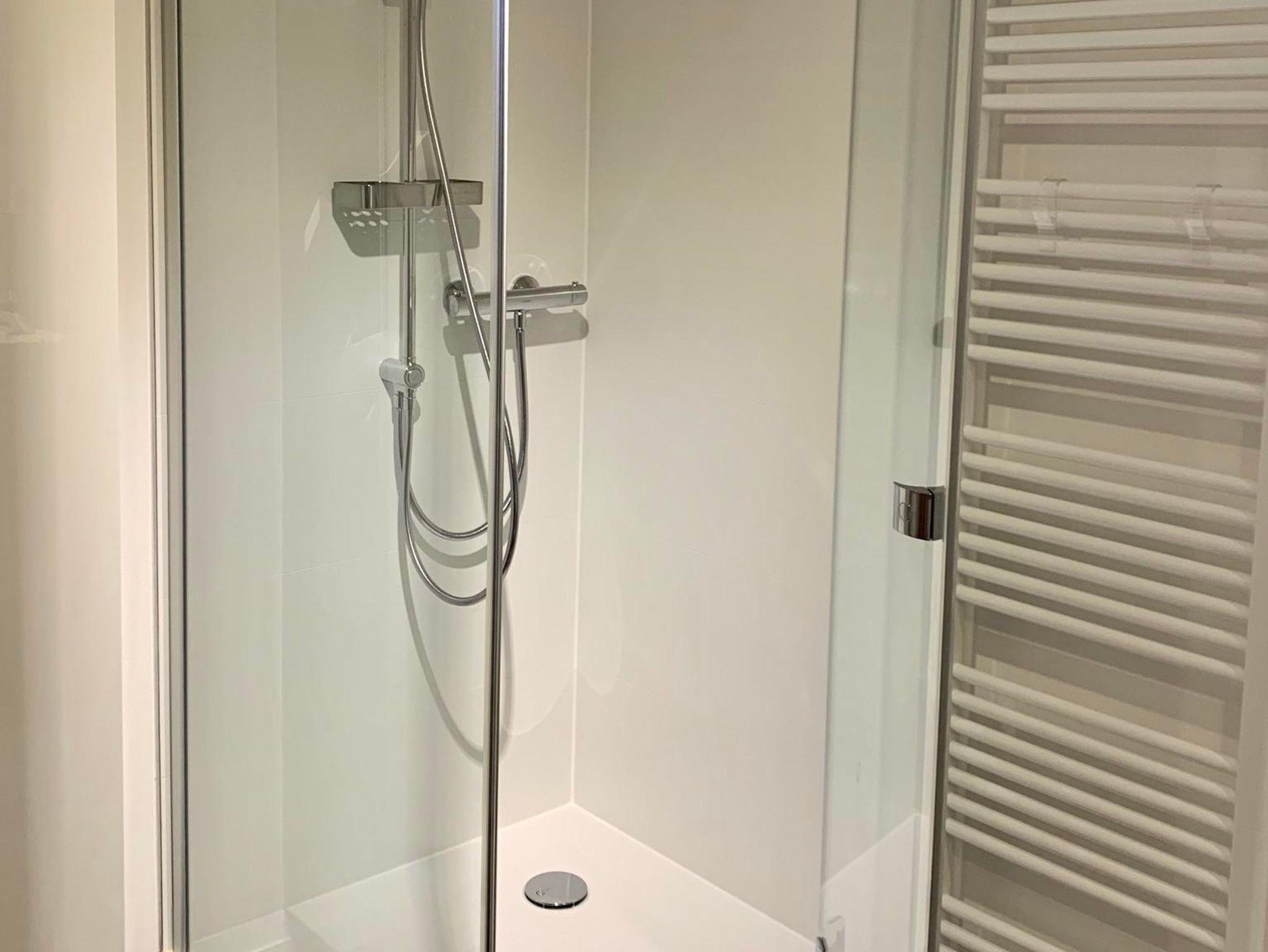 Das frisch renovierte Bad verfügt über ein Waschbecken, wandhängendes WC, Ganzglas-Dusche und Handtuchheizkörper. Im Schrank unter dem Waschbecken halten wir einen Haartrockner für Sie bereit. Handtücher in diversen Größen finden Sie im Badezimmerschrank.