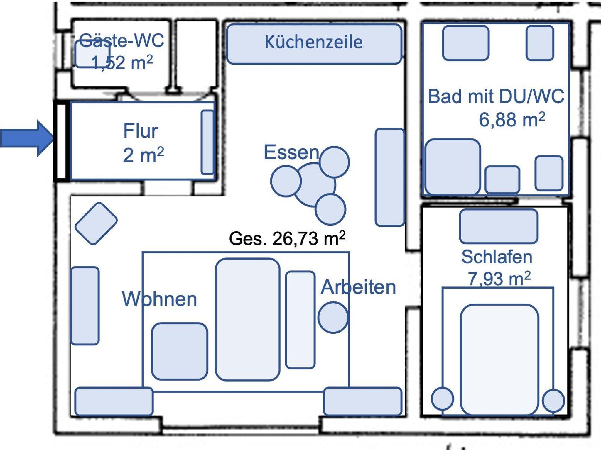 Hier finden Sie für Ihre Jacken eine Stand-Garderobe, Spiegel und Anrichte, Hausschuhe zum Indoor-Gebrauch, eine Abstellnische mit den gängigsten Putzutensilien, Bügelbrett, Wäschetrockner, Bügeleisen, Verbandstasche, Schuhablage für nasse Schuhe.