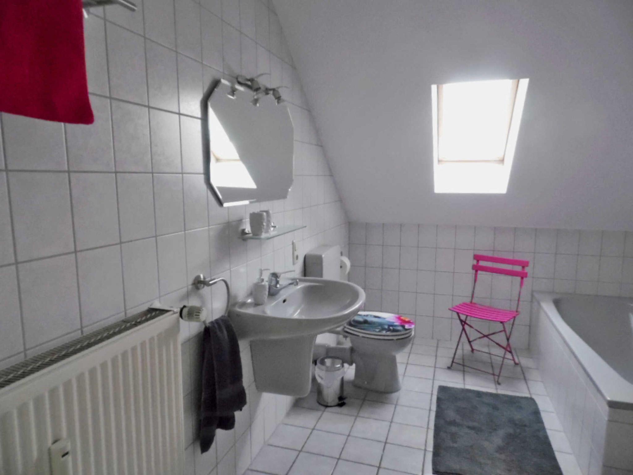 Das moderne Bad ist mit Dusche, Badewanne, WC und Waschtisch ausgestattet und verfügt über Tageslicht.