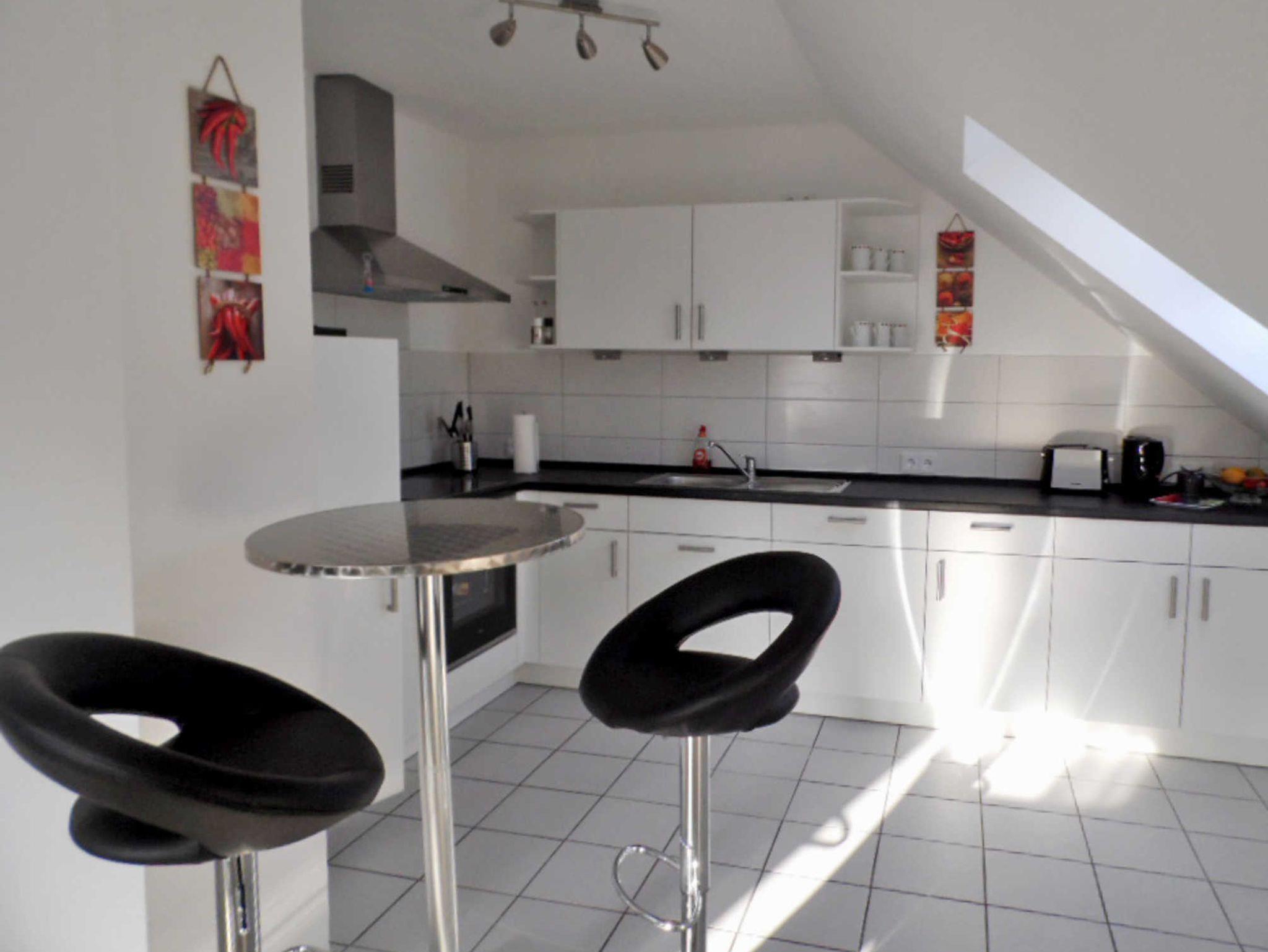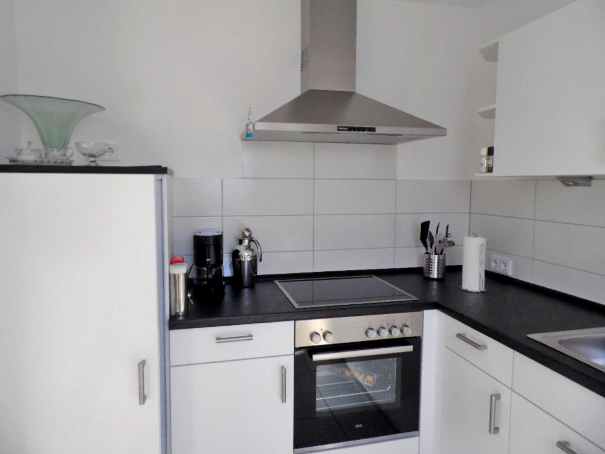 Die moderne Küchenzeile ist mit Backofen, Kühlschrank, Mikrowelle, Kaffeemaschine, Wasserkocher, Toaster, Spülmaschine, Geschirr und Besteck komplett ausgestattet.