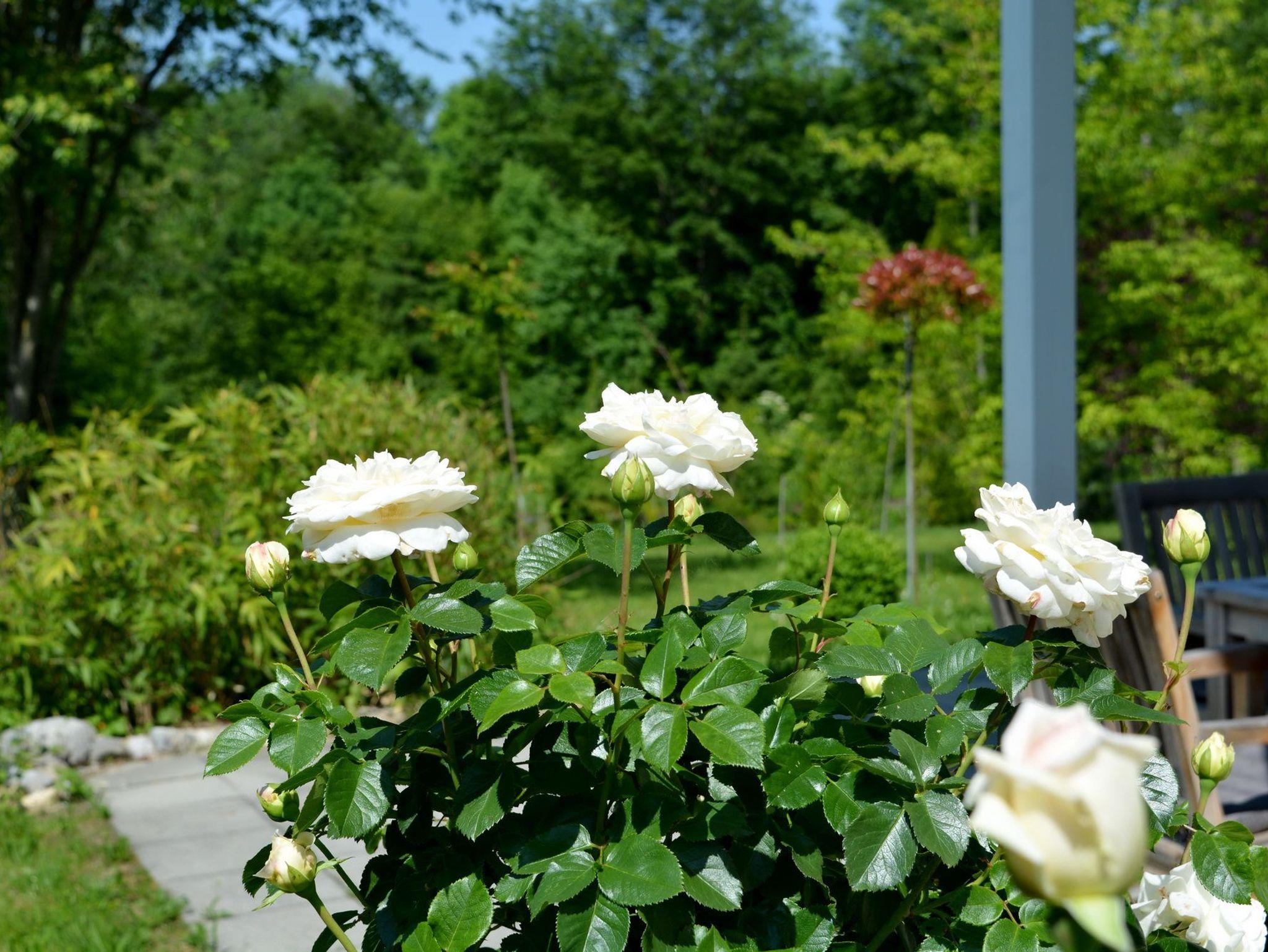 Der liebevoll angelegte großflächige Garten, der zu jeder Tageszeit und Witterung ein wunderbares Zusammenspiel von Natur, Licht und Ruhe bietet, lockt zum Relaxen ein. Ringsum begeistern großzügige Terrassen (Süd- und Westausrichtung) und Gartenwege mit angelegten Rabattbeeten und einem Kräutergarten. Hier werden Sie sicherlich viele schöne Stunden verbringen und gerne das Kochen nach draußen verlegen. Ein großer Grill steht hierfür zur Verfügung.