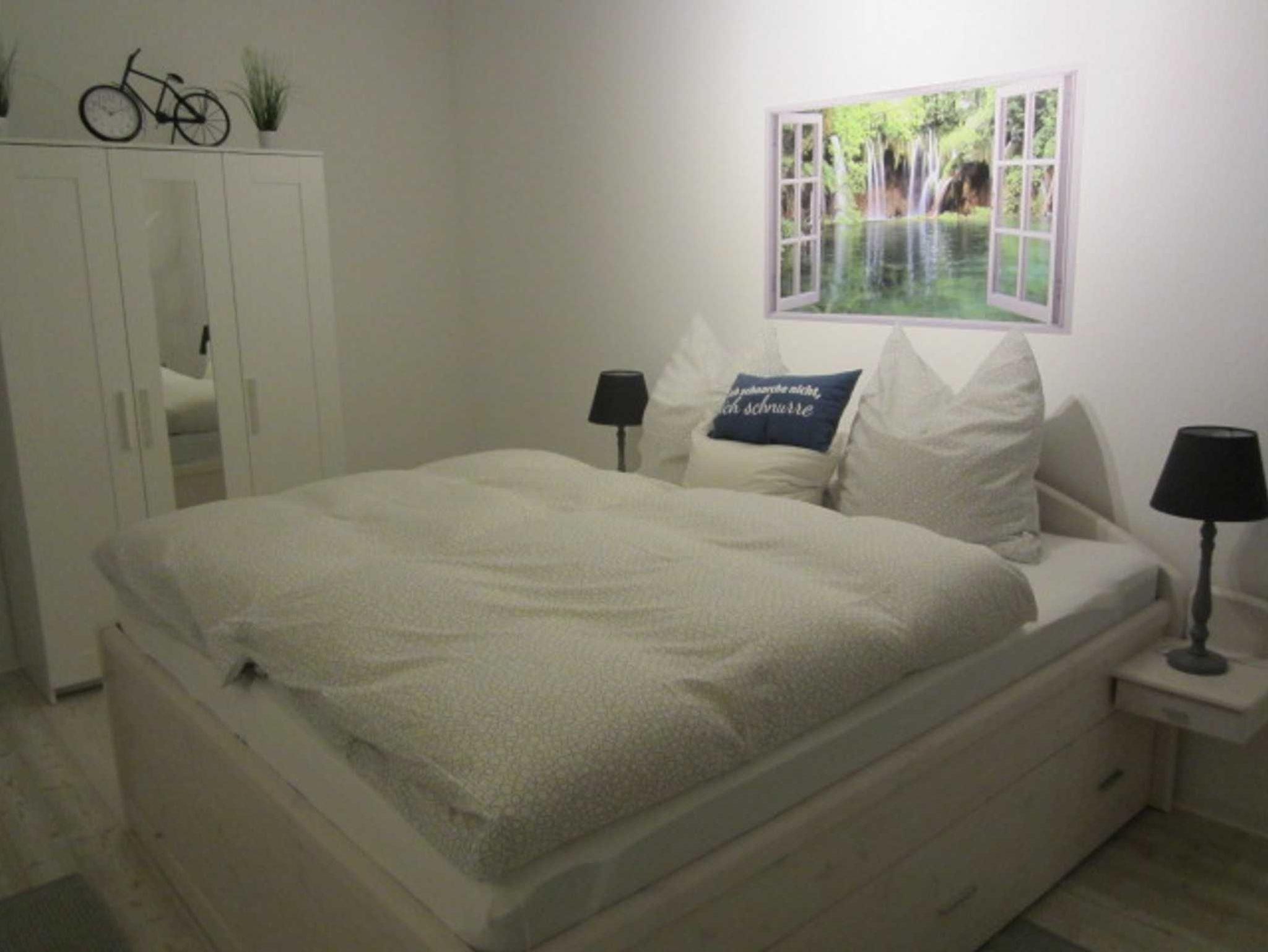 1 Schlafzimmer mit Doppelbett und Kleiderschrank