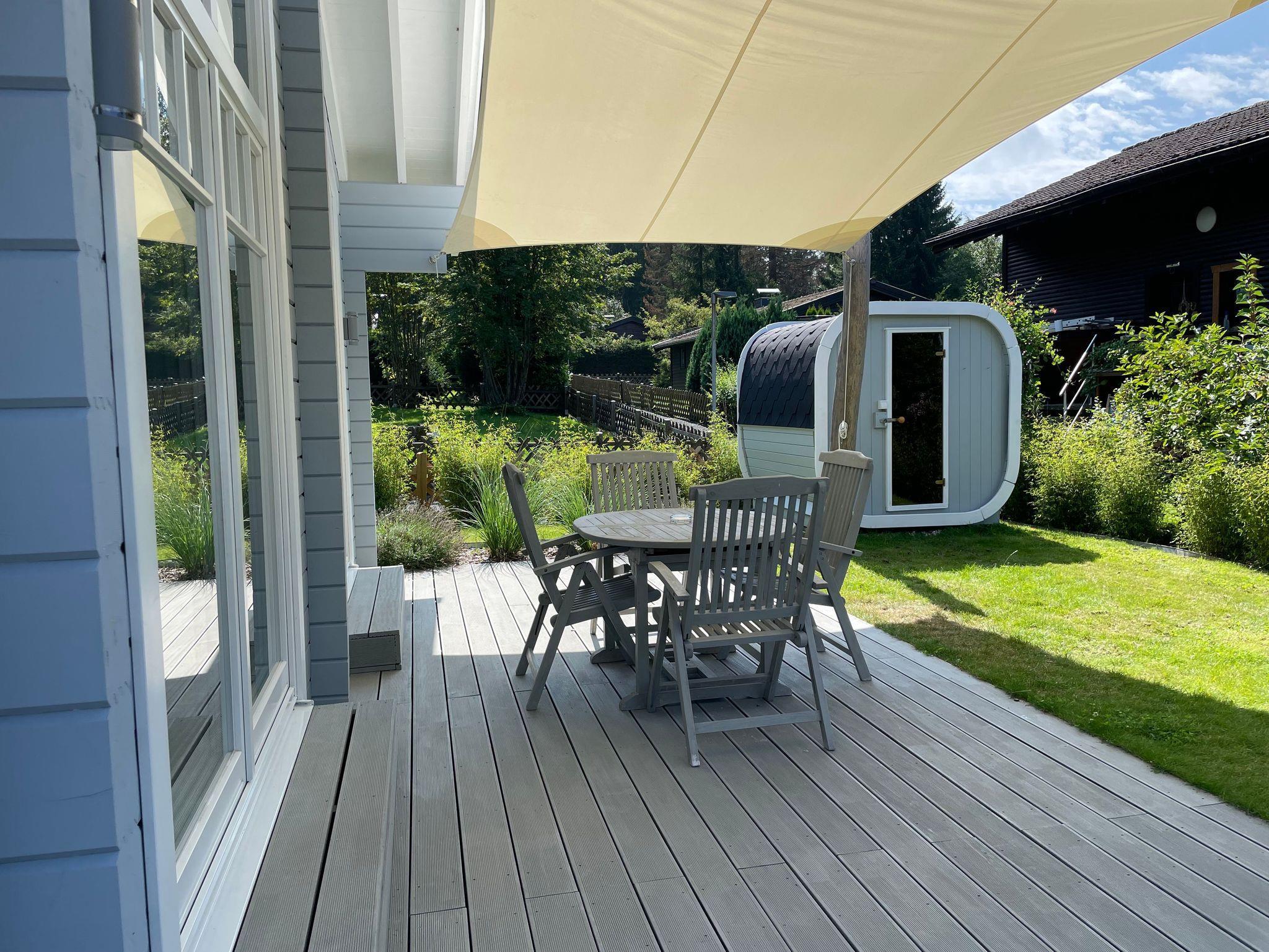 Das Haus verfügt über einen komfortablen Gaskamin und über eine Fasssauna im Garten.