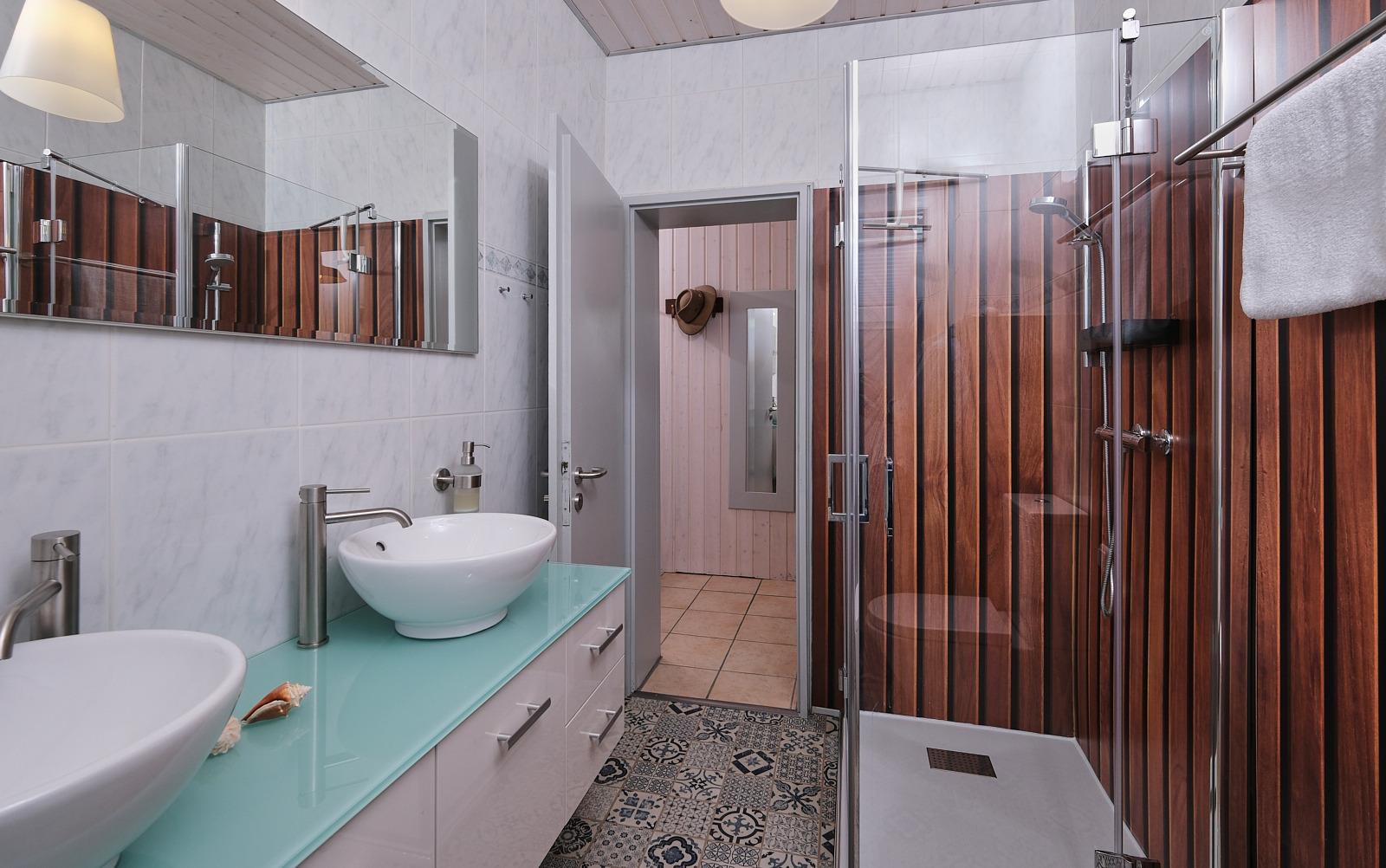 Das moderne Badezimmer lädt mit seiner großen Dusche und dem Doppelwaschbecken zum Entspannen ein – ideal nach einem aktiven Tag im Freien.