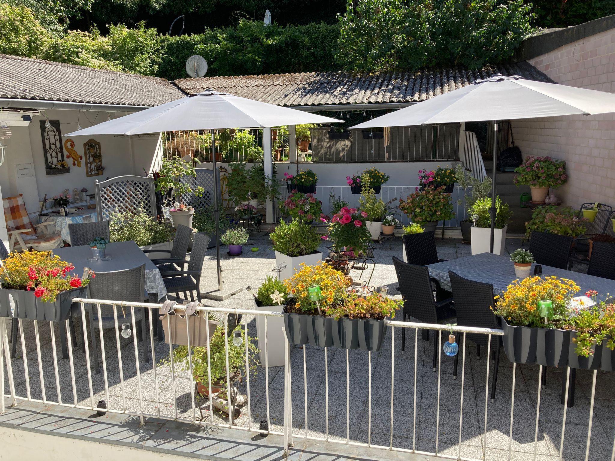 The large roof terrace, lushly planted and full of charm, is shared with the guests of our second holiday flat in summer - yet each flat has its own separate seating area for privacy.