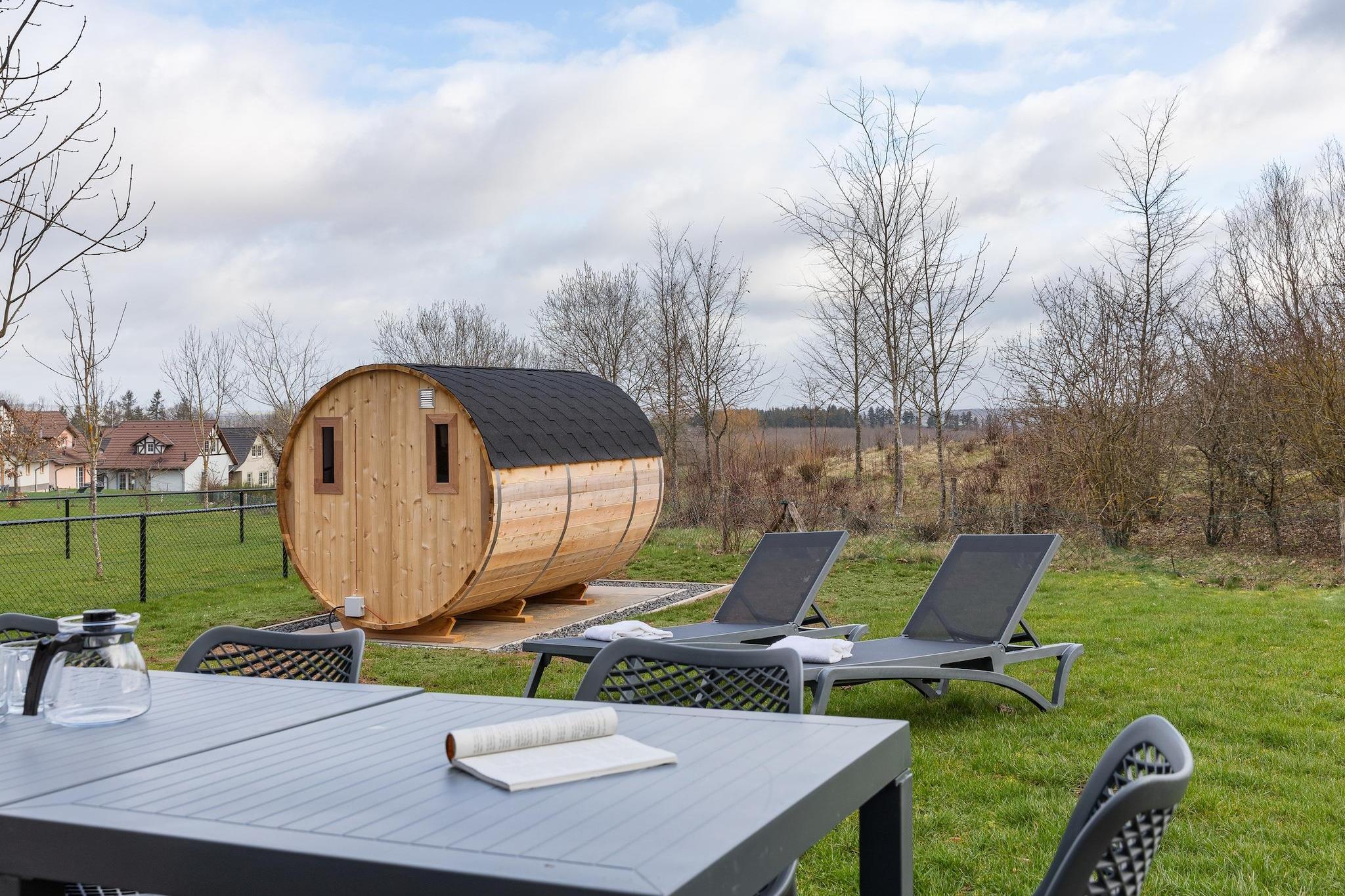 Ground floor: (hallway(toilet), Living room(TV(cable)), Kitchen(electric kettle, coffee machine(filter), combination microwave, dishwasher, fridge(+ freezer)), bedroom(double bed or 2 single beds), bathroom(bath tub, washbasin), storage) On the 1st floor: (bedroom(single bed, double bed or 2 single beds), bedroom(single bed, double bed or 2 single beds), bathroom(shower, washbasin), Landing(toilet)) sauna(private), garden doors, heating(central), terrace, garden, garden furniture, sun loungers, swimming pool(shared with other guests, roofed)