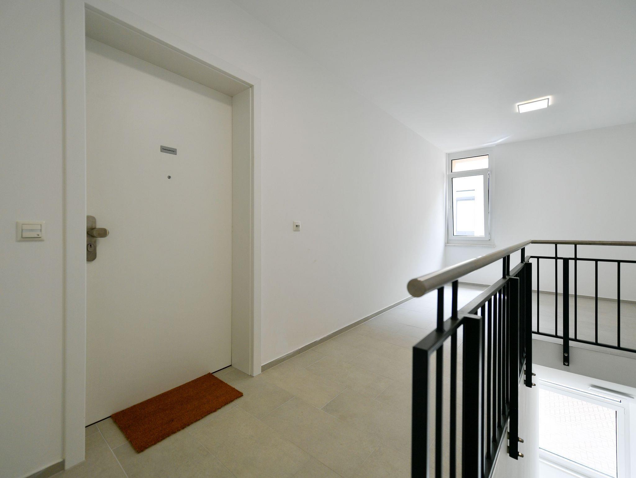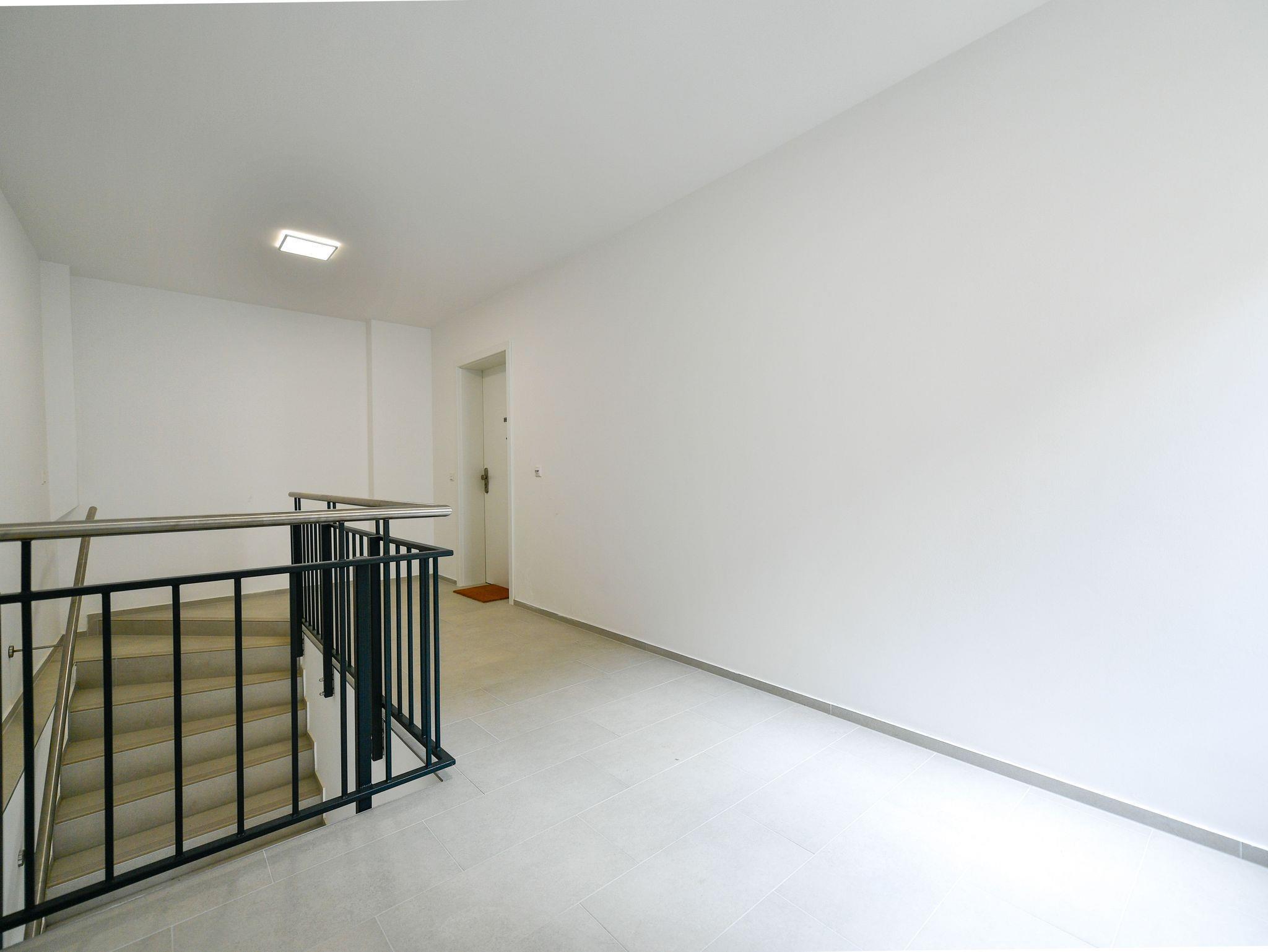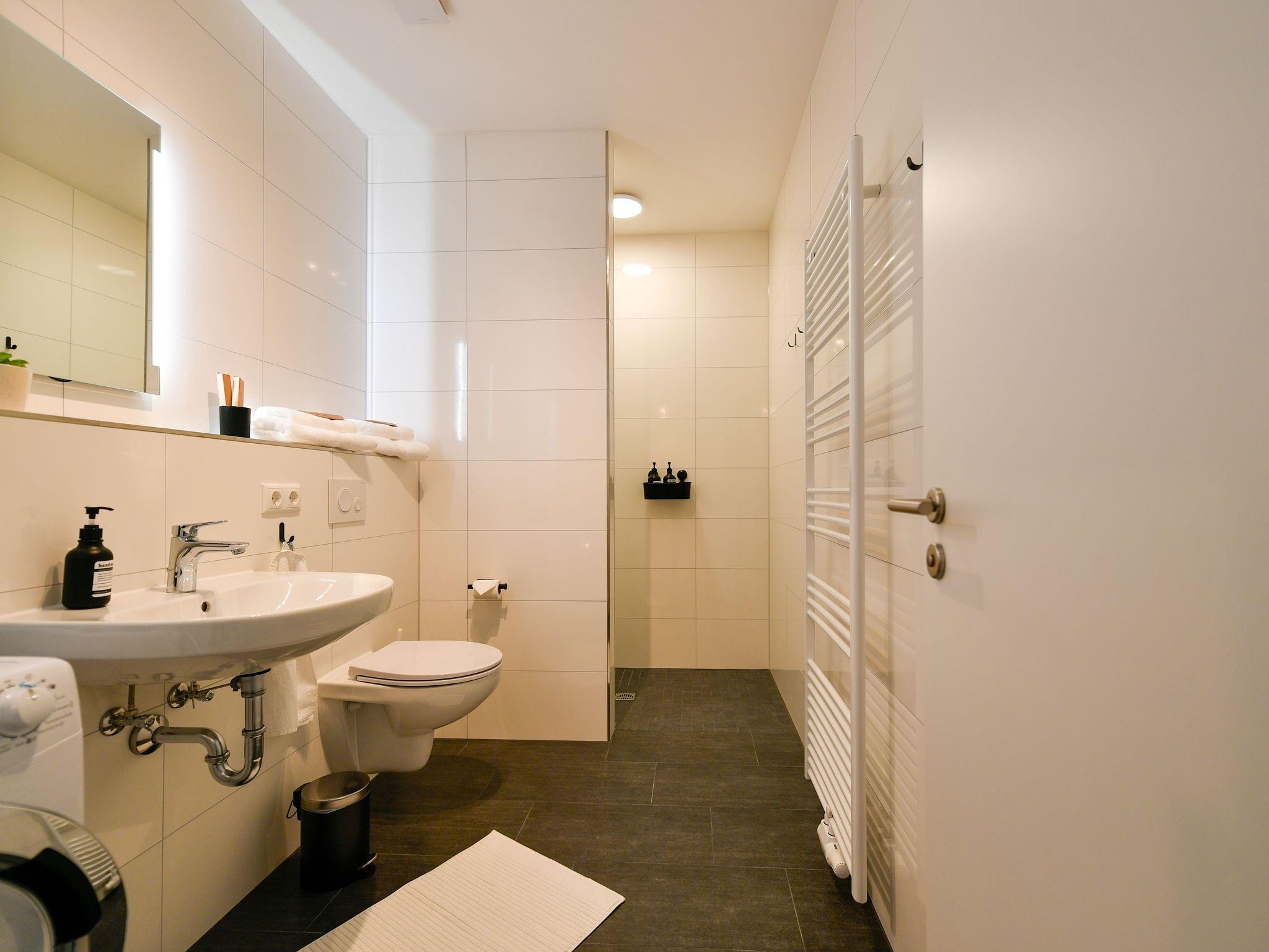Das moderne Bad verfügt über eine geräumige Dusche und einen Waschtrockner.