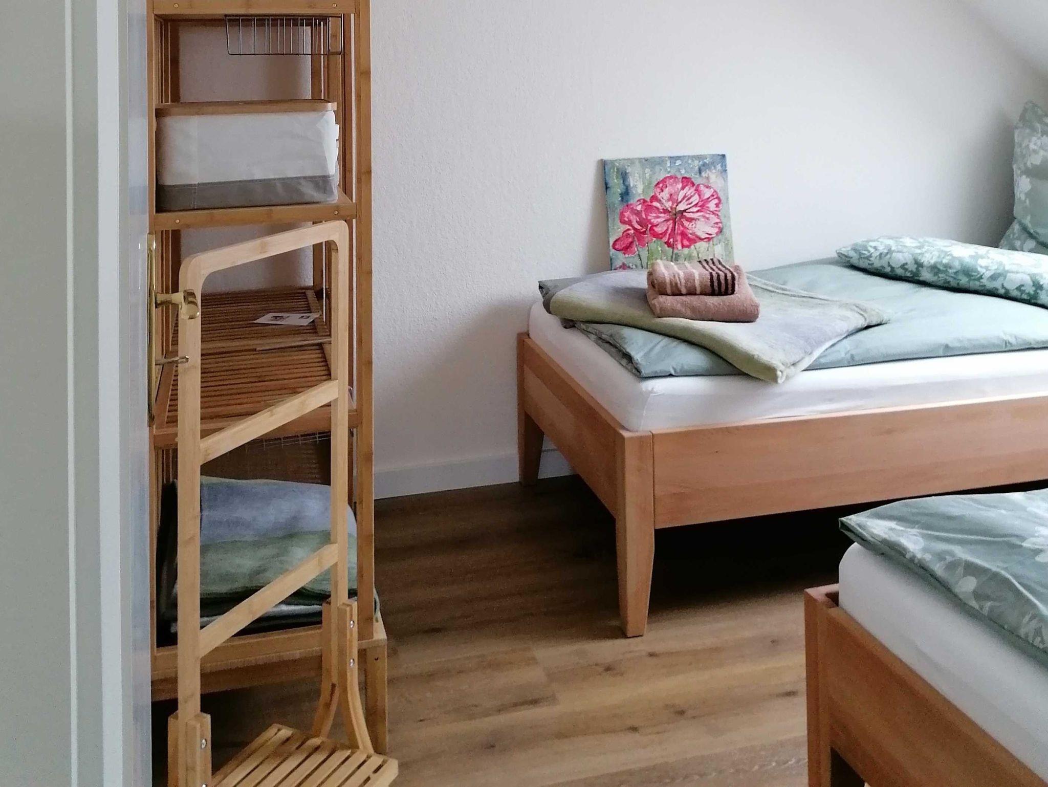 Unsere 74 m² Nichtraucher-Ferienwohnung befindet sich in der ersten Etage unseres Hauses und hat 1 Wohnzimmer, 1 Küche und 2 Schlafzimmer (SZ 1 mit einem Doppelbett und SZ 2 mit 2 Einzelbetten, sowie ein Badezimmer mit Dusche und WC..
