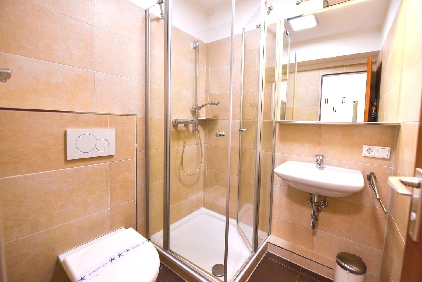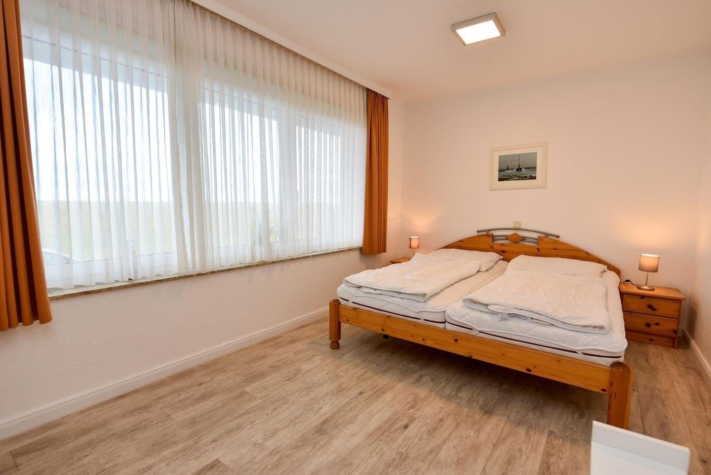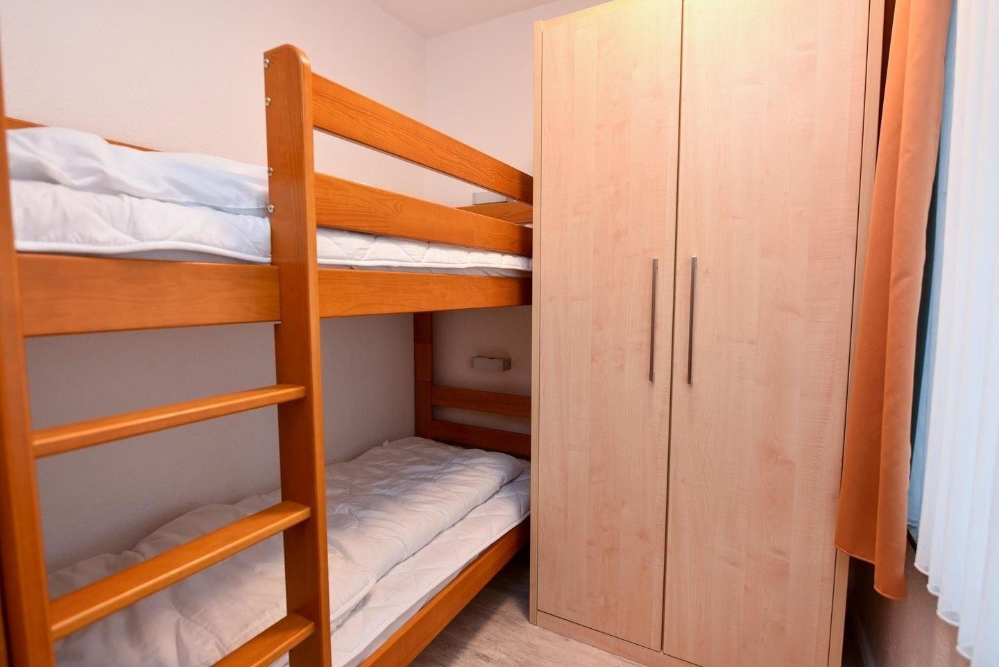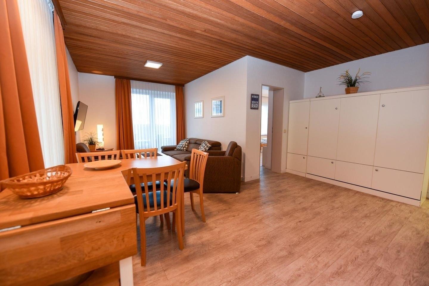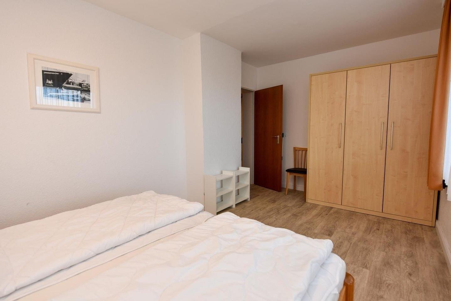 3-Zimmer Appartement im Haus "Nige Wark", bestehend aus einem Kinderzimmer mit Etagenbett, einem Schlafzimmer mit Doppelbett und einem Wohnzimmer in welchen sich zusätzlich noch ein Schrankbett befindet (2x90x200). Im Wohnraum befindet sich zudem eine Couch, zwei Sesseln, ein Flat- TV sowie eine integrierte Küchenzeile die u.a. mit Spülmaschine, Mikrowelle und Kühlschrank mit Gefrierfach ausgestattet ist. Der ausziehbare Esstisch bietet genügend Platz für die ganze Familie. Badezimmer mit einer Dusche und WC. Größe ca. 50qm. Die Wohnung liegt im Erdgeschoß und hat eine Terrasse zur Seeseite.