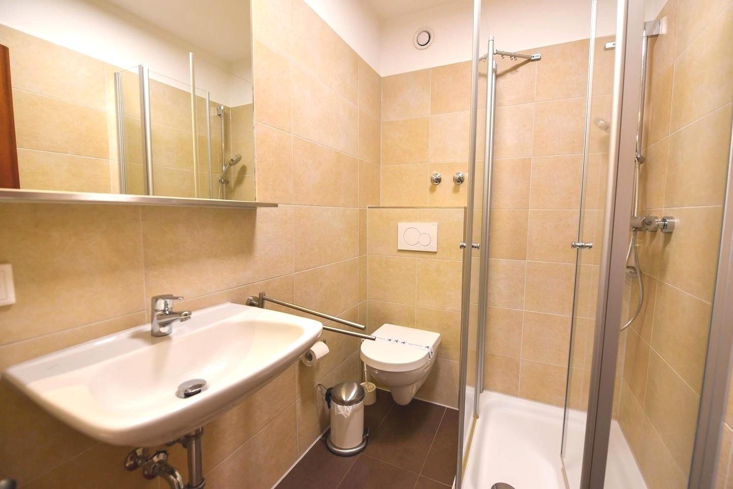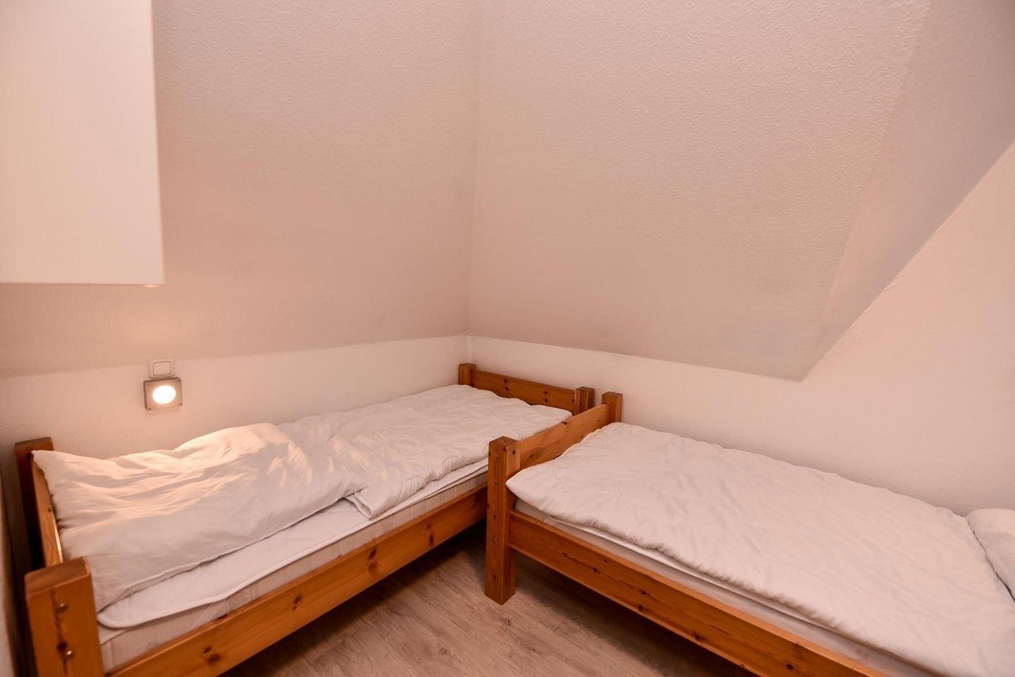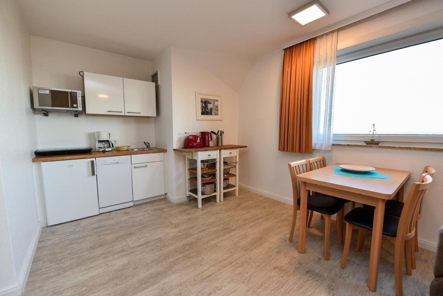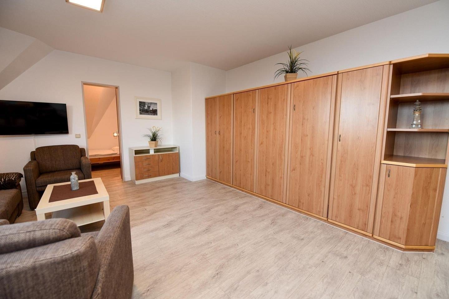 2-Zimmer Appartement im Haus "Nige Wark", bestehend aus einem Schlafzimmer mit zwei Einzelbetten und einem Wohnzimmer. Im Wohnzimmer befindet sich ein gemütliches Zweisitzer-Sofa mit zwei Sesseln und ein Flat- TV sowie die integrierte Küchenzeile mit Spülmaschine, Mikrowelle und Kühlschrank mit Gefrierfach. Der ausziehbare Esstisch bietet genügend Platz für alle. Zusätzlich verfügt das Appartement über ein Schrankbett. Das Badezimmer ist mit einer Dusche und WC ausgestattet.