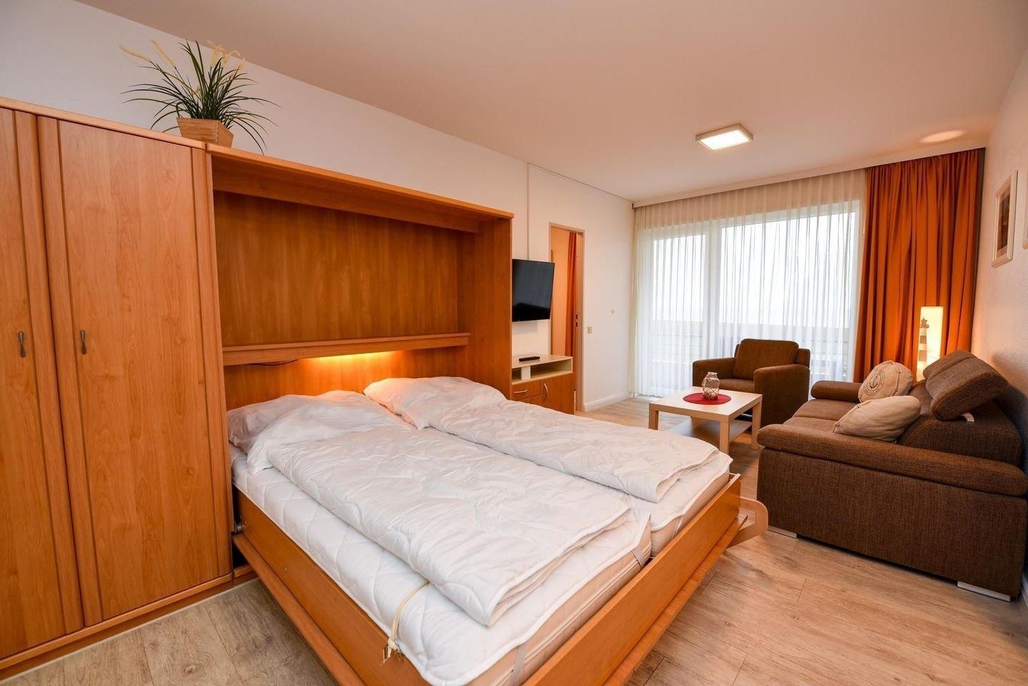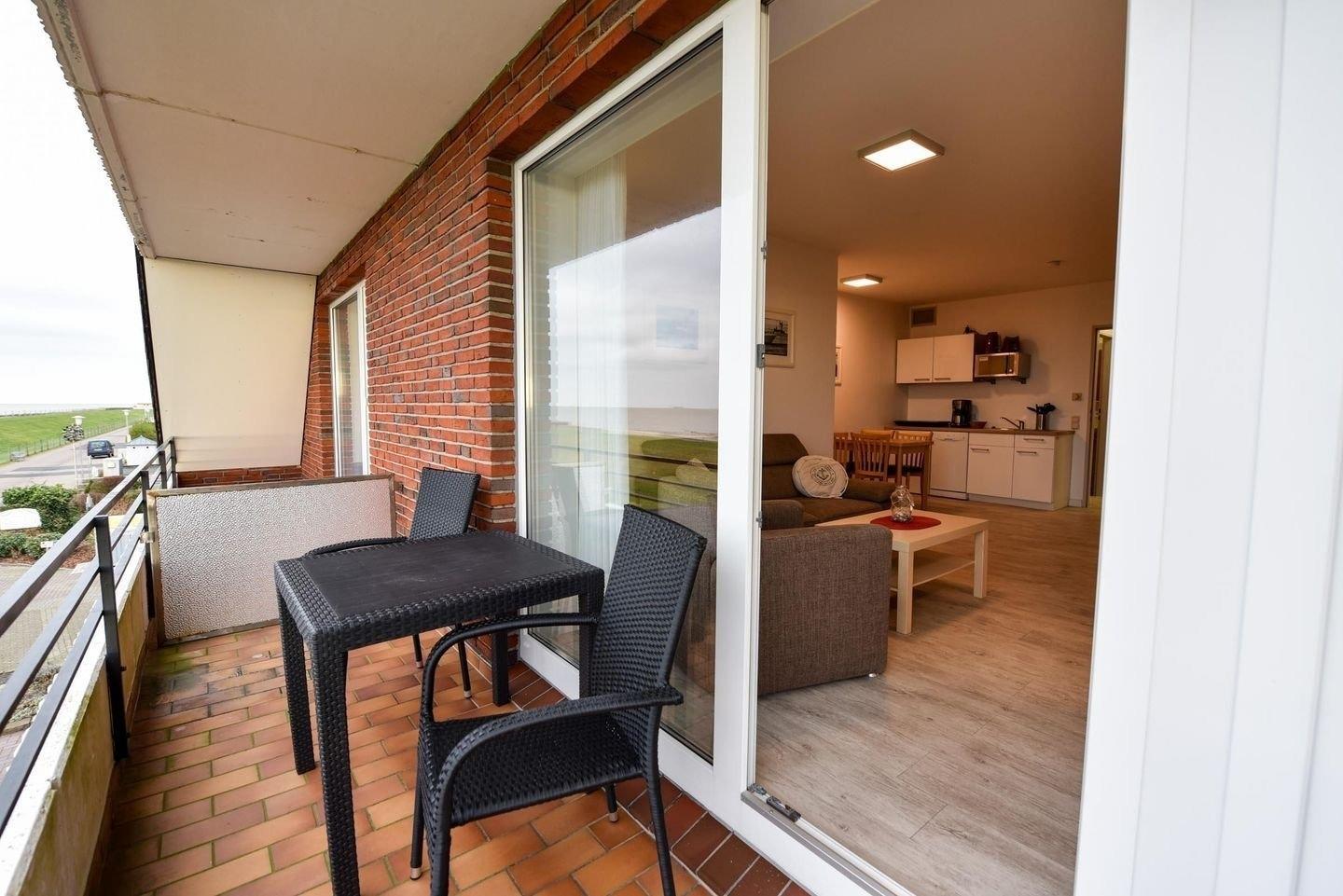 2-Zimmer Appartement im Haus "Nige Wark". Vom Etagenbett im Kinderzimmer, sowie aus der TV und Leseecke haben Sie einen wunderbaren Blick auf das UNESCO-Weltnaturerbe Wattenmeer und die Insel Neuwerk. Im Wohnzimmer befindet sich ein gemütliches Zweisitzer-Sofa, ein Sessel, ein Schrankbett (2x90x200) und ein Flat- TV sowie die integrierte Küchenzeile mit Spülmaschine, Mikrowelle und Kühlschrank mit Gefrierfach. Der ausziehbare Esstisch bietet genügend Platz für alle. Das Badezimmer ist mit einer Dusche und WC ausgestattet. Die ca. 35 qm große Wohnung liegt im 1. OG und verfügt zudem auch über einen Balkon.