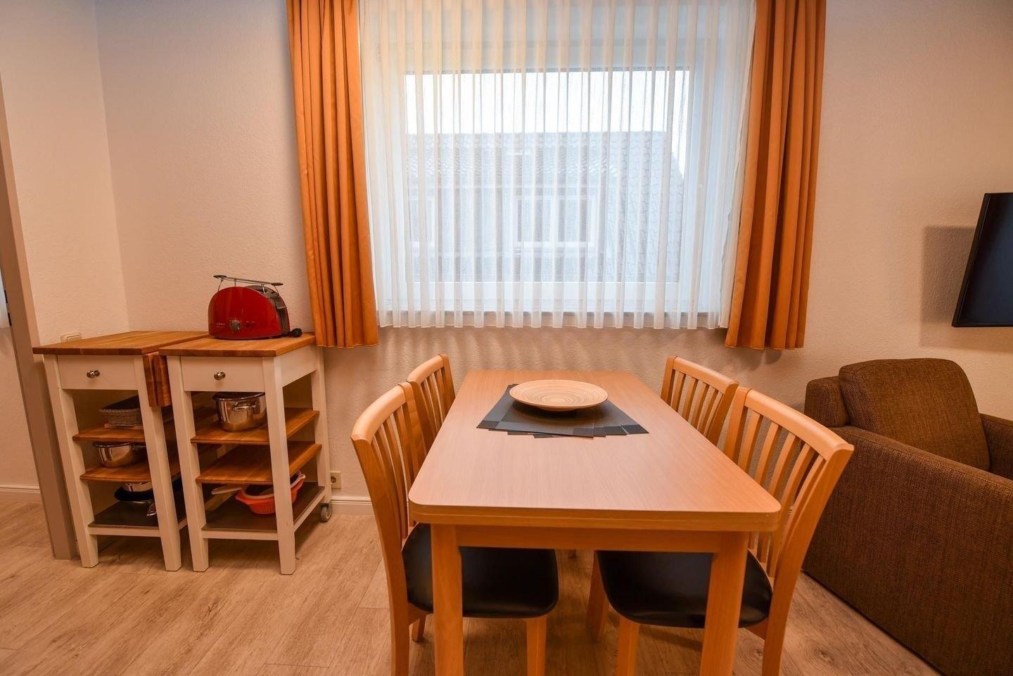 2-Zimmer Appartement im Haus "Nige Wark". Im Wohnzimmer, von welchem aus Sie eine herrliche Sicht auf das UNESCO-Weltnaturerbe Wattenmeer haben, befindet sich ein gemütliches Zweisitzer-Sofa, zwei Sessel, ein Schrankbett (2x90x200) und ein Flat- TV sowie die integrierte Küchenzeile mit Spülmaschine, Mikrowelle und Kühlschrank mit Gefrierfach. Der ausziehbare Esstisch bietet genügend Platz für alle. Im Kinderzimmer befindet sich ein Etagenbett. Das Badezimmer ist mit einer Dusche und WC ausgestattet. Die ca. 37 qm große Wohnung liegt im 1. OG und verfügt zudem auch über einen Balkon.