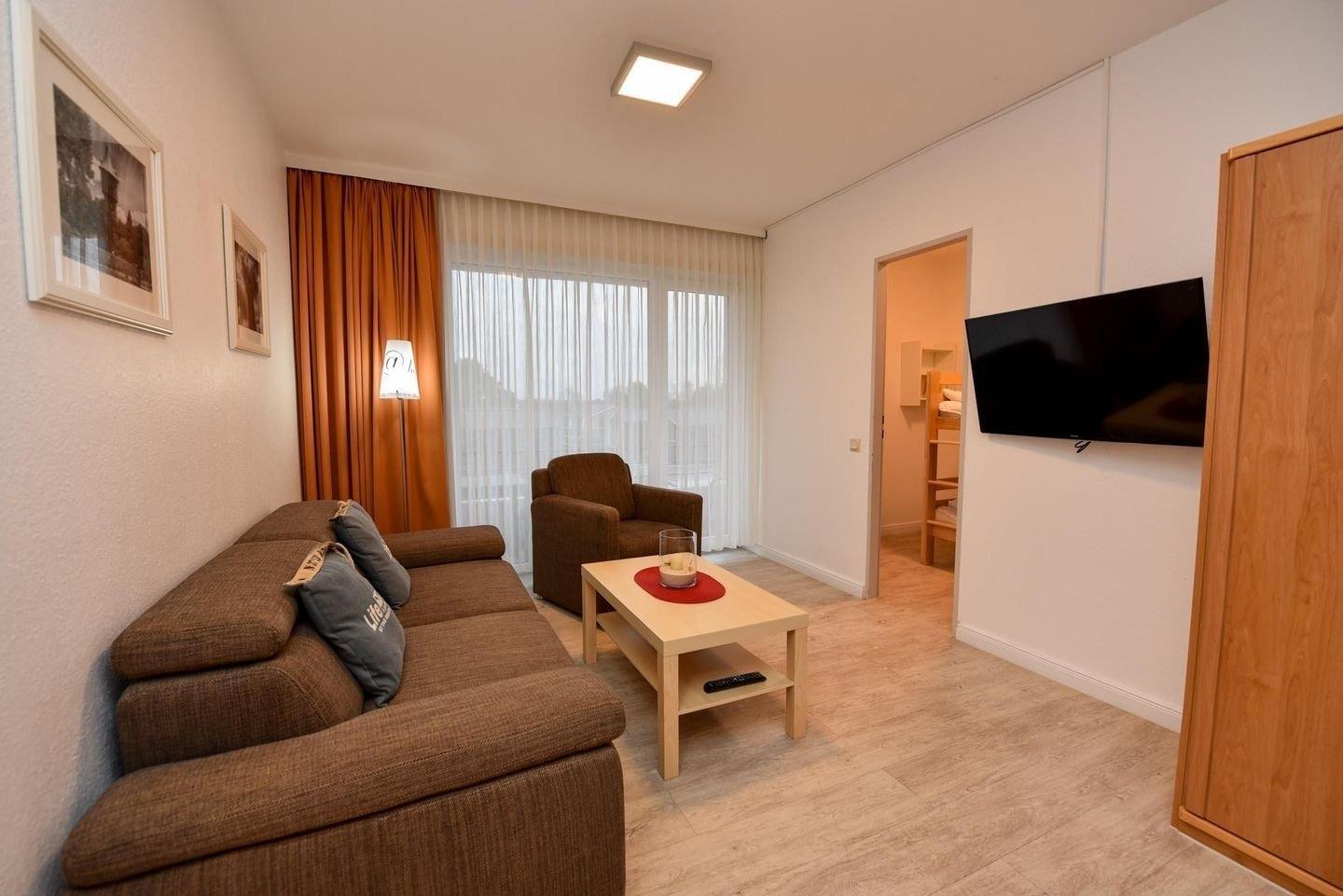 2-Zimmer Appartement im Haus "Nige Wark". Im Wohnzimmer befindet sich ein gemütliches Zweisitzer-Sofa, ein Sessel und ein Flat-TV. Die integrierte Küchenzeile mit Spülmaschine, Mikrowelle und Kühlschrank mit Gefrierfach ist komplett ausgestattet und der ausziehbare Esstisch bietet genügend Platz für alle. Im Wohn-/Schlafraum befindet sich zusätzlich noch ein ein Schrankbett (2x90x200). Im Schlaf-/Kinderzimmer steht ein Etagenbett. Das Badezimmer ist mit einer Dusche und WC ausgestattet. Die ca. 35 qm große Wohnung liegt im 1. OG und verfügt zudem auch über einen Balkon zum Garten