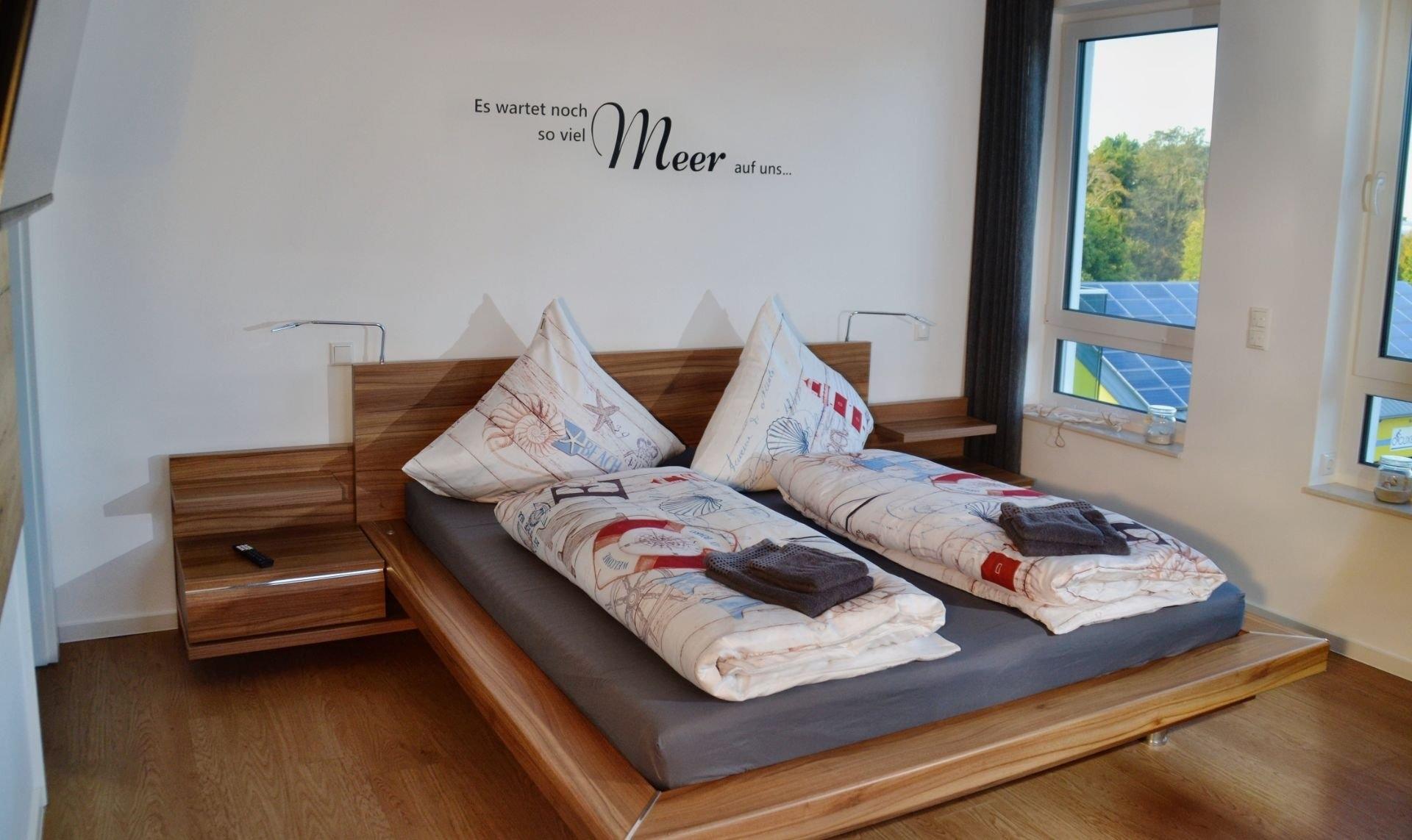 Die Abende sind in den beiden elegant eingerichteten Schlafzimmern, ausgestattet mit komfortablen Doppelbetten und Smart-TVs, eine Zeit der Ruhe. Elektronische Außenrollos sorgen für ungestörte Nachtruhe und ergänzen den Komfort dieses exklusiven Rückzugsortes.