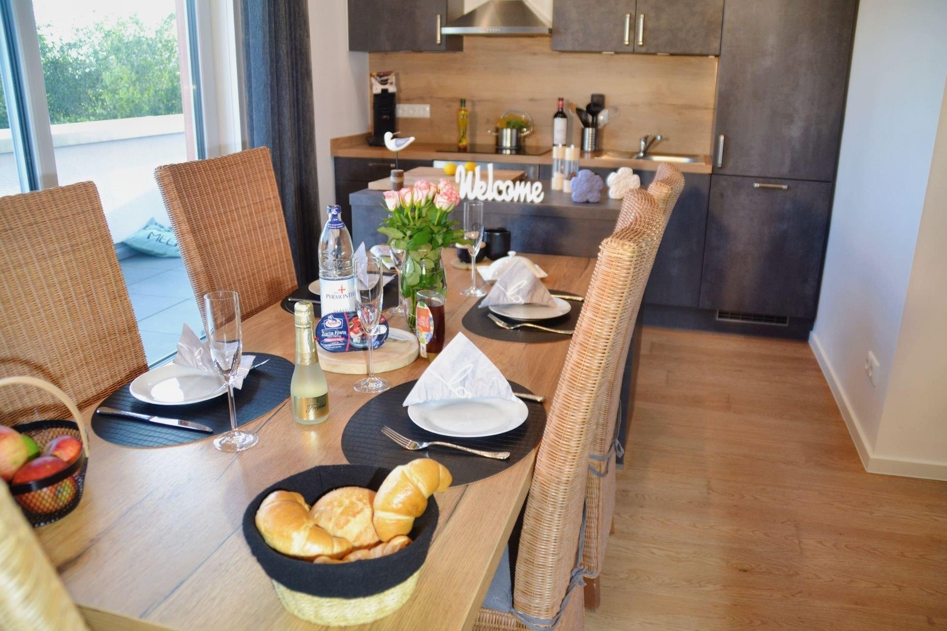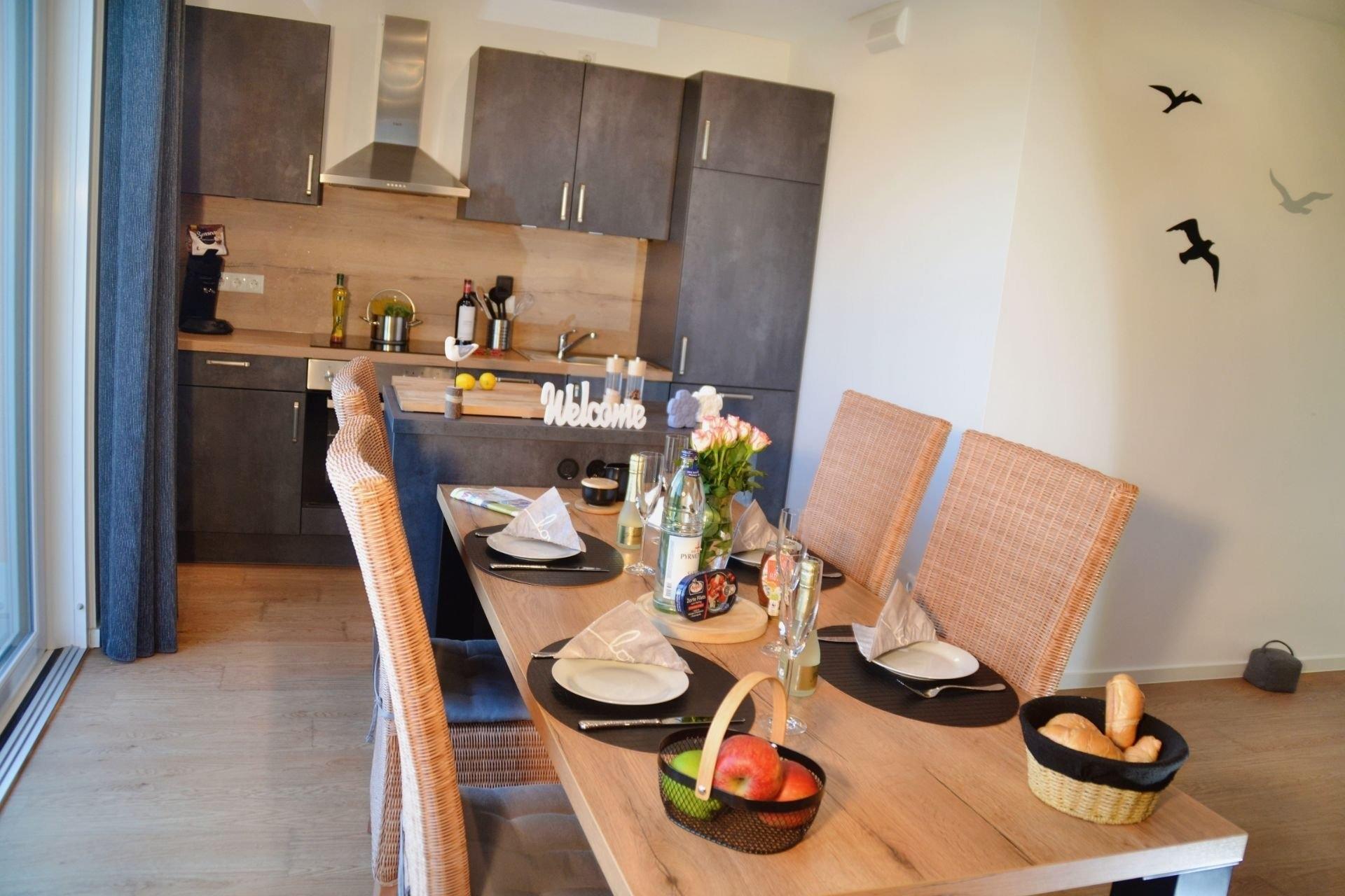 Auf einer großen Terrasse können Sie den Abend ausklingen lassen, während die Sonne so langsam untergeht. Genießen Sie ein Glas Wein, spielen Sie zusammen Spiele und lassen Sie sich Ihr selbst gekochtes Essen schmecken. Über eine Fensterfront gelangen Sie in den offenen Wohn- und Essbereich, wo Sie gemeinsam in der vollausgestatteten Küchenzeile kochen können. Wird es draußen zu kalt, wenn eine frische Nordseebrise aufzieht, können Sie den restlichen Abend auf dem Sofa genießen.