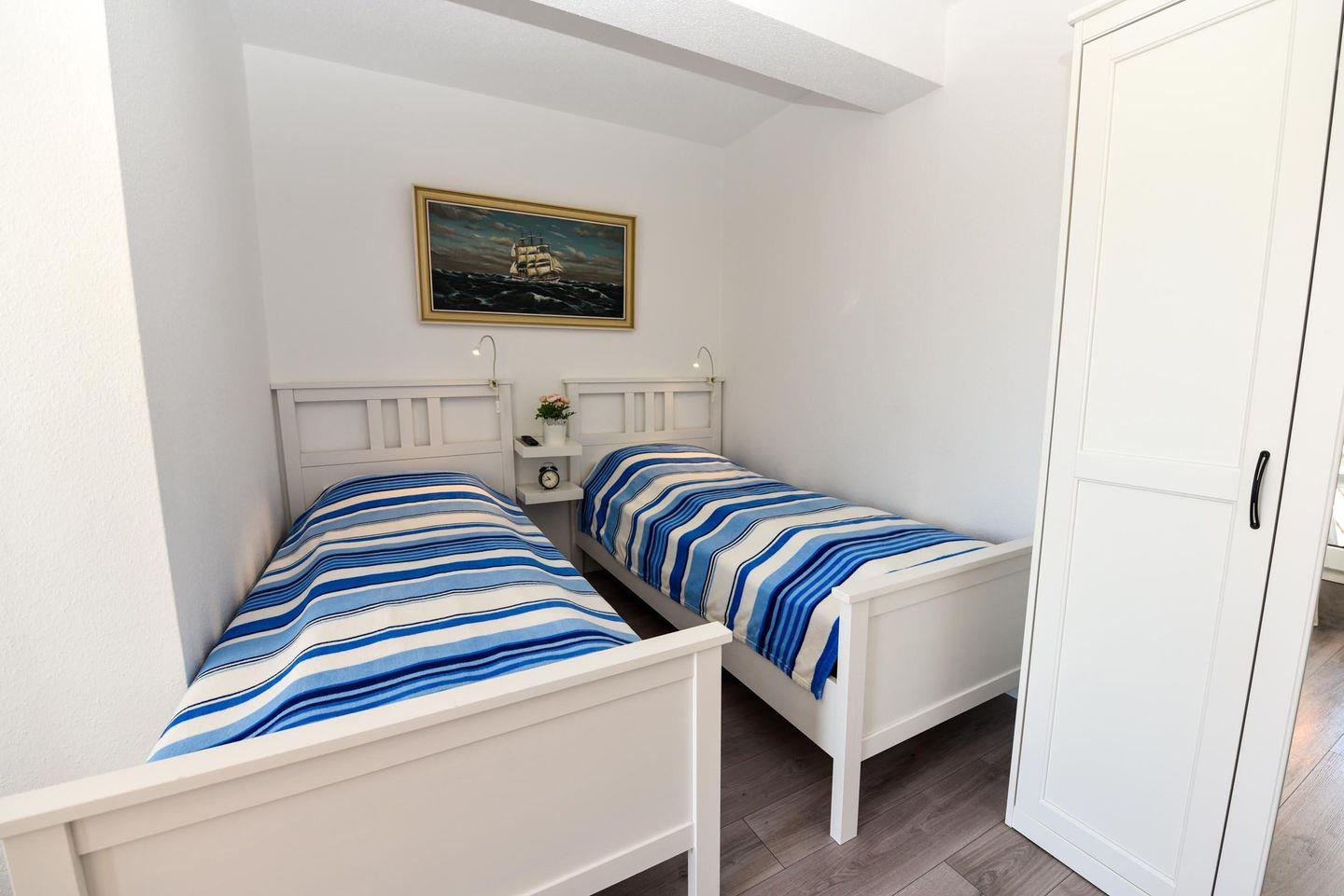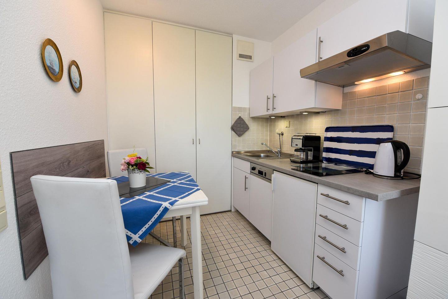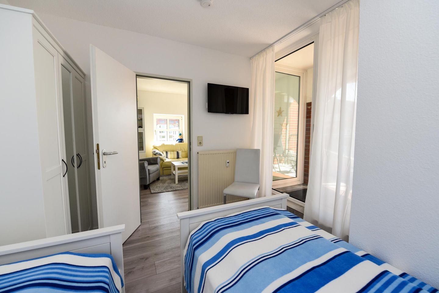 2-Zimmer "Klassik Appartement" mit WLAN im 3.OG im Haus DEICHGRAF. 1 Wohn-/Essraum mit Schlafcouch und einem Sessel, Couchtisch und SAT-TV. Im Essraum offene Küchenzeile mit Geschirrspülautomat. Esstisch mit drei Stühlen. Der große Schlafraum (mit TV) bietet zwei Einzelbetten und noch Platz für ein Kinderreisebett. Beide Räume liegen zur Südseite. Dusch-Wannenbad-/WC., kleiner Balkon und kostenloser PKW-Stellplatz.