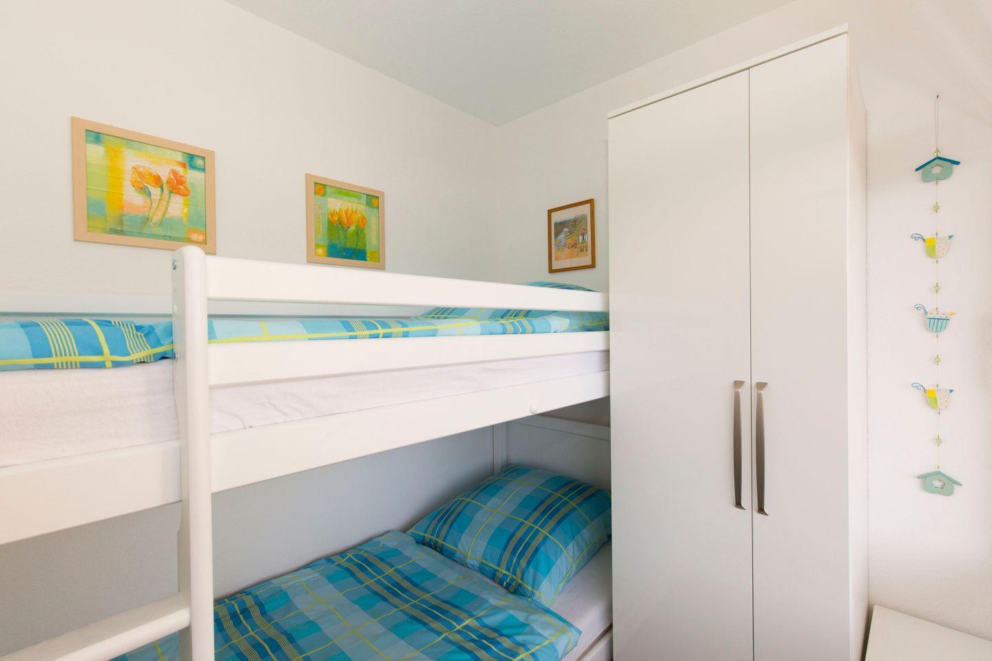 Haus "Lord Nelson", Typ 2, App.-Nr. 616, bis 4 Pers., ca. 40 qm, Weltschifffahrtsweg, seitlicher Meerblick/Richtung Kugelbake, Wohnbereich mit Schrankbett, Kinderzimmer mit Etagenbett, Dusche/WC/Föhn, Küchenzeile mit 4-Platten Ceranfeld, Geschirrspüler und Mikrowelle, Balkon, Kabel-TV, kostenl. W-Lan Zugang im App., Tiefgaragenstellplatz, Nichtraucherappartement, keine Haustiere erlaubt, Strandkorb im Sommer 2026.