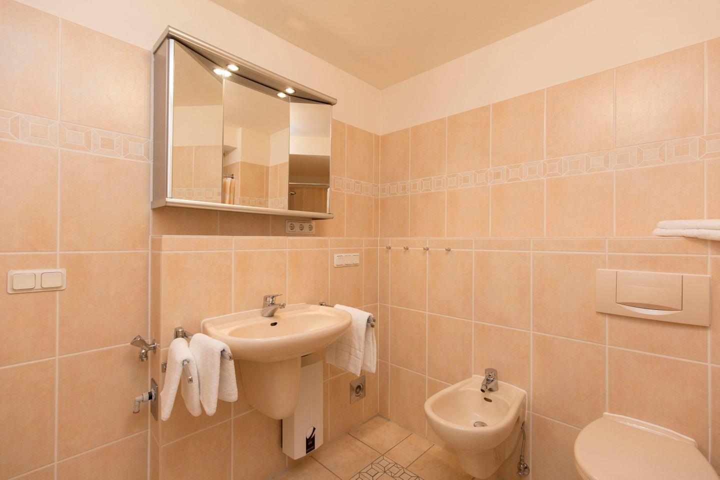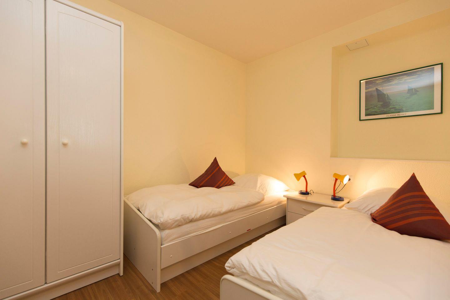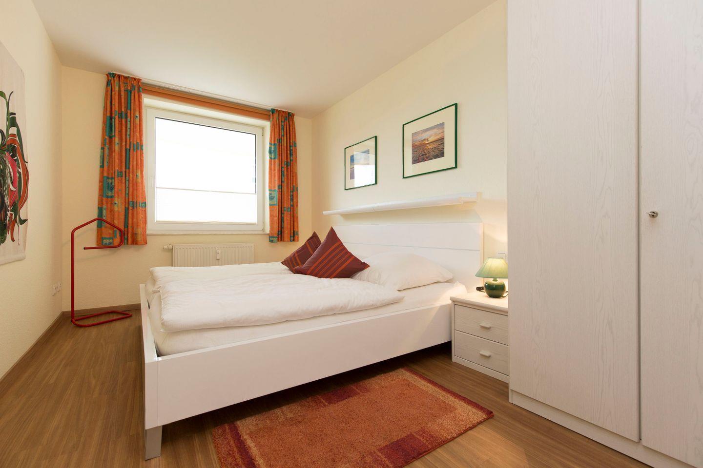 Haus "Kurpark-Residenz", Typ D2, Appartement-Nr. "135", bis 5 Personen, 1. OG, Südseite (Parkseite), ca. 69 m² Wohnungsgröße, Wohnzimmer mit Schlafcouch, separates Schlafzimmer mit Doppelbett, separates Schlafzimmer (innenliegend) mit Einzelbetten, Dusche/WC und Bidet, Küchenzeile mit Mikrowelle, Backofen und Geschirrspüler, Raucher App., Balkon, Smart-TV, Haustiere willkommen, Tiefgaragenstellplatz, Strandkorb im Sommer 2026.